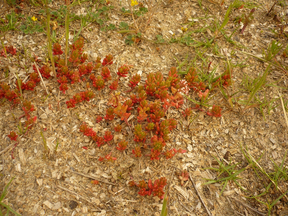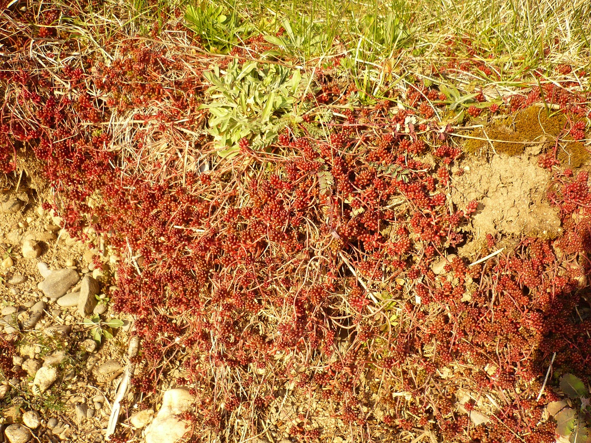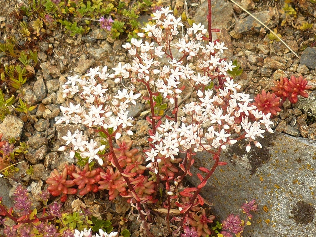 Ch – 0,5-1,5 dm – Feuilles charnues subovoïdes ± rouges, d'environ 5 mm de long – Inflorescence ± dense de fleurs de Ø ≃ 5 mm, à 5 pétales obtus blancs – Carpelles acuminés