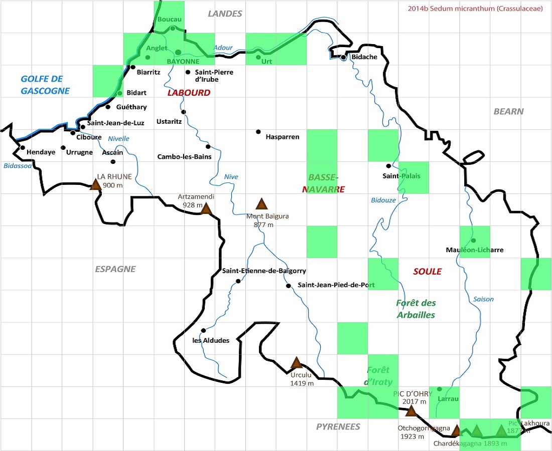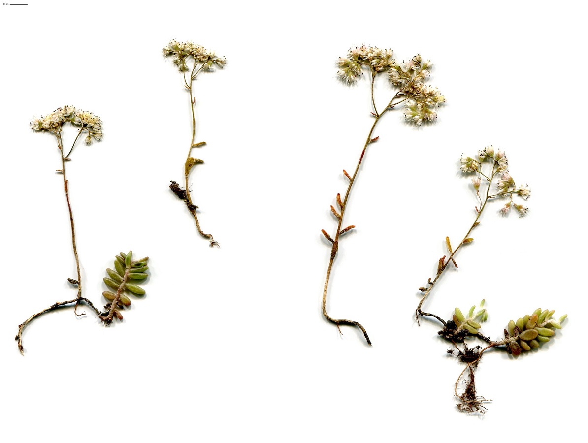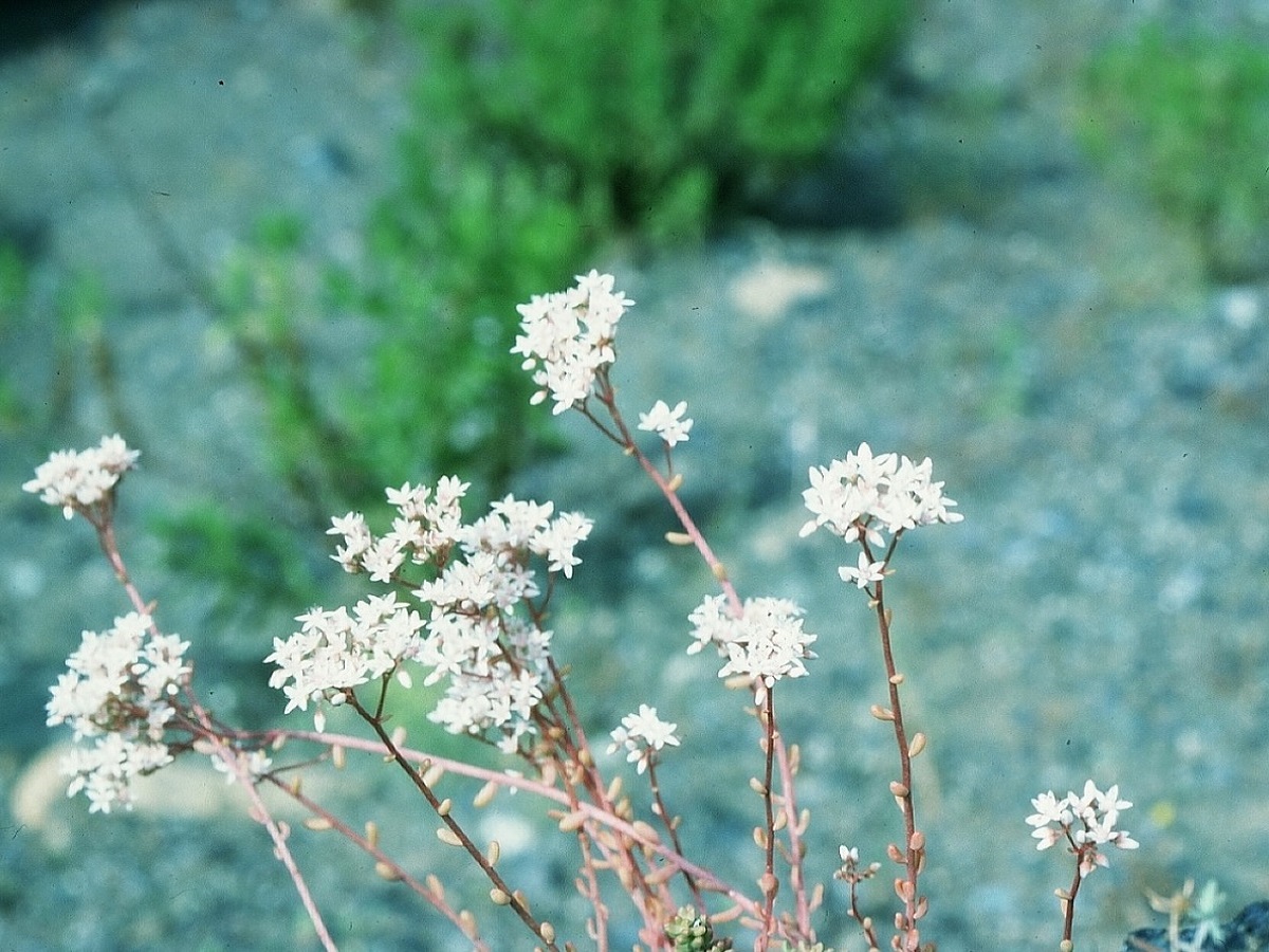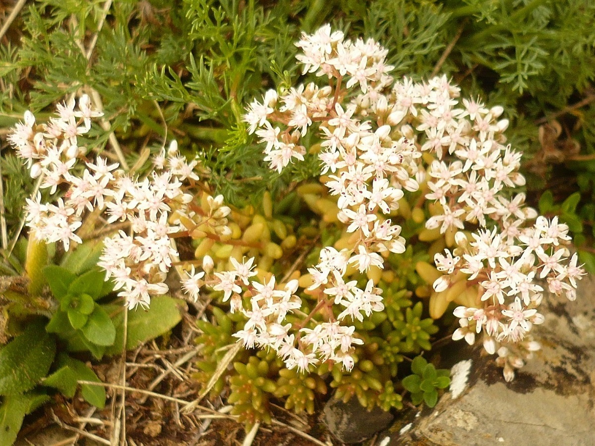 Ch – 0,5-1,5 dm – Feuilles charnues subovoïdes ± rouges, d'environ 5 mm de long – Inflorescence ± dense de fleurs de Ø ≃ 5 mm, à 5 pétales obtus blancs – Carpelles acuminés