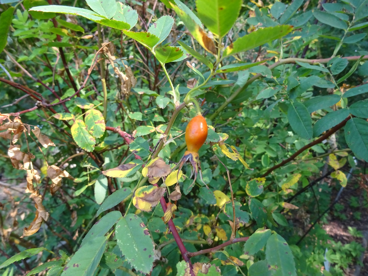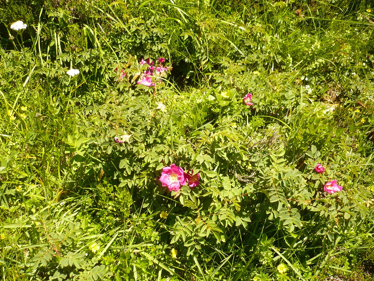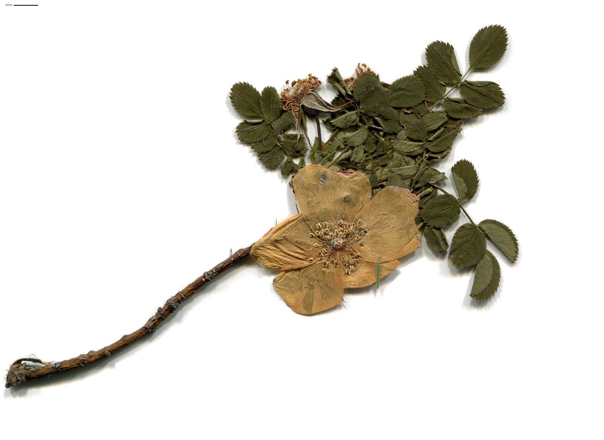 NPh – 5-20 dm – Aiguillons rares, droits, feuilles à 7-9 folioles glabres – Fleurs de Ø 3-8 cm, à 5 pétales rouges émarginés, sépales ± entiers – ’’Fruit’’ rouge pendant ovoïde glanduleux