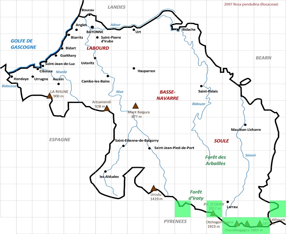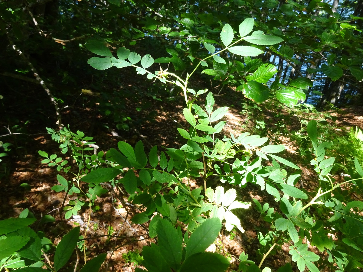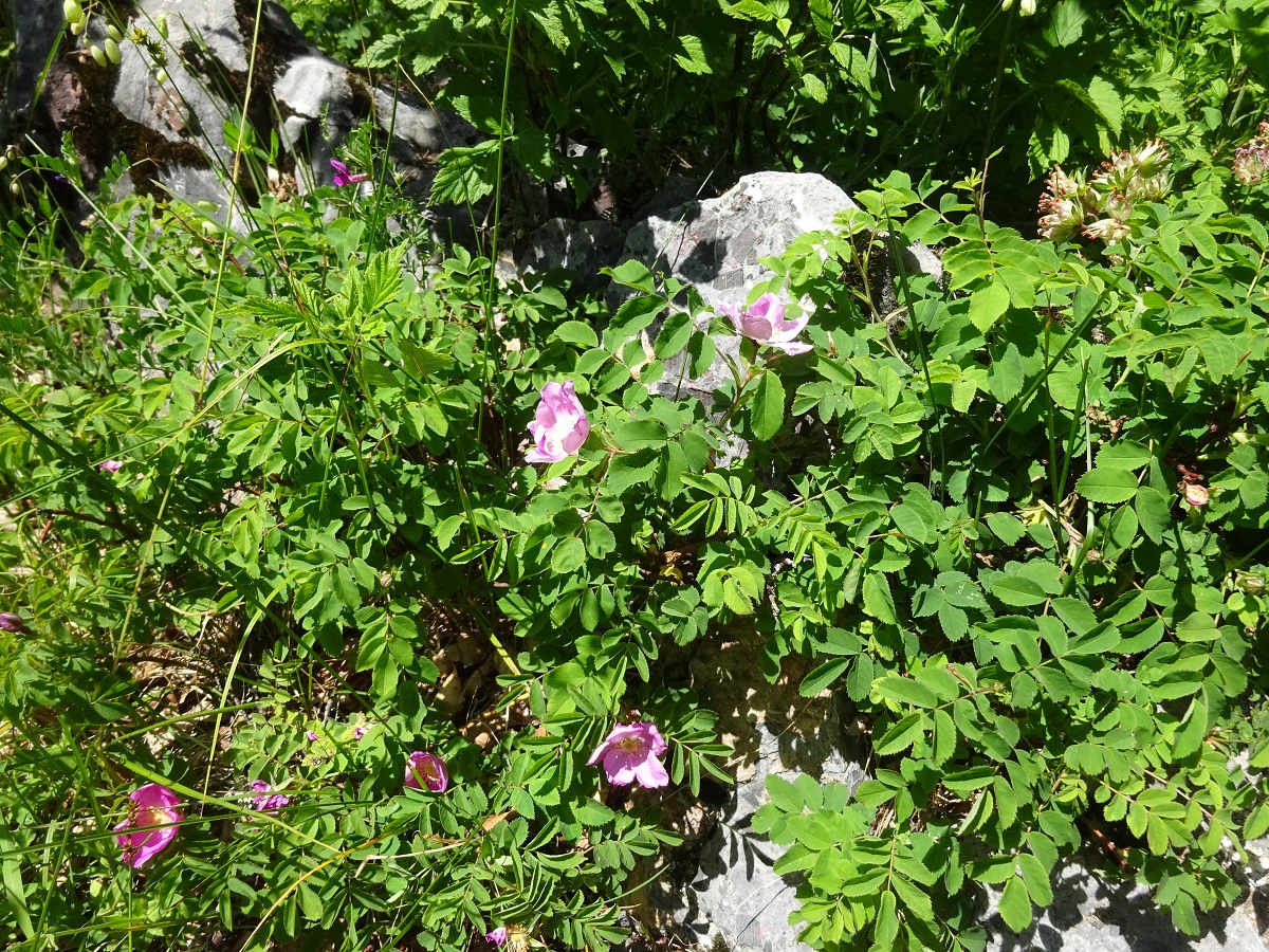 NPh – 5-20 dm – Aiguillons rares, droits, feuilles à 7-9 folioles glabres – Fleurs de Ø 3-8 cm, à 5 pétales rouges émarginés, sépales ± entiers – ’’Fruit’’ rouge pendant ovoïde glanduleux