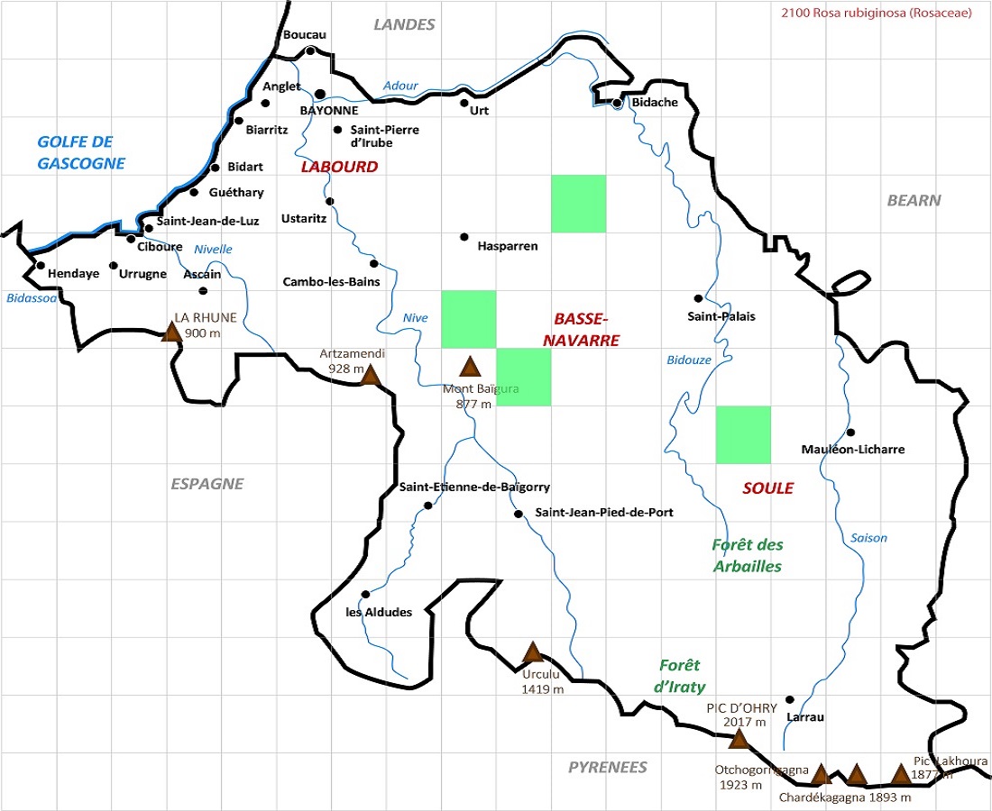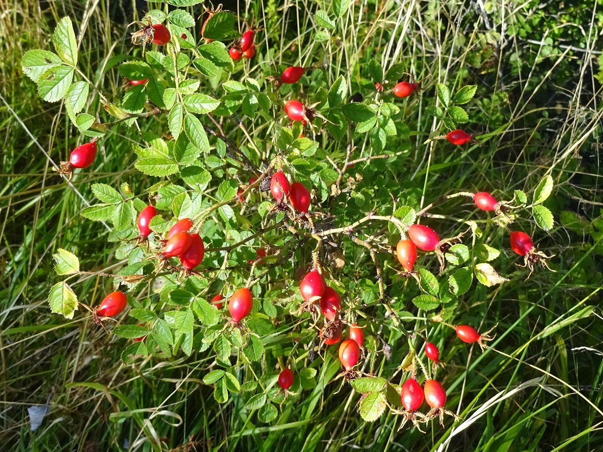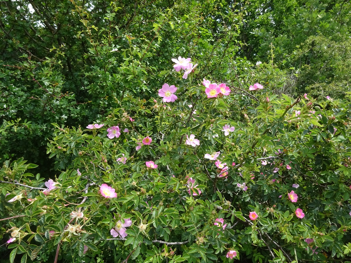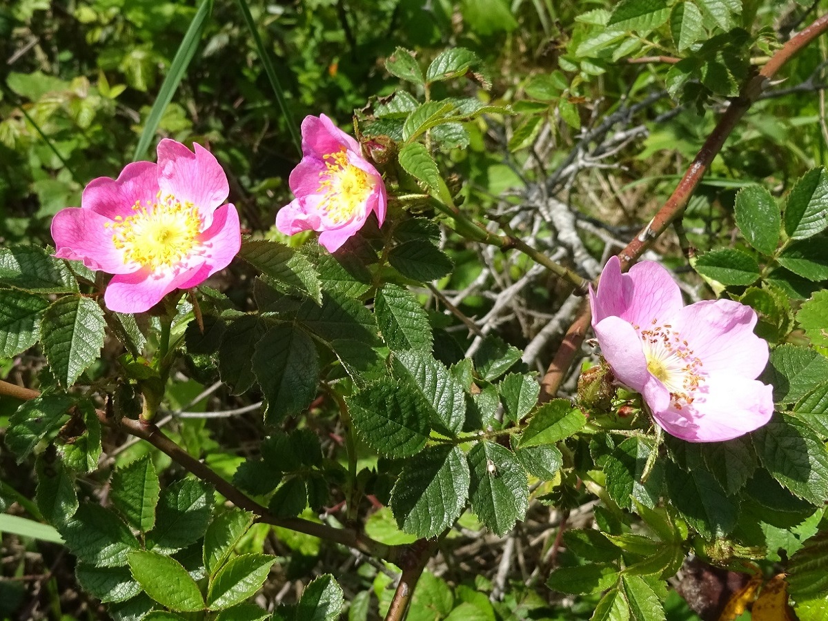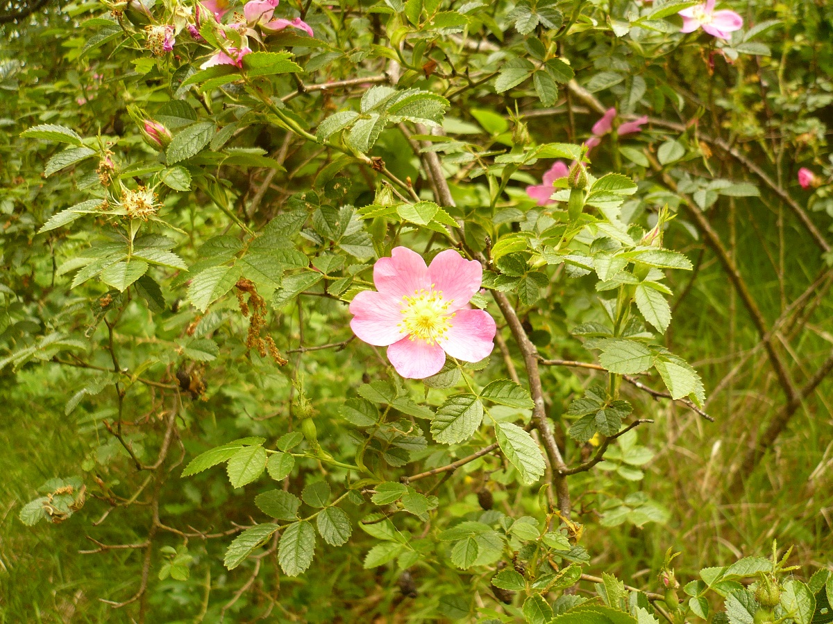 NPh – 5-20 dm – Aiguillons crochus, feuilles à petites folioles glanduleuses odorantes – Fleurs de Ø 3-5 cm, à 5 pétales rose vif – Sépales lobés dressés, ’’fruit’’ rouge à pédicelle glanduleux