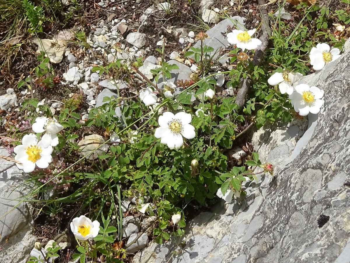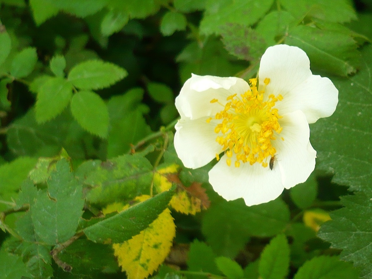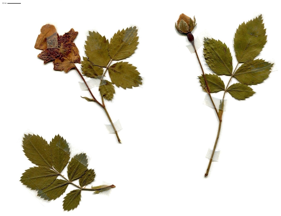 NPh – 0,5-3 m – Tige grêle peu épineuse, 5-7 folioles fines ± velues, caduques – Fleurs de Ø 3-5 cm, à 5 pétales blancs, styles soudés en colonne – ’’Fruit’’ rouge petit, pédicelle ± glanduleux