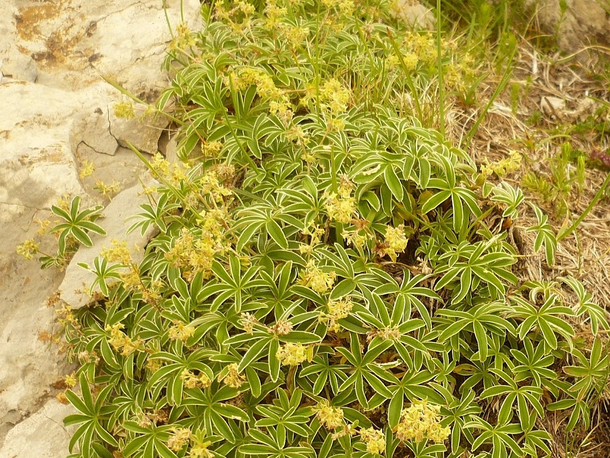 Hc – 1-3 dm – Feuilles à 7 folioles oblongues ± pliées et libres à la base, peu dentées à l'apex, soyeuses argentées dessous, à net liseré blanc – Petites fleurs en glomérules jaunâtres denses