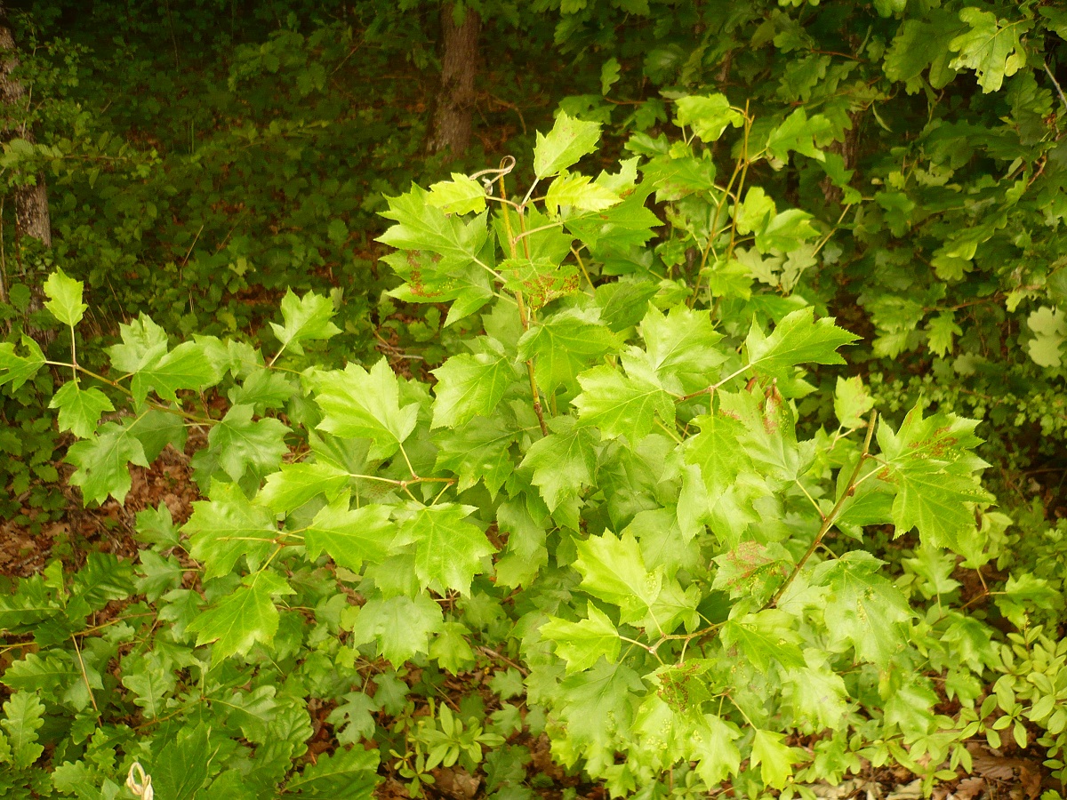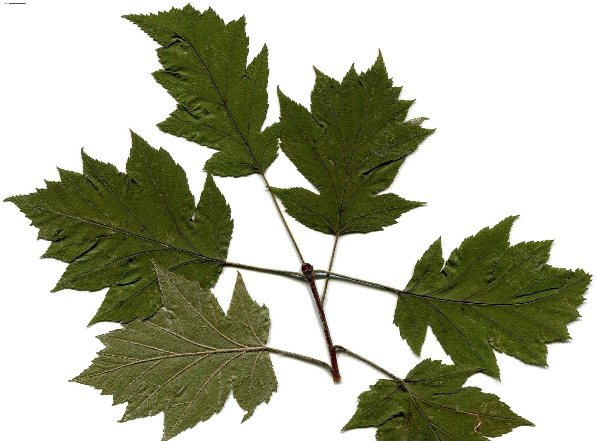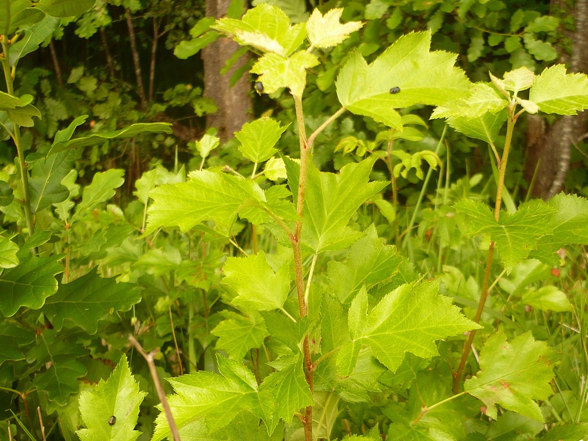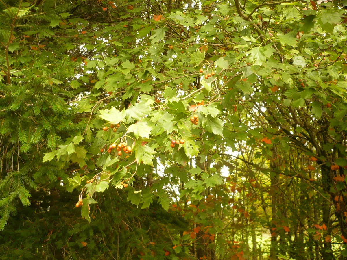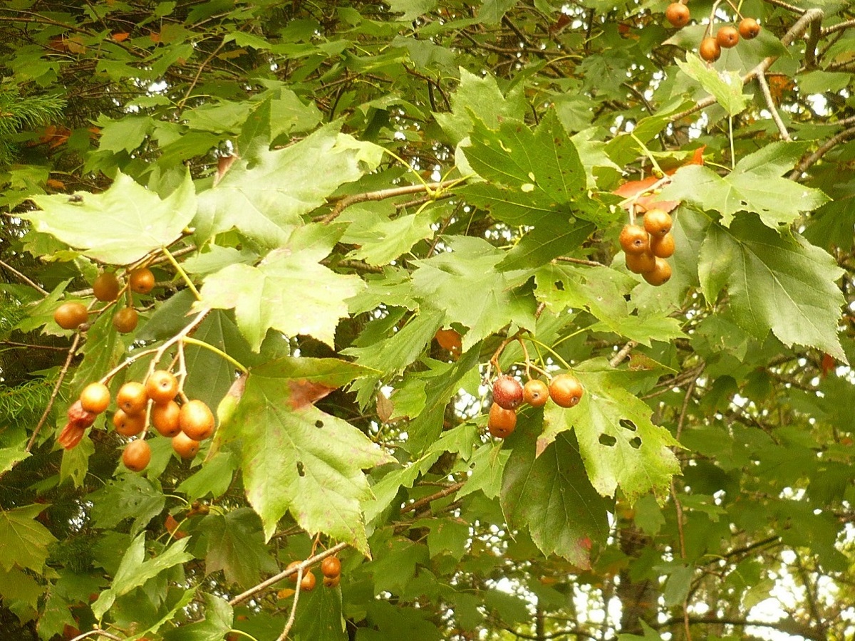 Ph – 3-20 m – Feuilles( L 5-9 cm) à 5-9 lobes symétriques triangulaires aigus dentés – Corymbes de fleurs de Ø 10-15 mm blanches – « Fruit » ovoïde L de 12-18 mm brun ponctué de lenticelles