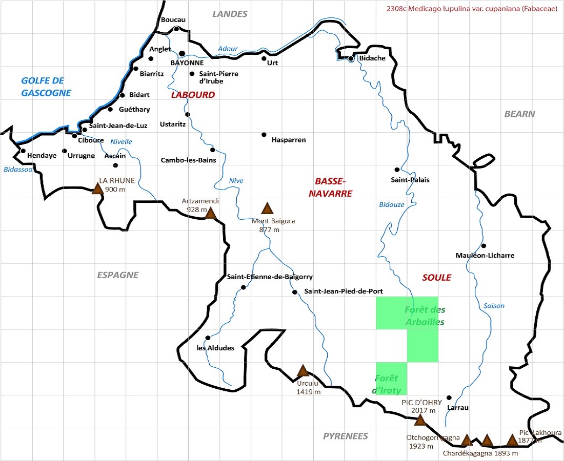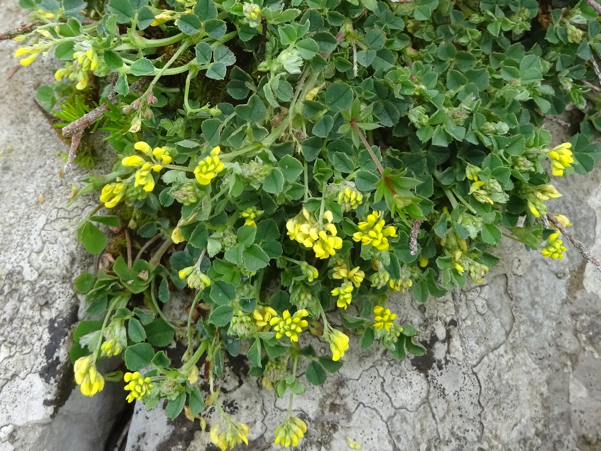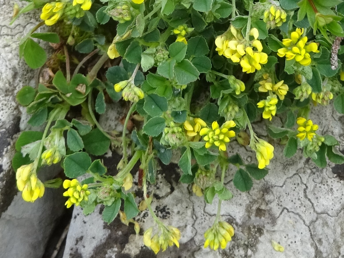 Hc – 1-2 dm – Feuilles à 3 folioles obovales ± pétiolulées – Fleurs (< 10) en tête lâches à corolle jaune L de 2-3 mm > au calice – Gousses noires de L 1,5-3 mm réniformes, réticulées