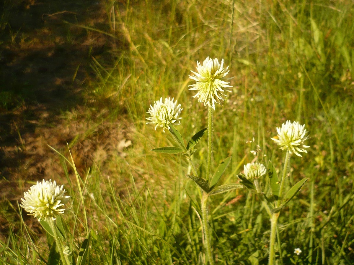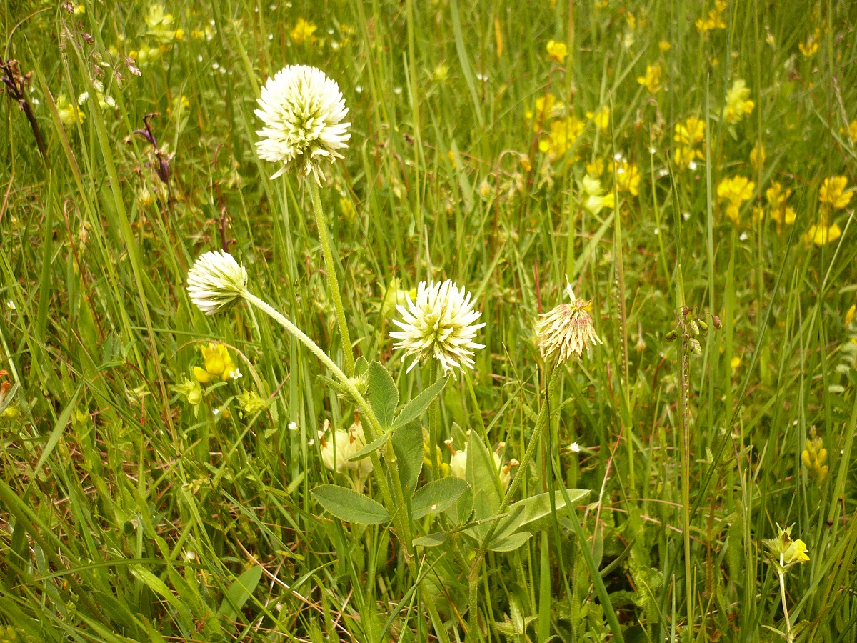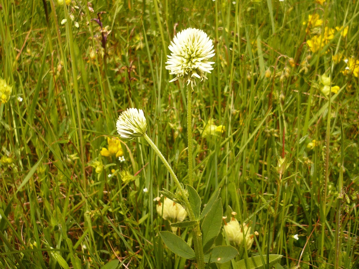 Hc – 2-4 dm – Folioles L de 3-6 cm oblongues, stipules linéaires – Fleurs blanches en tête sphérique de Ø 1-2 cm à pédoncule dressé, corolle L de 7-9 mm > au calice à dents subulées