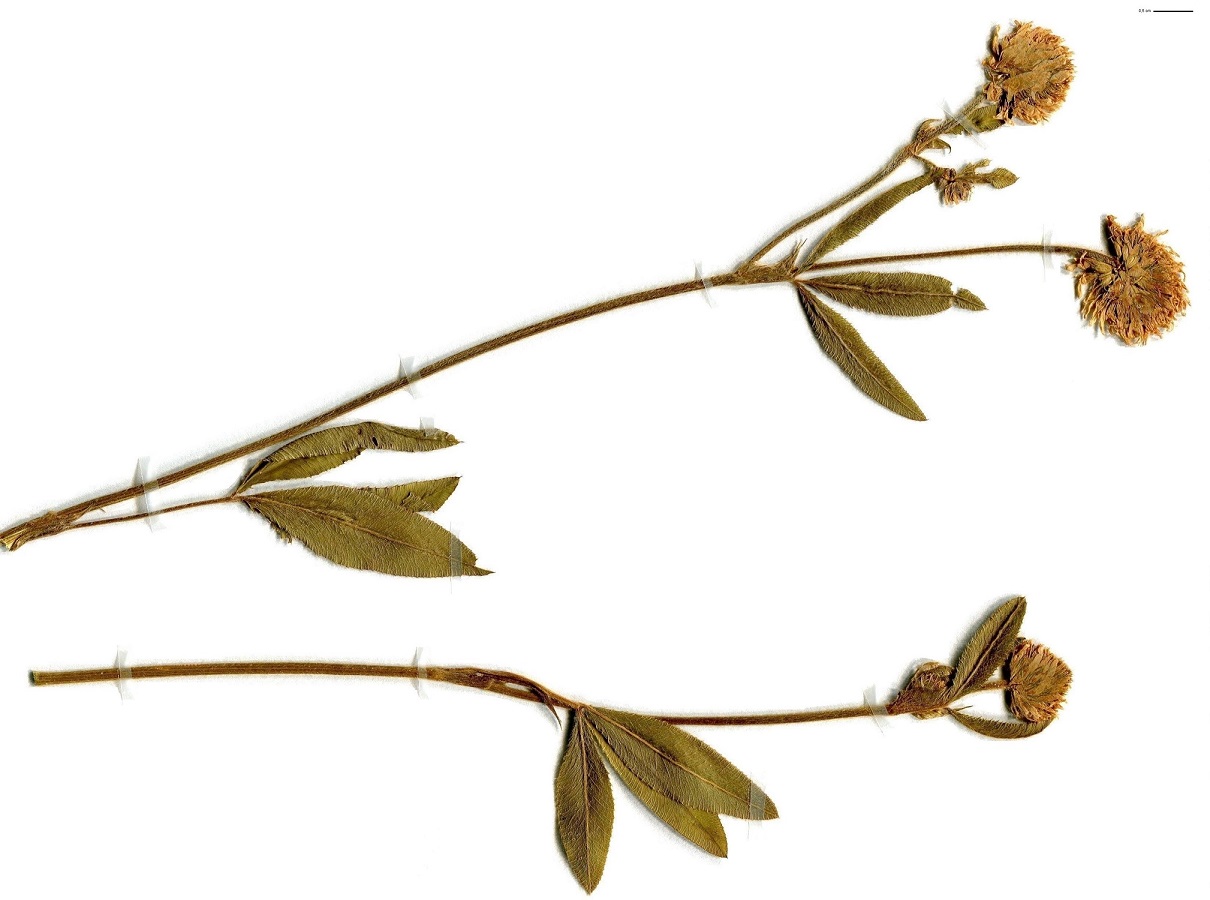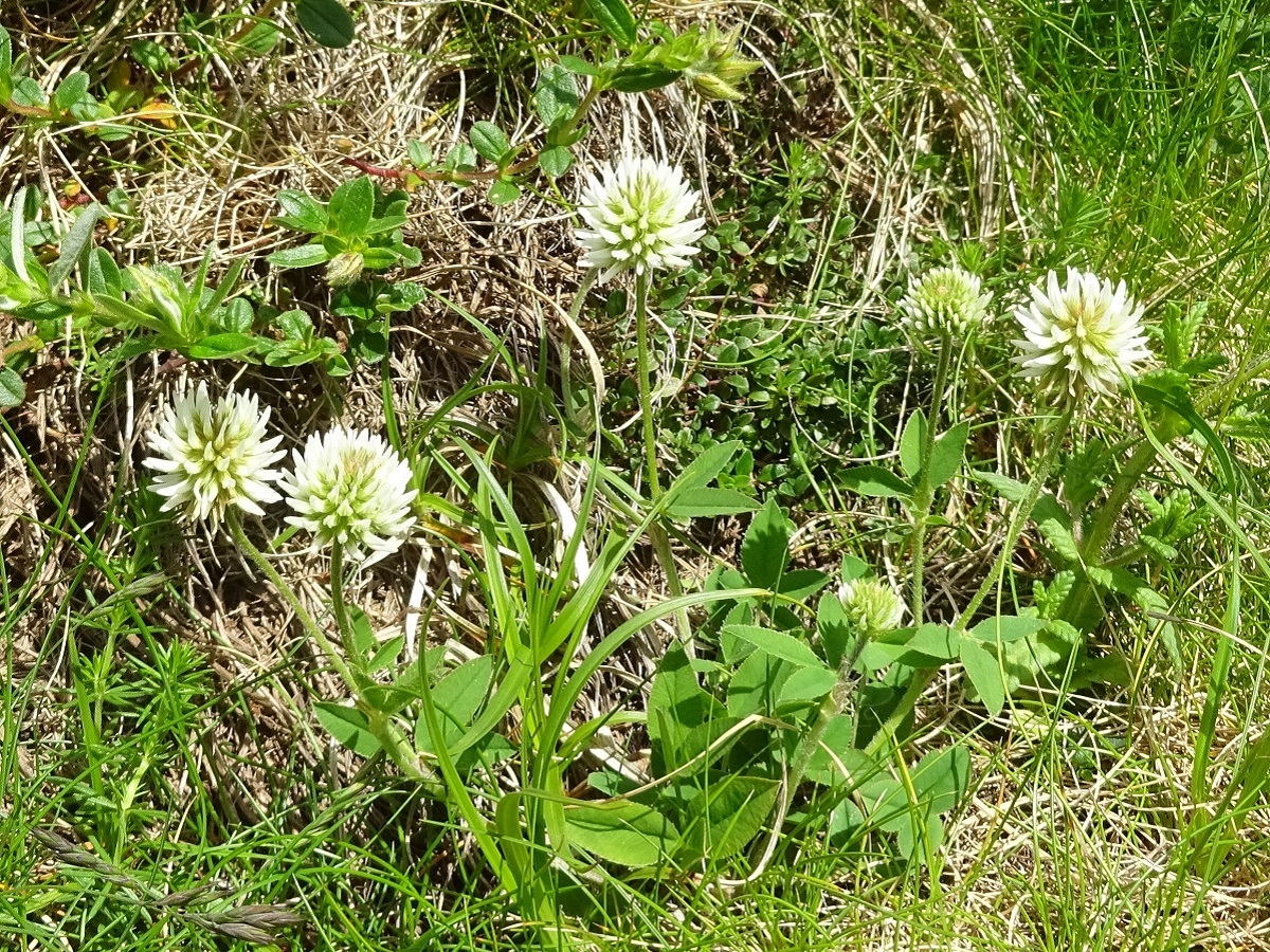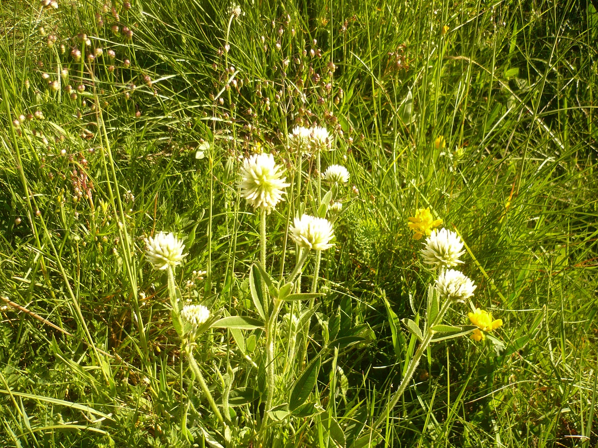 Hc – 2-4 dm – Folioles L de 3-6 cm oblongues, stipules linéaires – Fleurs blanches en tête sphérique de Ø 1-2 cm à pédoncule dressé, corolle L de 7-9 mm > au calice à dents subulées