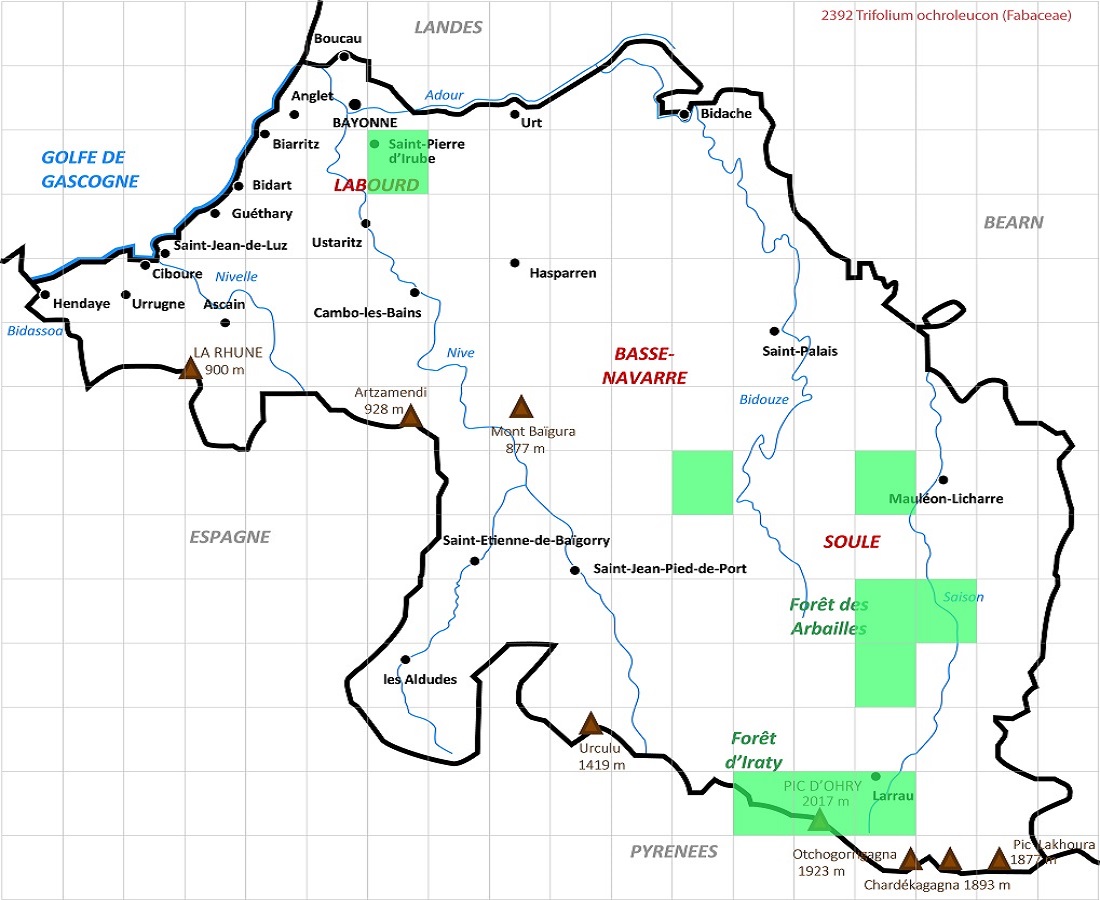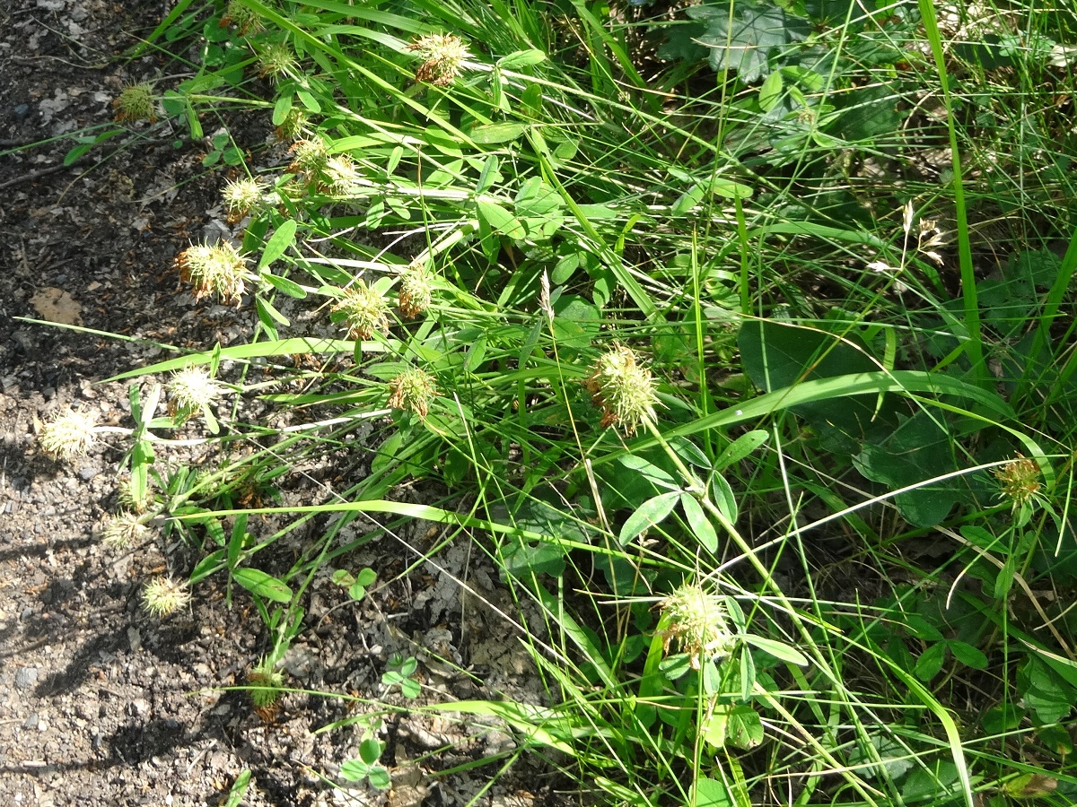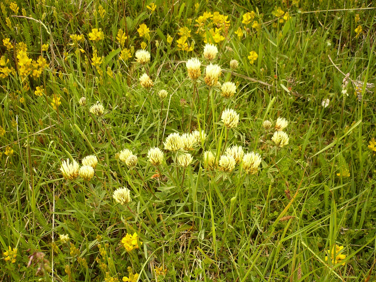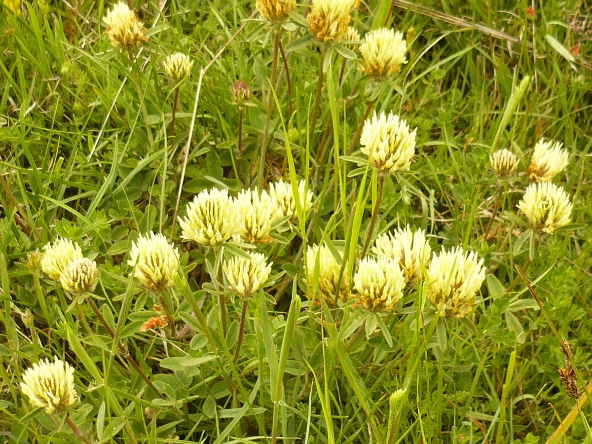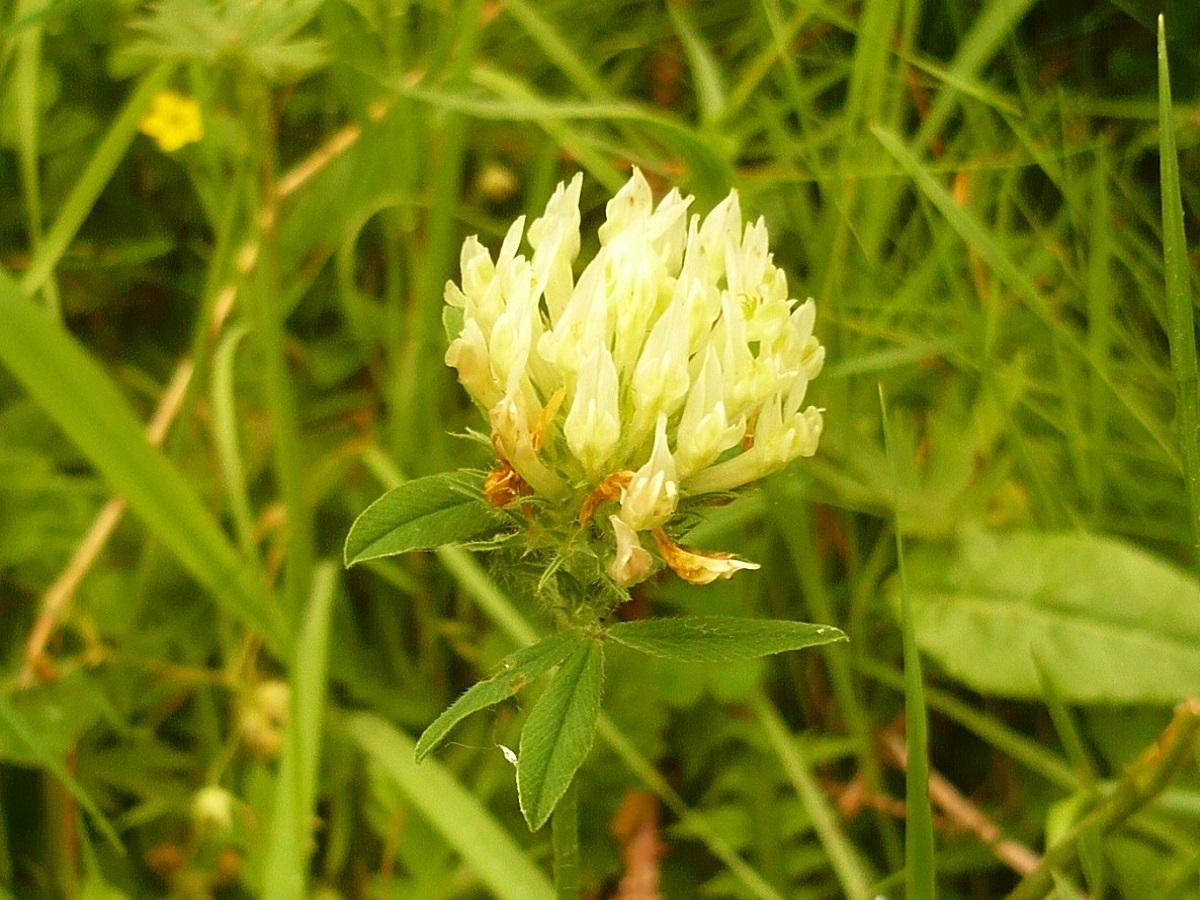 Hc – 2-4 dm – Folioles L de 1,5-3 cm ovales oblongues, stipules lancéolées – Fleurs blanc-jaunâtre en tête de Ø 2-4 cm ± sessile, corolle L de 1,5-2 cm > au calice à dent < + longue