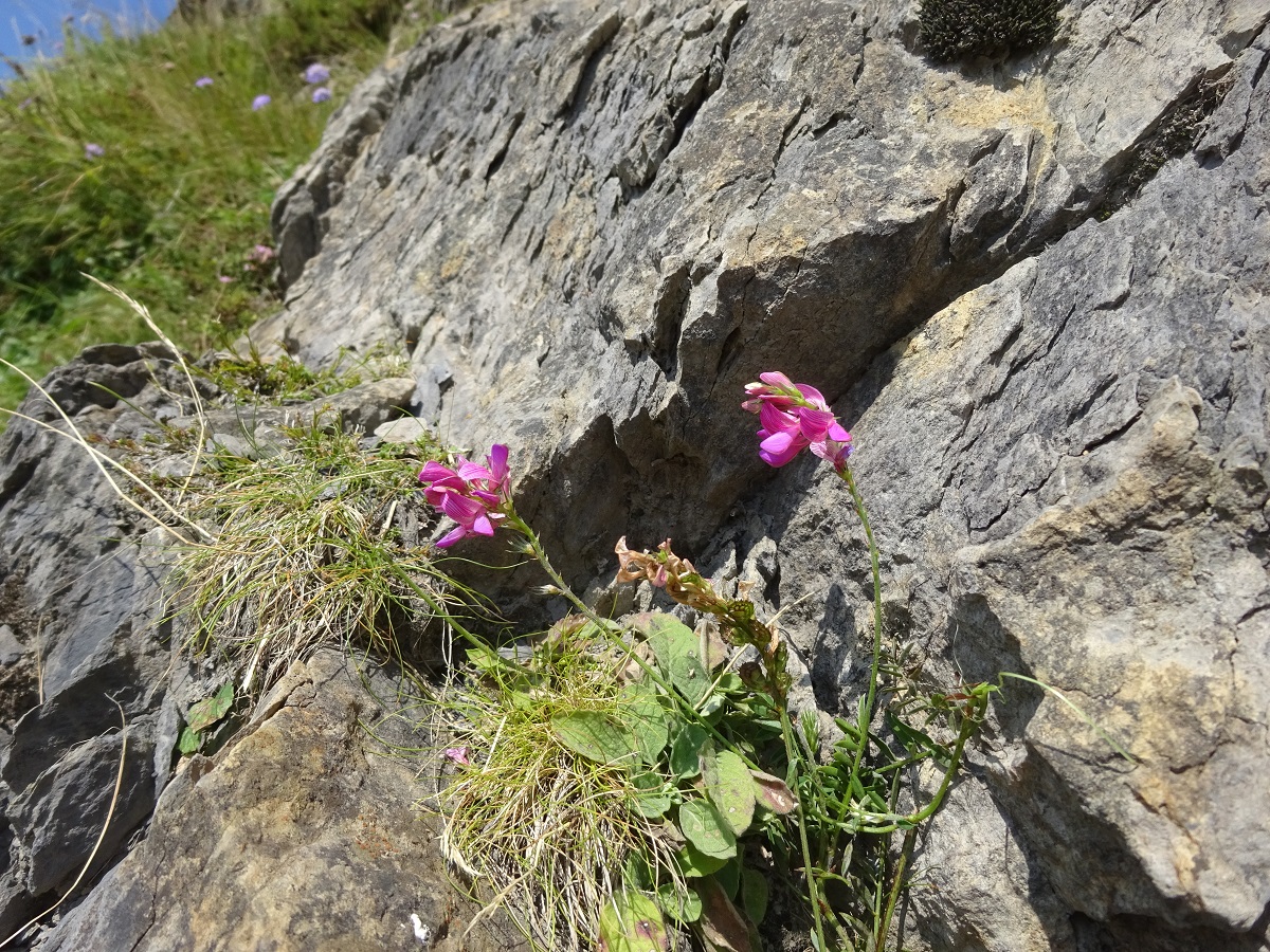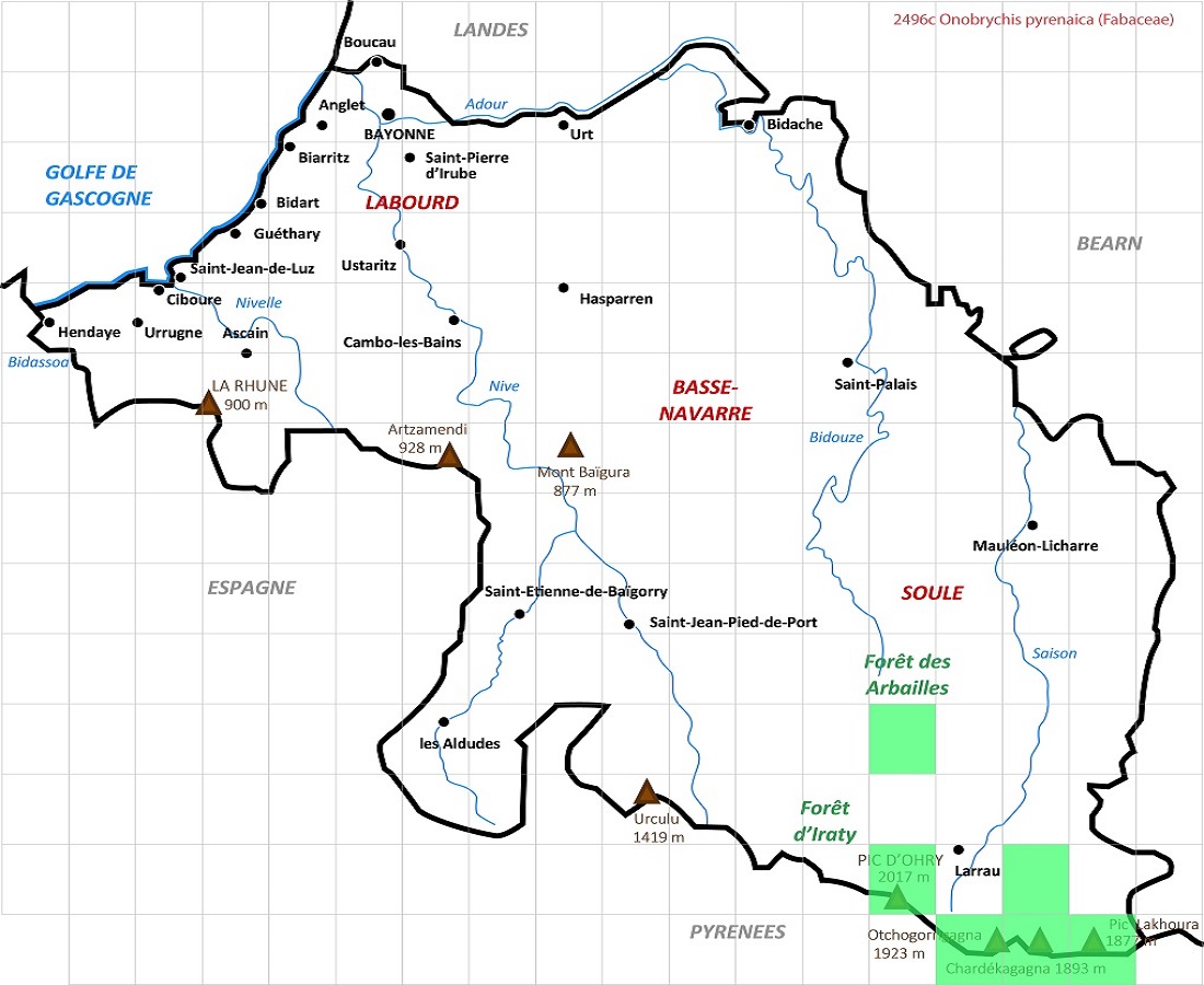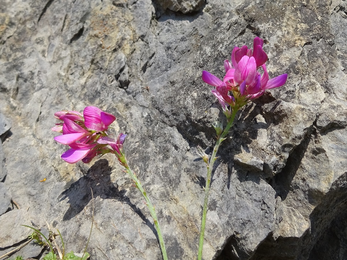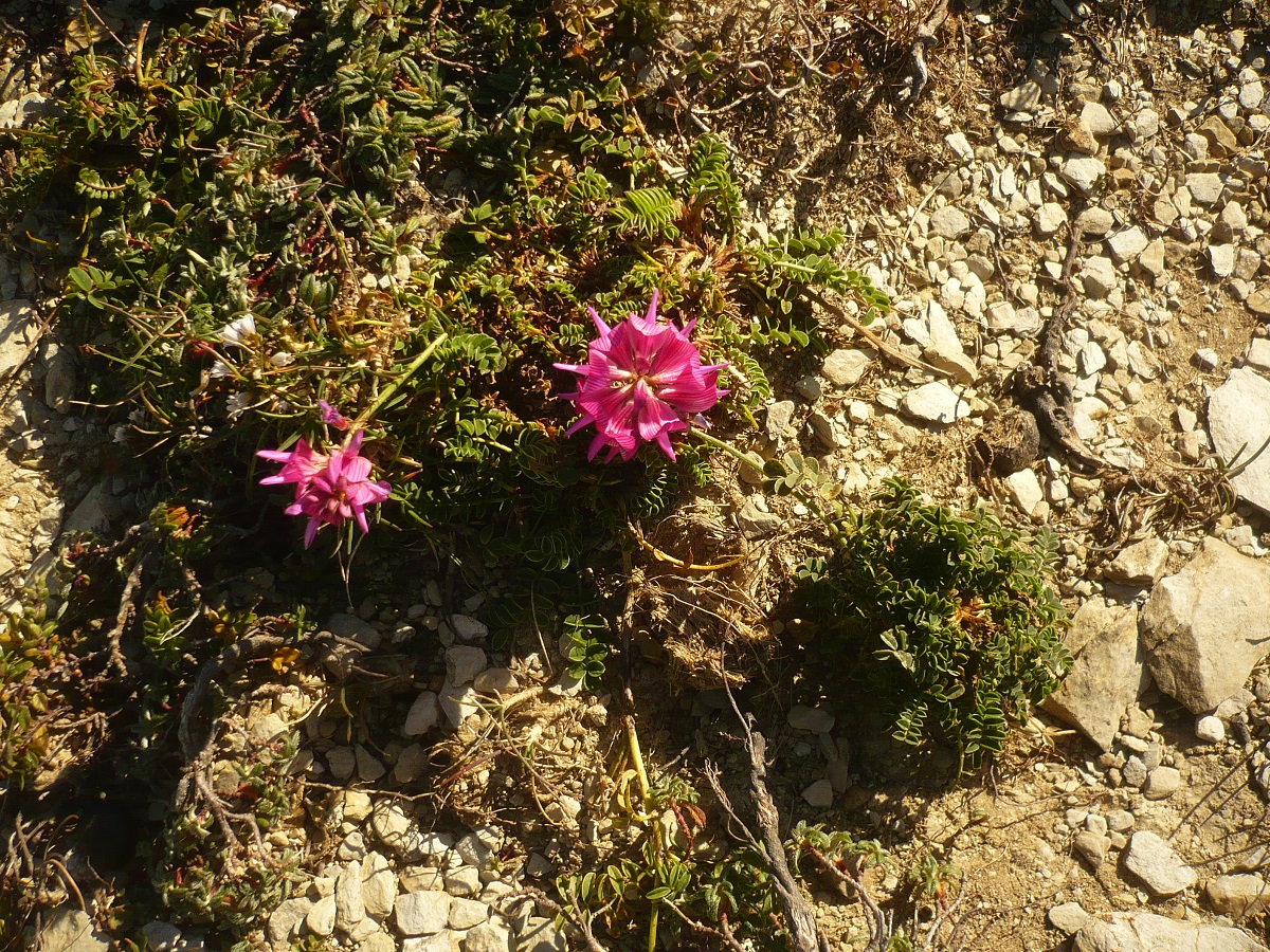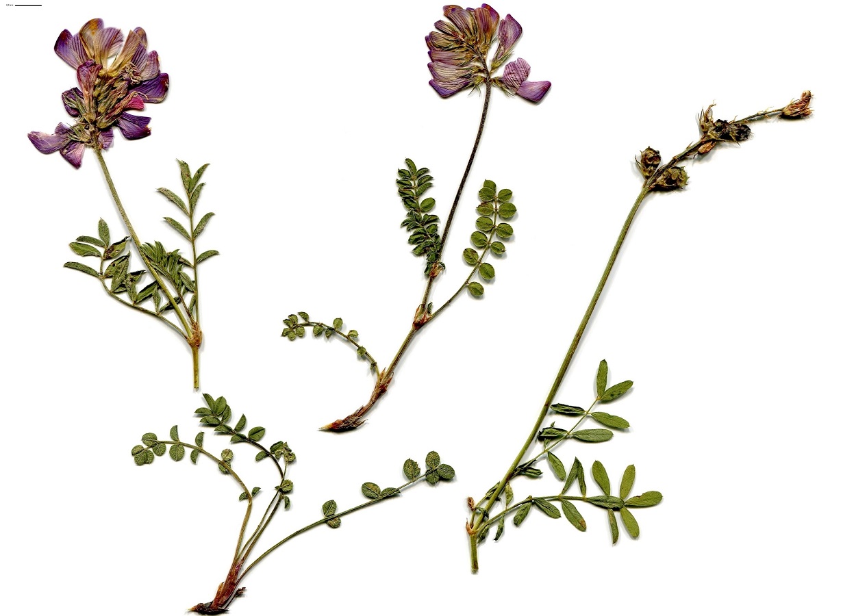 Hc/Ch – 1-2 dm – Feuilles pennées à 9-15 folioles ovales oblongues – Fleurs en tête dense, corolle L de 10-12 mm rouge foncé, étendard < à la carène – Gousse L de 6-8 mm épineuse alvéolée