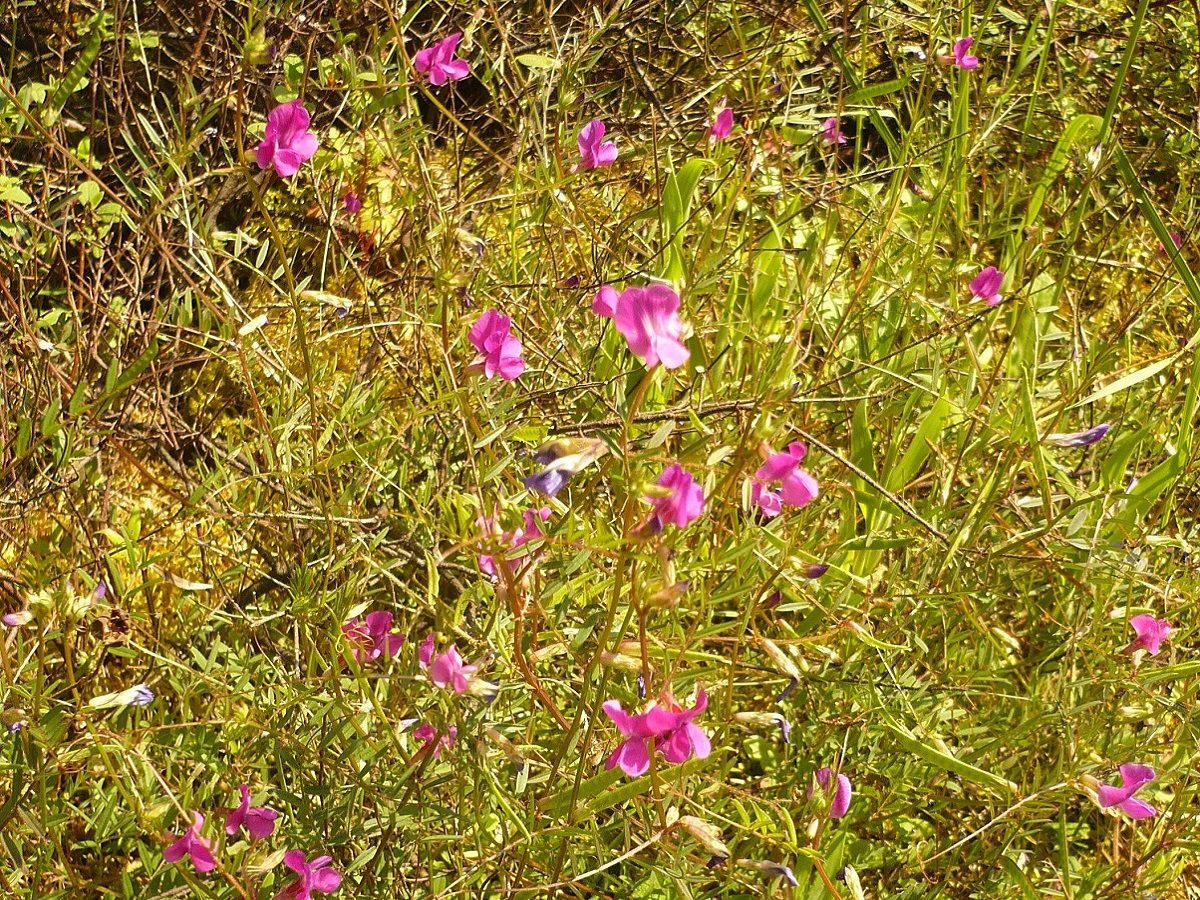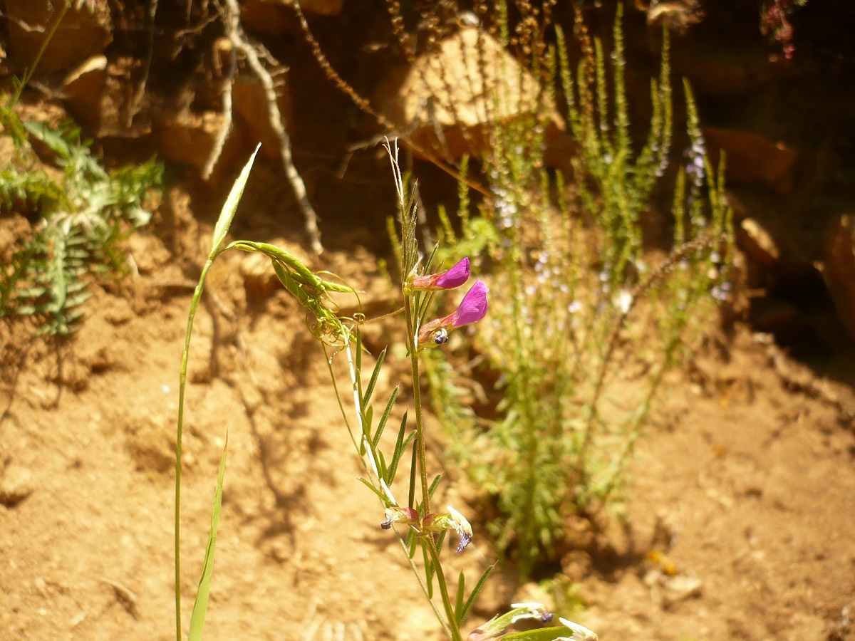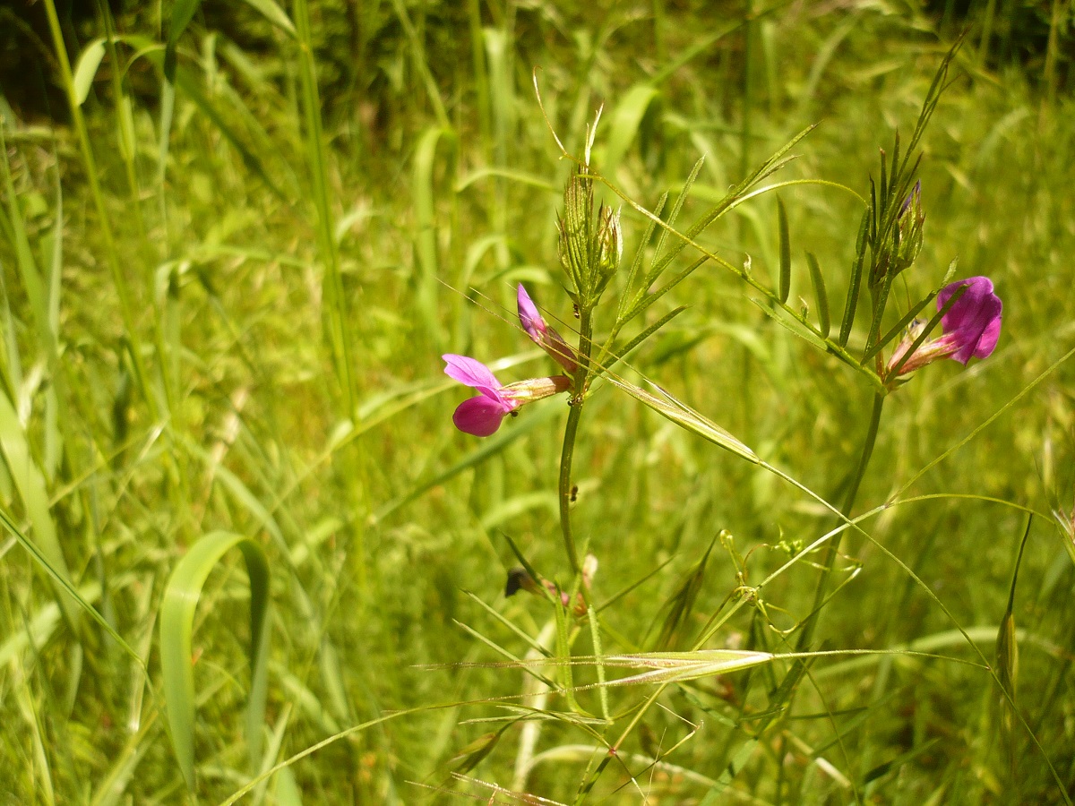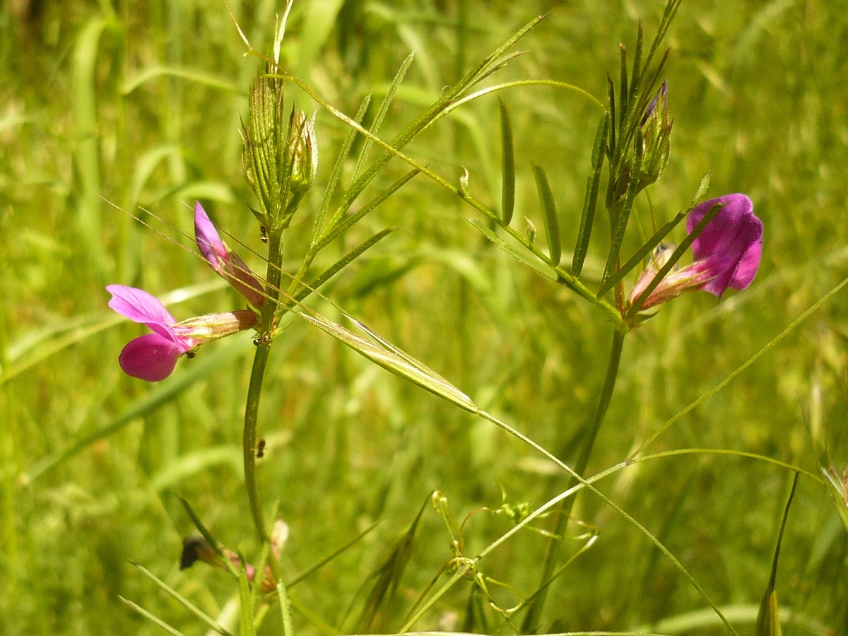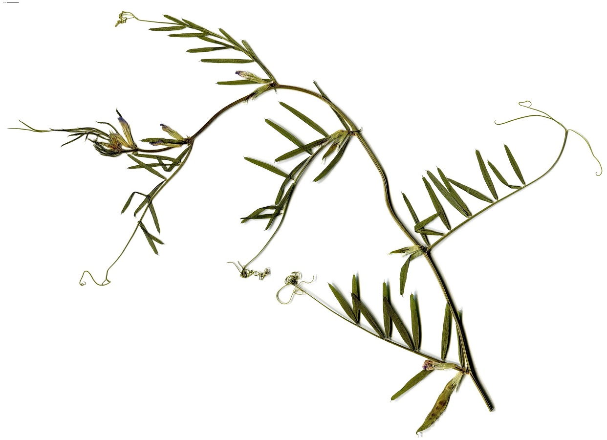 Th – 2-6 dm – Feuilles pennées à 8-14 folioles (L 1-3 cm) linéaires nettement espacées, avec vrille – Fleurs par 1-2, corolle L de 1-1,8 cm rouge violacé – Gousse de 4-6 mm de large, vite noire