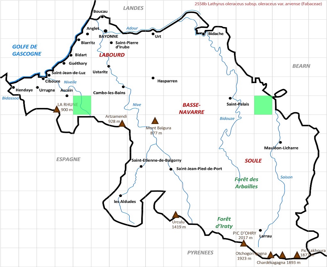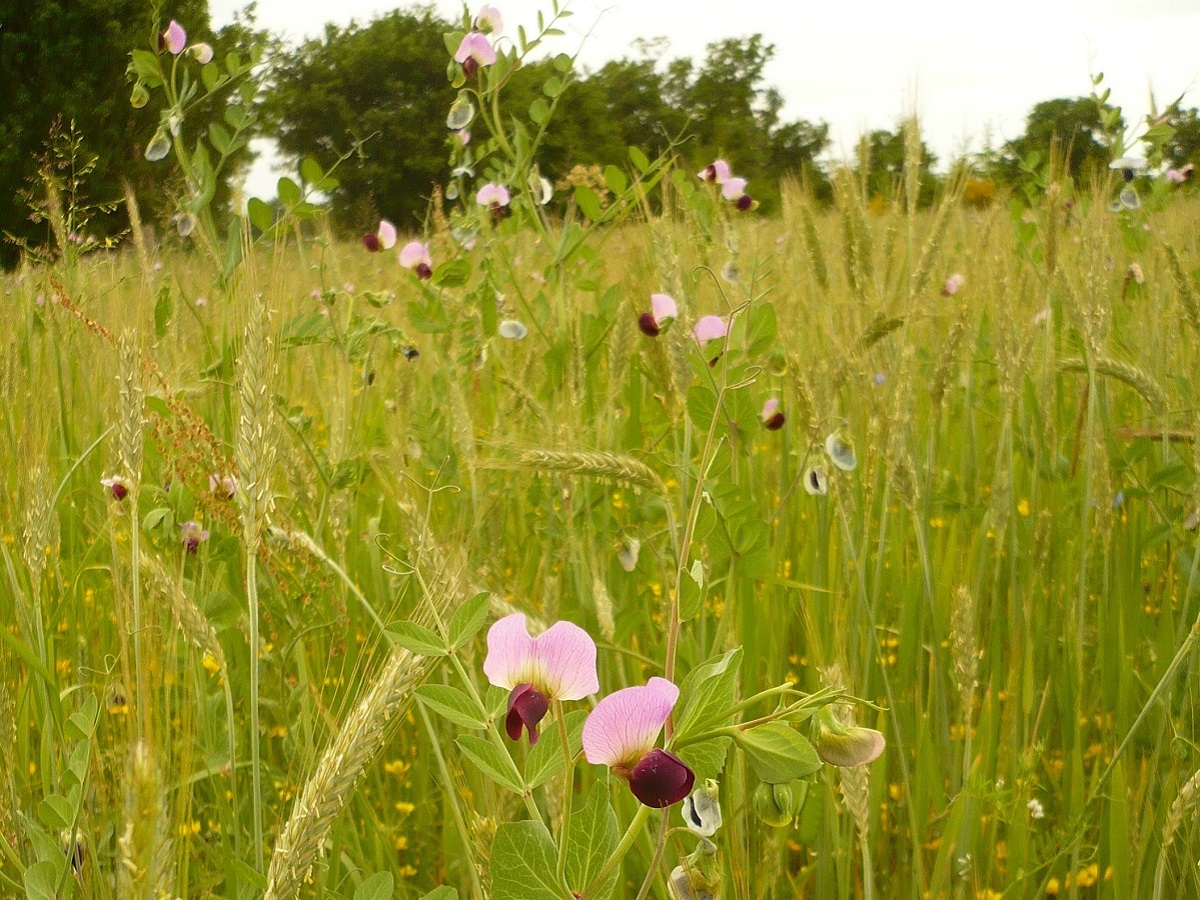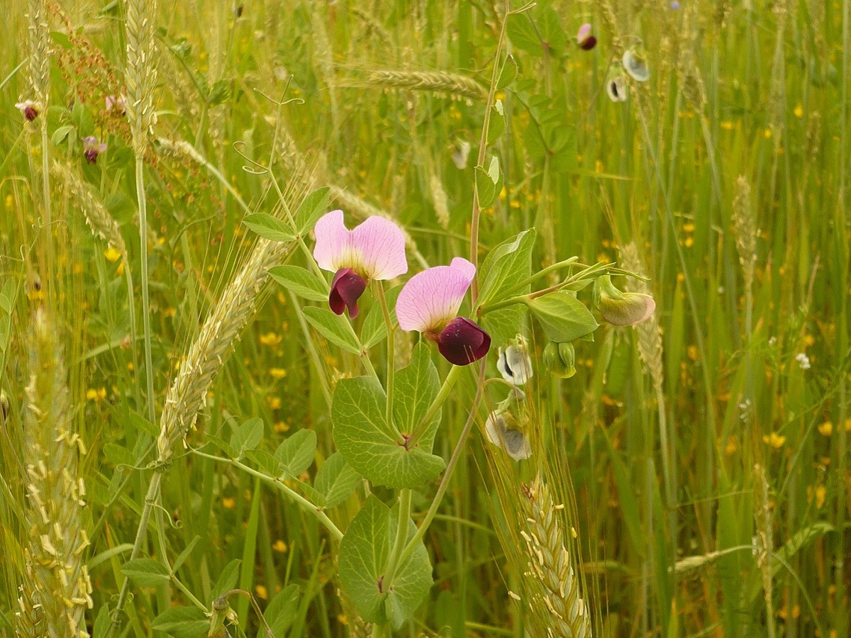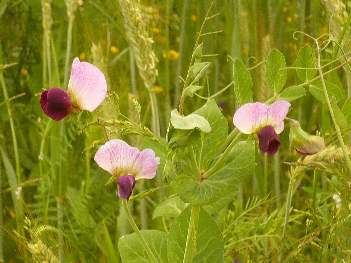 Th – 5-10 dm – Glauque, feuilles à 2-6 folioles ovales et 1 vrille, 2 grandes stipules ovales semi-cordées – Fleurs par 1-3, corolle de L 1,5-2 cm rose à ailes pourpres – Graines anguleuses