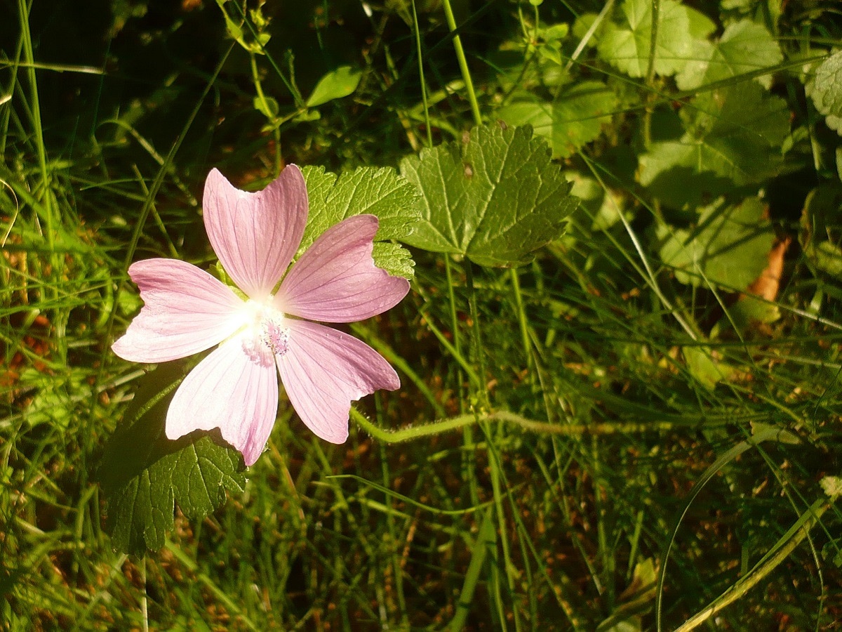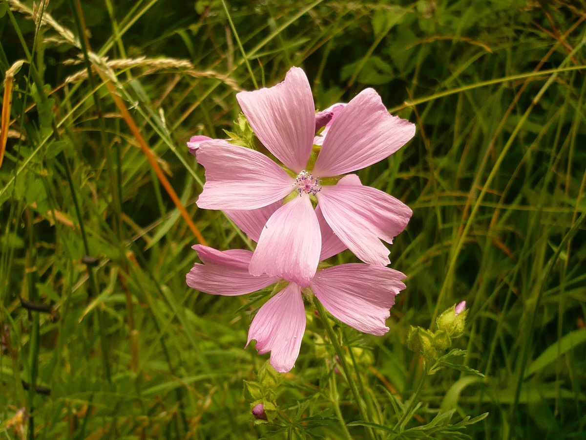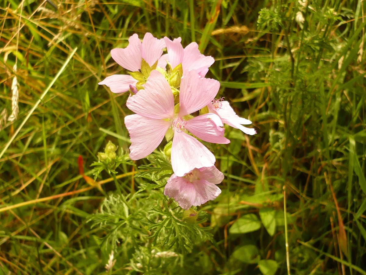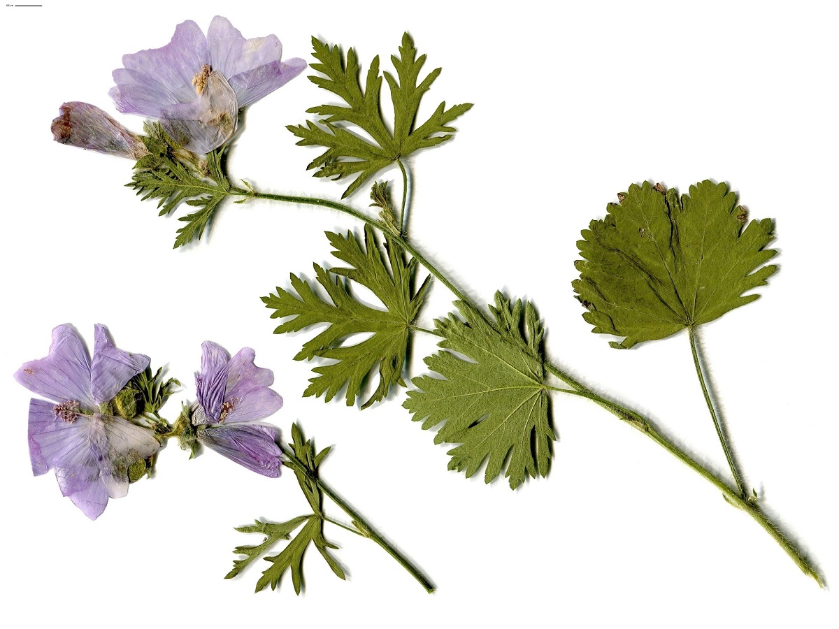 Hc – 5-10 dm – Feuilles supérieures à 5-7 lobes aigus ± finement découpés – Grandes fleurs à 5 pétales de L ≃ 2 cm roses échancrés, épicalice à segments très étroits – Méricarpes hérissés