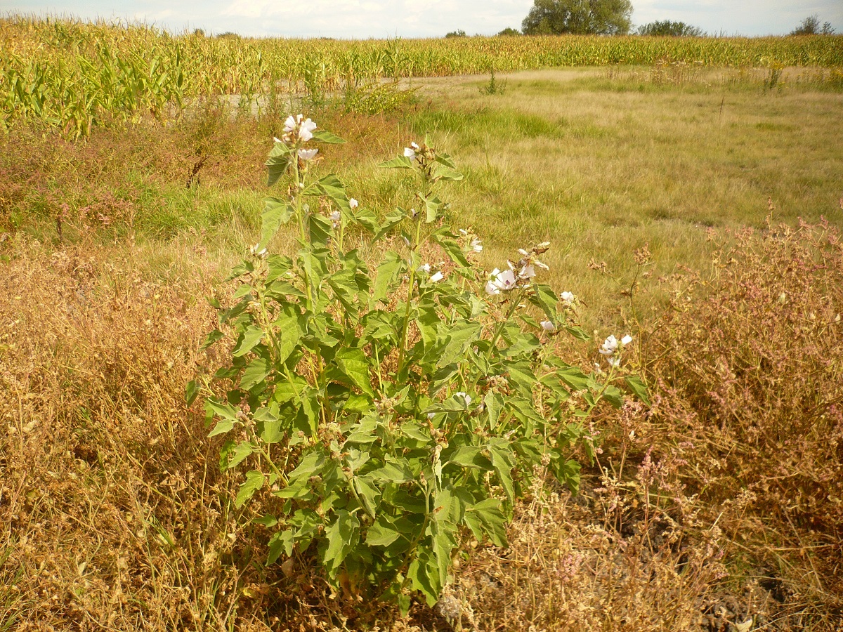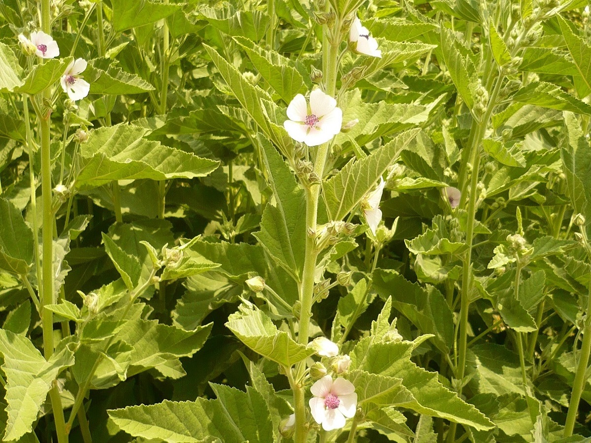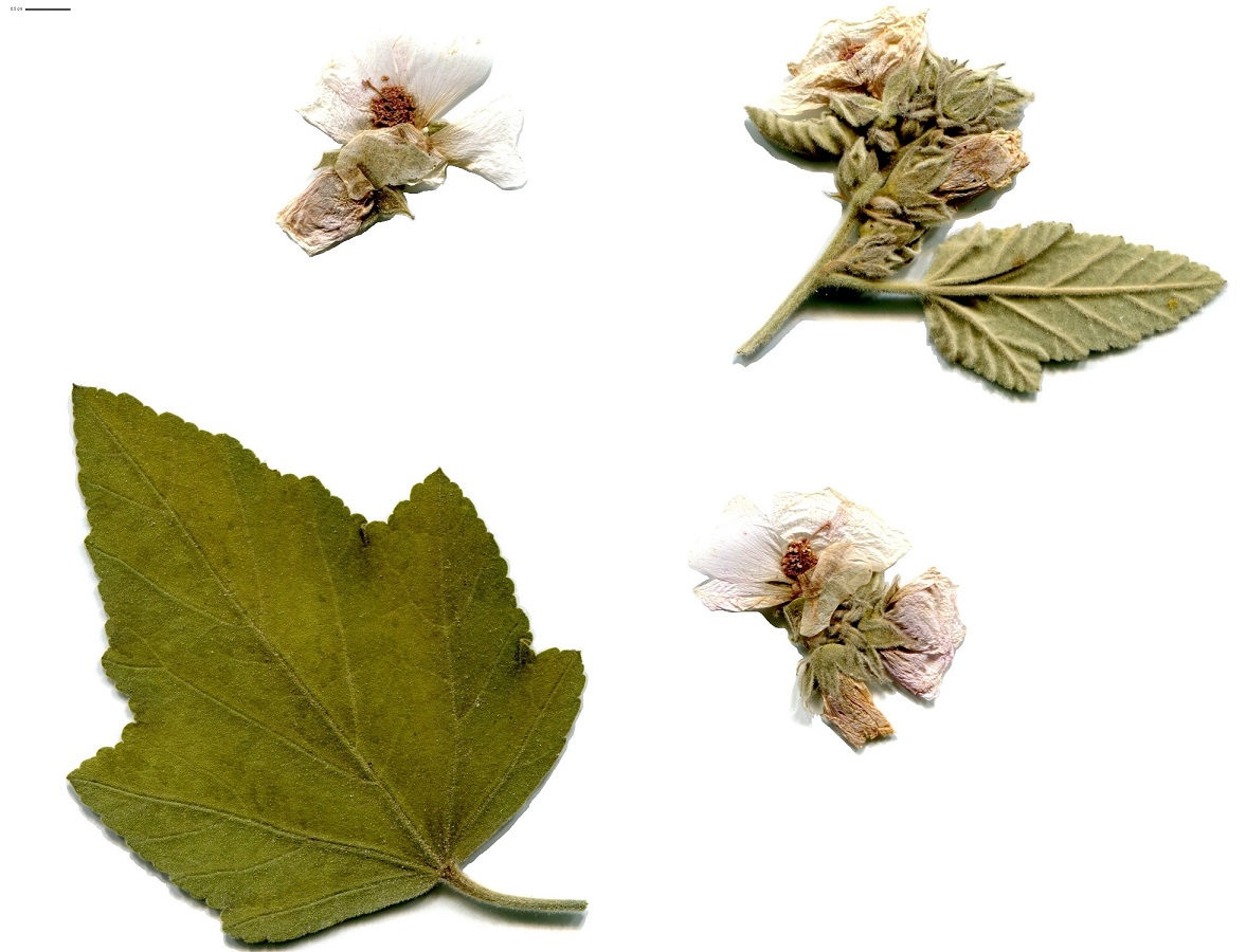 Hc – 5-15 dm – Plante dressée veloutée blanchâtre, feuilles ovales aiguës ± lobées dentées – Fleurs à 5 pétales L de 1,5-2 cm rose pâle, épicalice à segments linéaires – Méricarpes velus