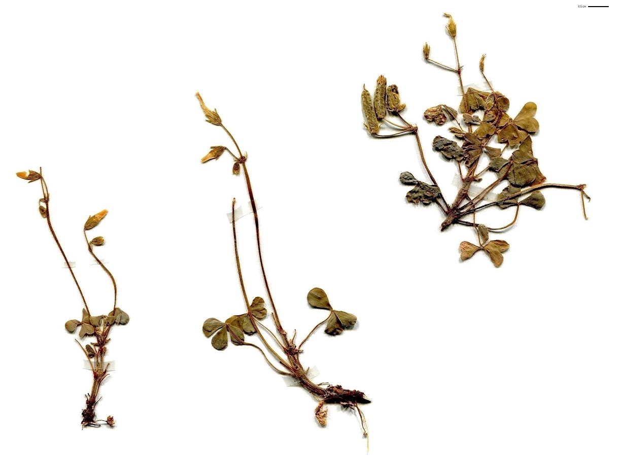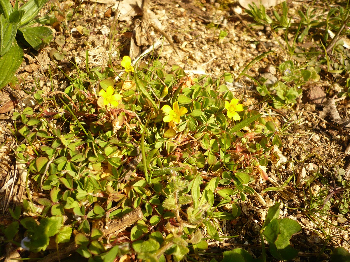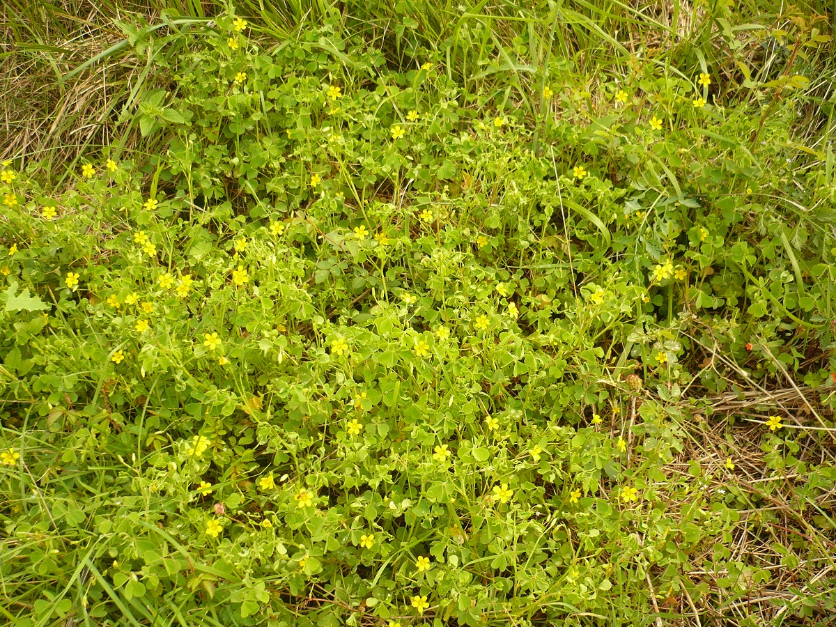 Th/Hc/Ch – 0,5-2 dm – Tige rampante, petites feuilles à 3 folioles obcordées – Fleurs en ombelle, à 5 petits pétales L de 4-7 mm jaunes – Capsule cylindrique L de 1-2 cm, dressée