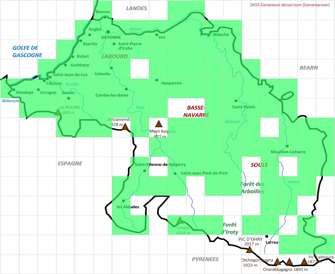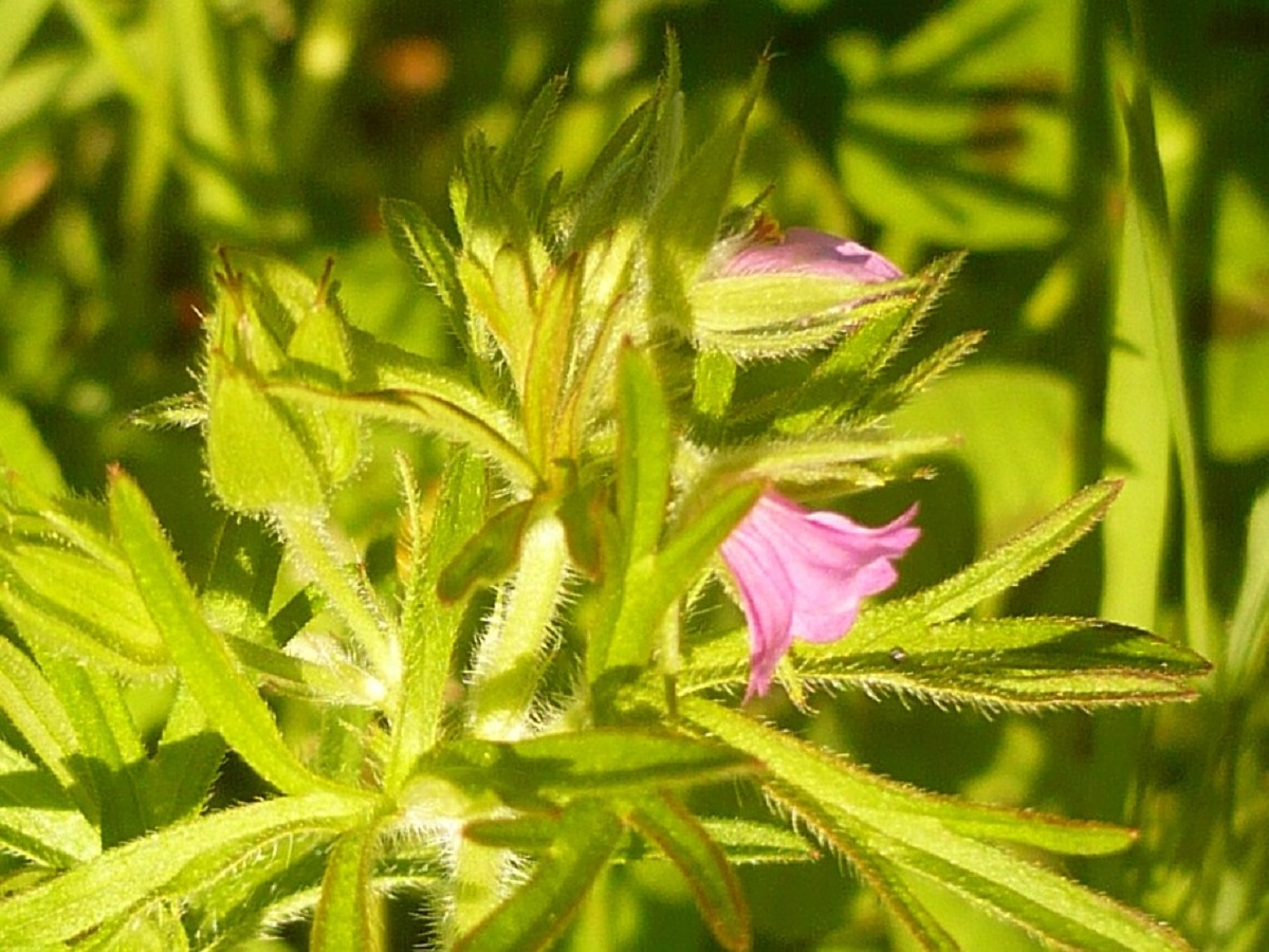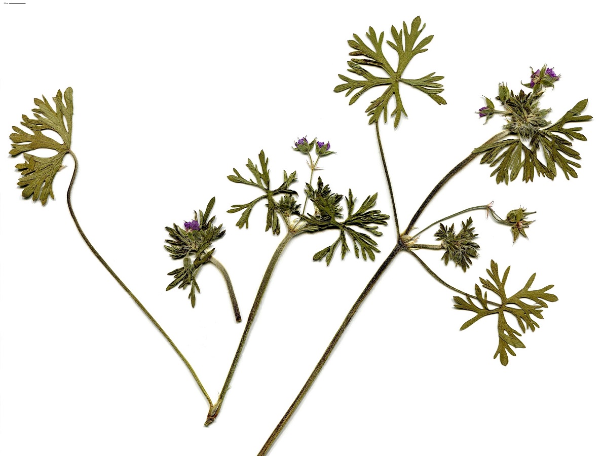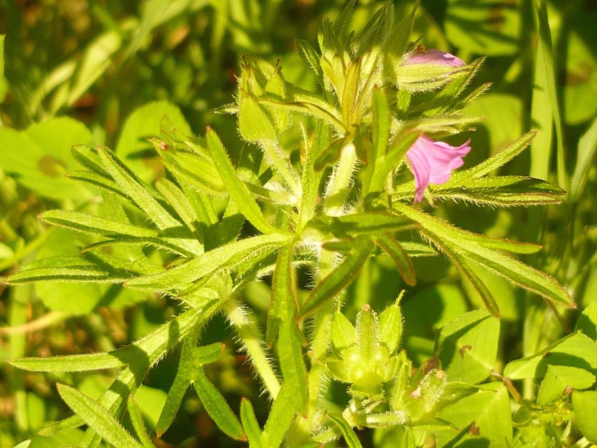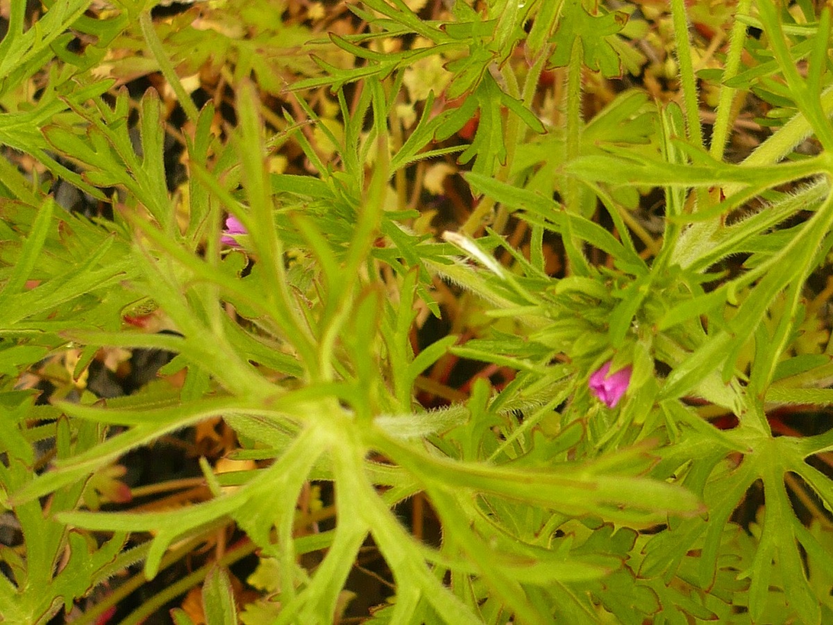 Th – 1-5 dm – Feuilles profondément divisées en segments ± linéaires – Fleurs à court pédicelle, à 5 pétales L de 4-5 mm rose pourpré – Fruit à bec et méricarpes velus