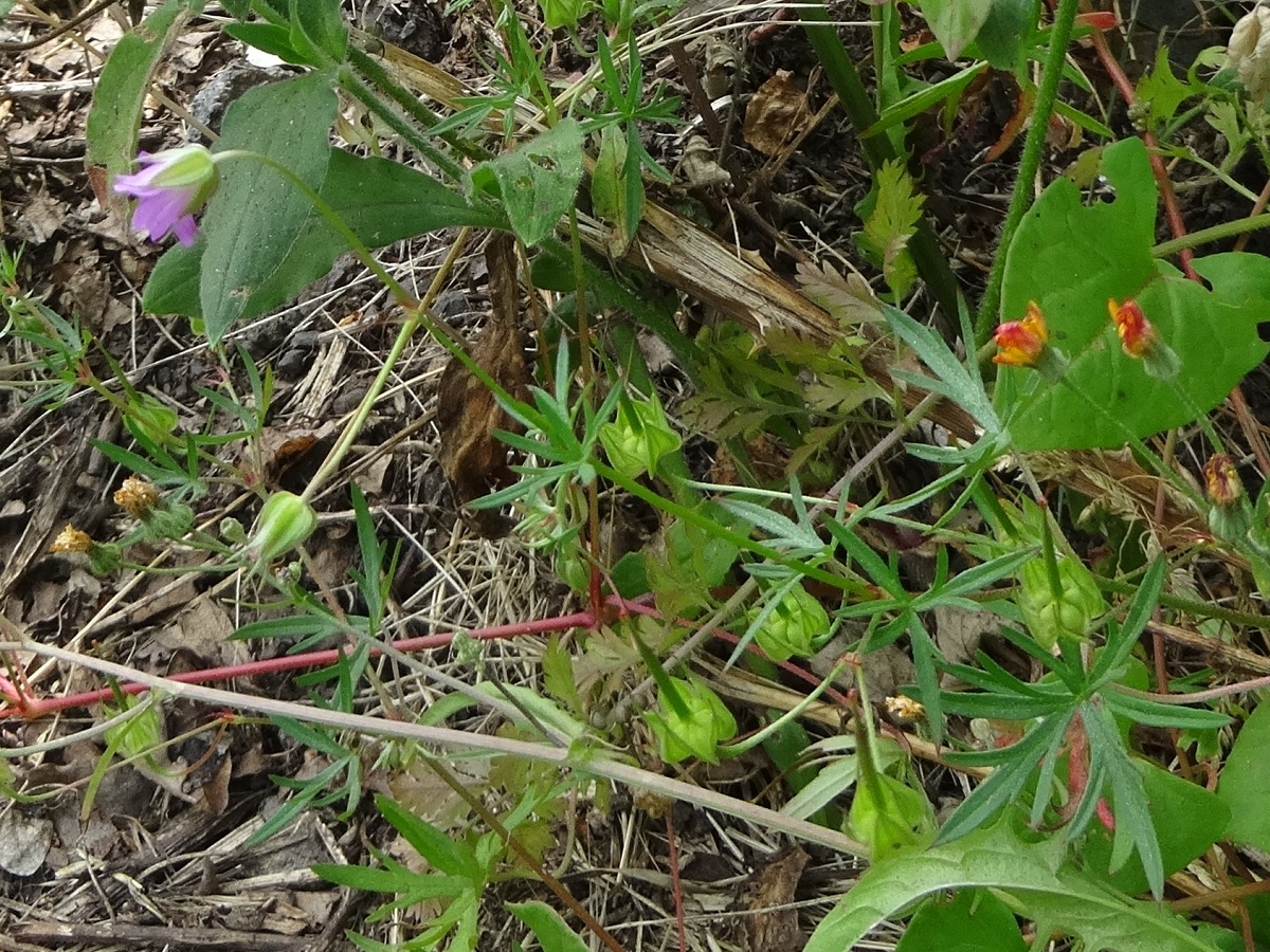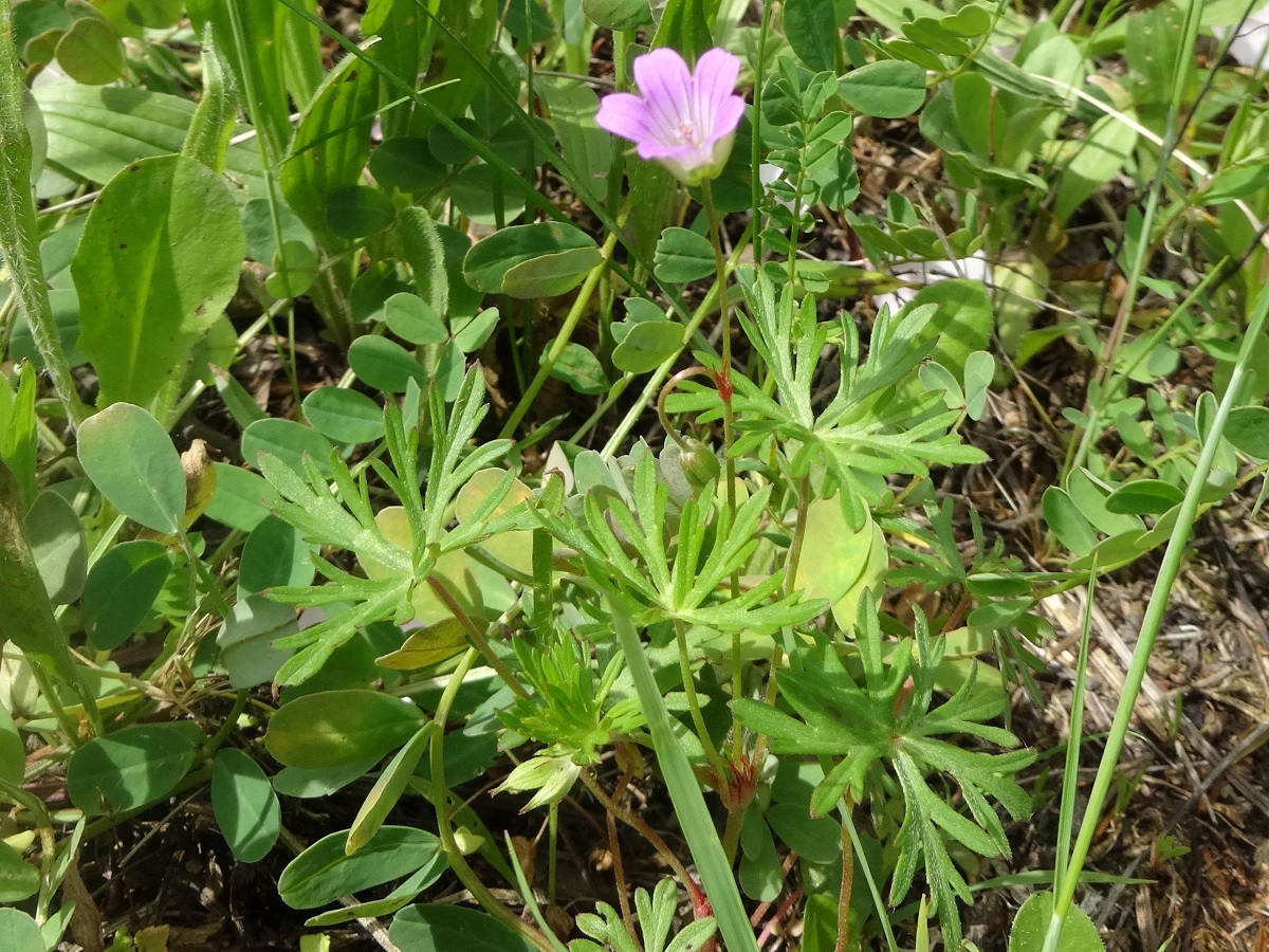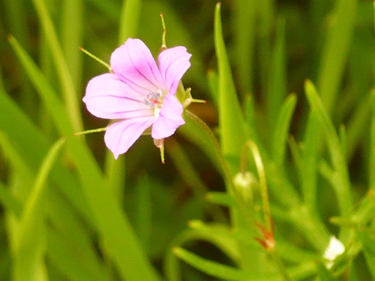 Th – 2-4 dm – Feuilles profondément divisées en segments ± linéaires – Fleurs à long pédicelle, à 5 pétales L de 7-10 mm rose pourpré, sépales aristés – Fruit et méricarpes glabres