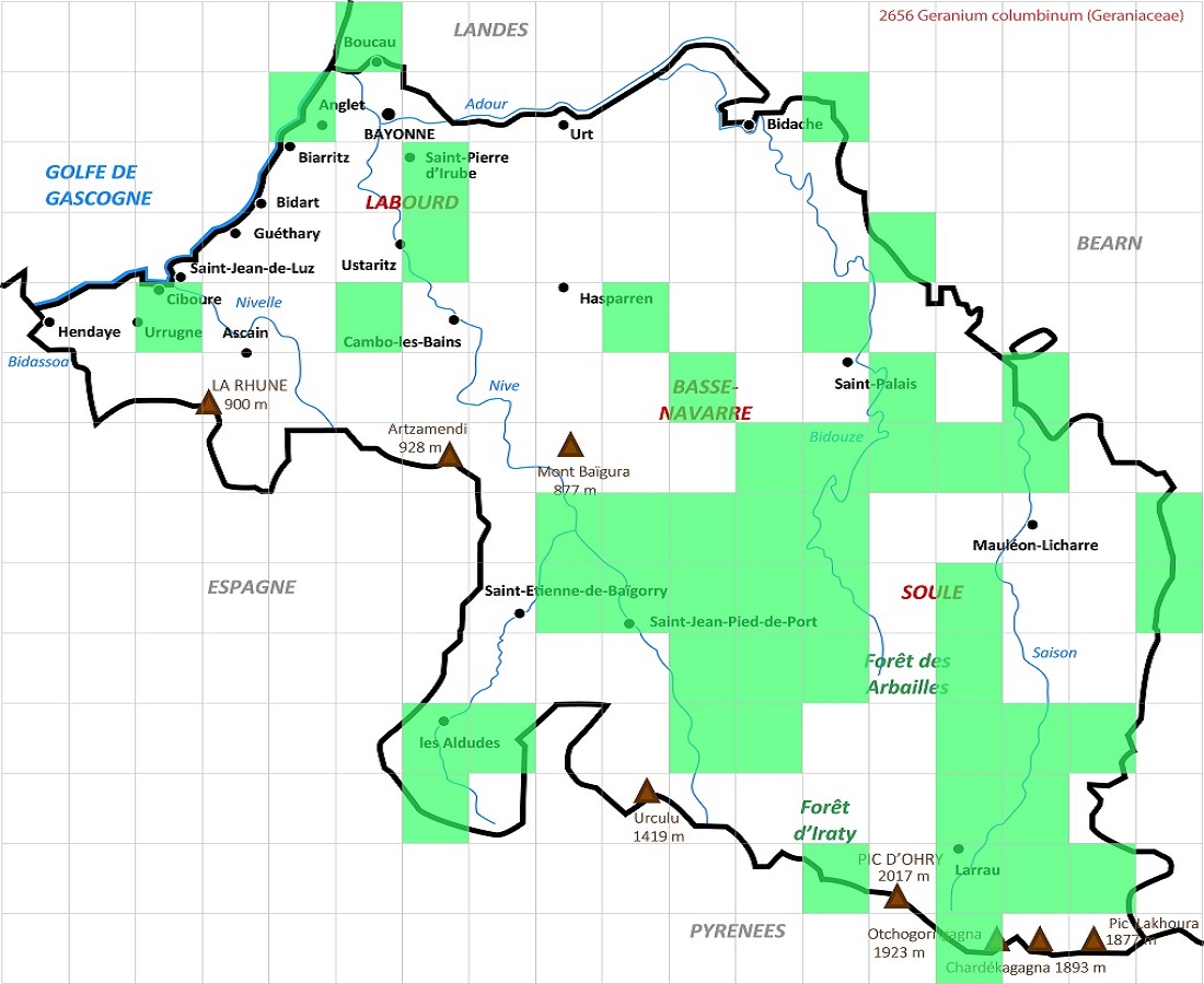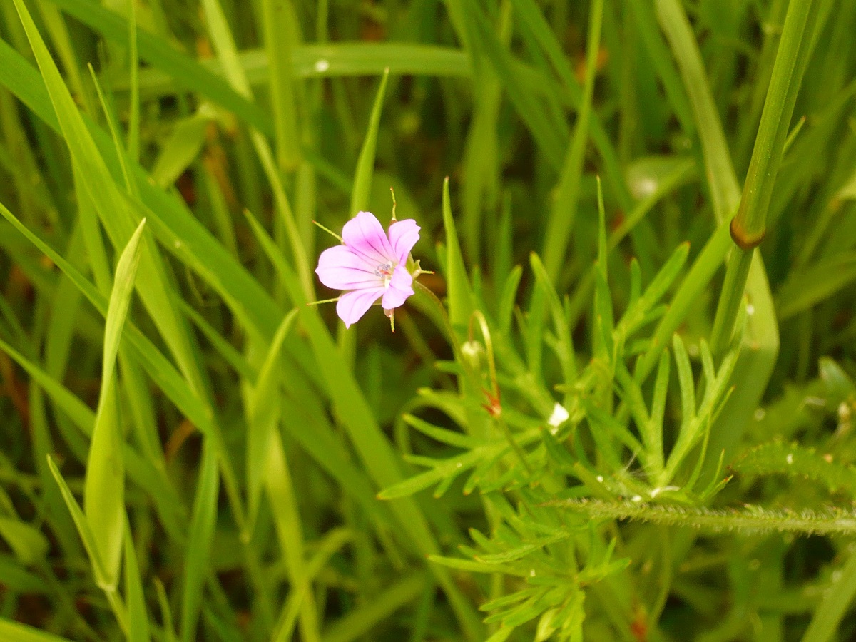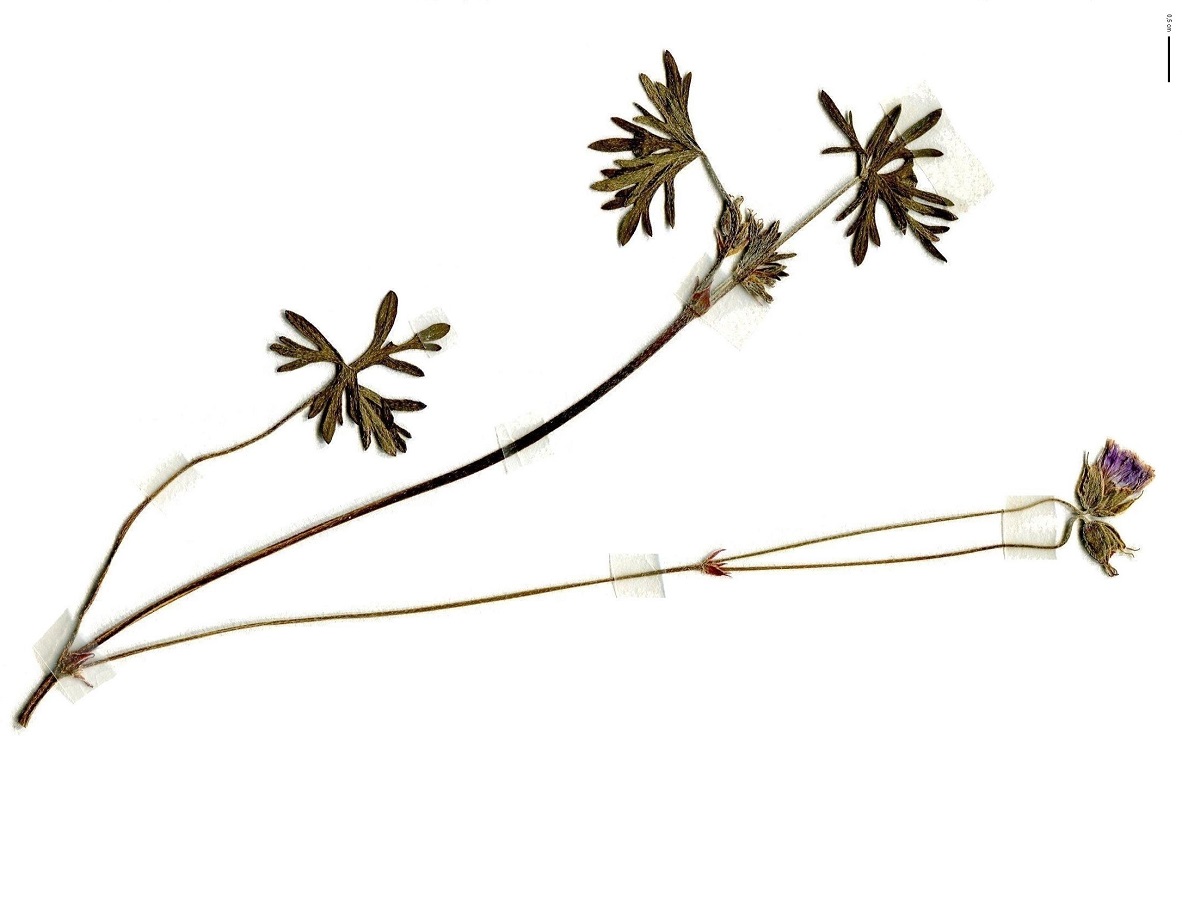 Th – 2-4 dm – Feuilles profondément divisées en segments ± linéaires – Fleurs à long pédicelle, à 5 pétales L de 7-10 mm rose pourpré, sépales aristés – Fruit et méricarpes glabres