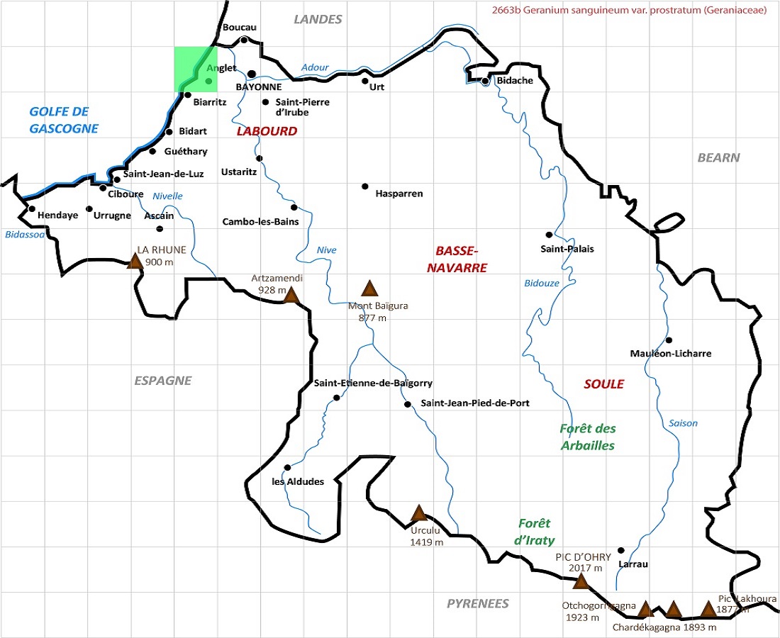 Hc – 0,5-1,5 dm – Prostré, feuilles divisées en segments réguliers ± étroits aigus – Fleur à court pédoncule, à 5 pétales de L ≃ 12-15 mm émarginés pourpre vif – Fruit à bec, méricarpes lisses