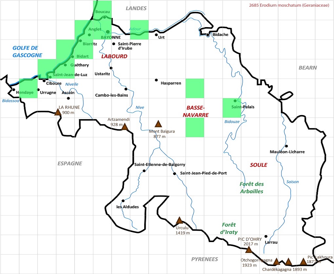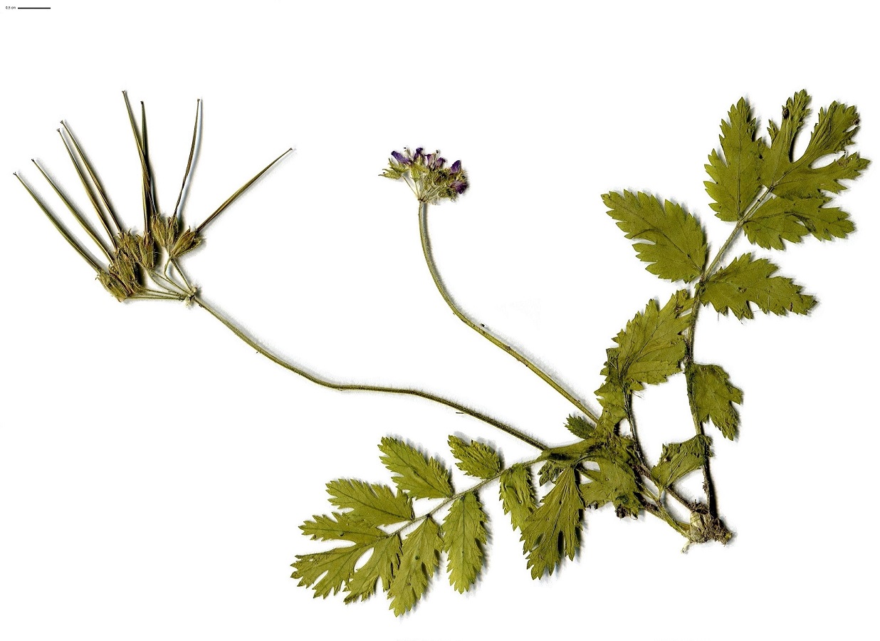 Th – 2-4 dm – Odeur de musc, feuilles pennées à segments ovales incisés-dentés – 4-8 Fleurs pédonculées, à 5 pétales L de 7-9 mm lilacés – Fruit à bec L de 2-4 cm, méricarpes sillonnés