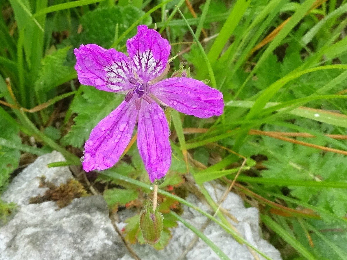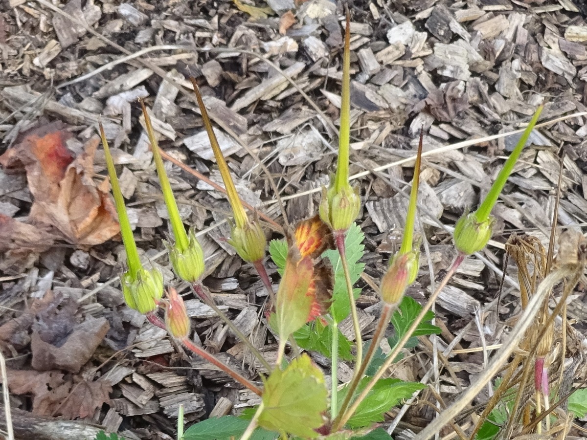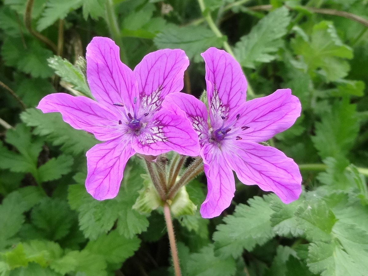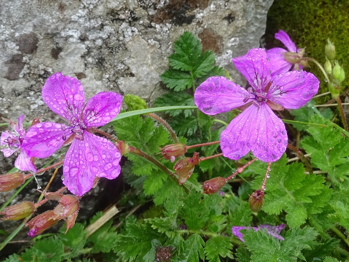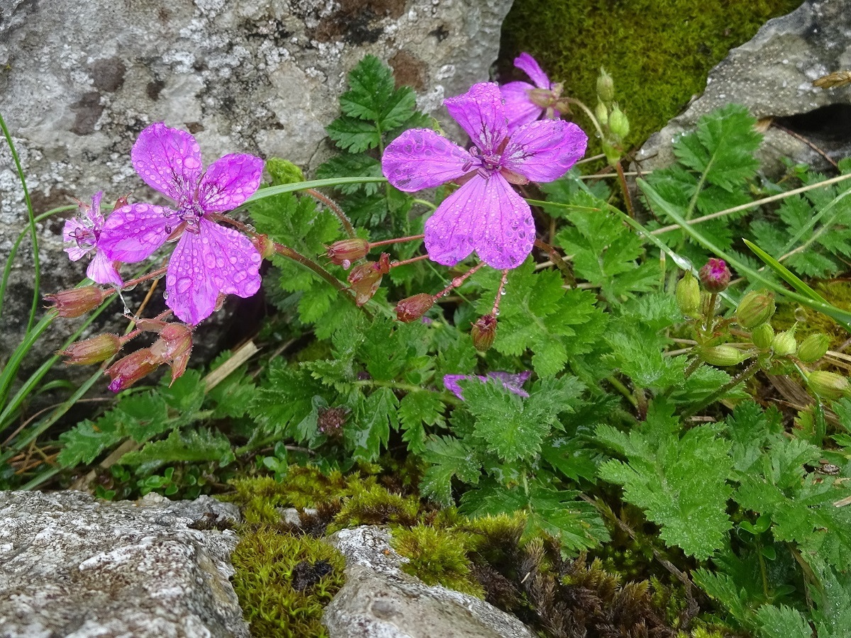 Hc – 2-4 dm – Acaule, velue glanduleuse, feuilles pennées à segments larges divisés incisés – Fleurs grandes à 5 pétales (L 1-2 cm) rose violacé – Fruit à bec (L 5-7 cm), méricarpes de L ≃ 1 cm