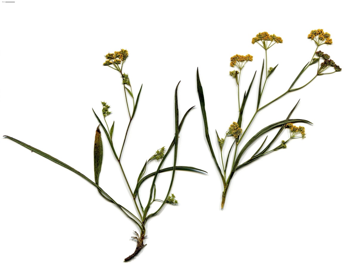 Hc – 2-4 dm – Feuilles linéaires-falciformes, les > atténuées à la base – Ombelles à 5-7 rayons, fleurs ≃ les bractéoles étroites lancéolées, jaunes – Fruit de L ≃ 3 mm ovoïde côtelé