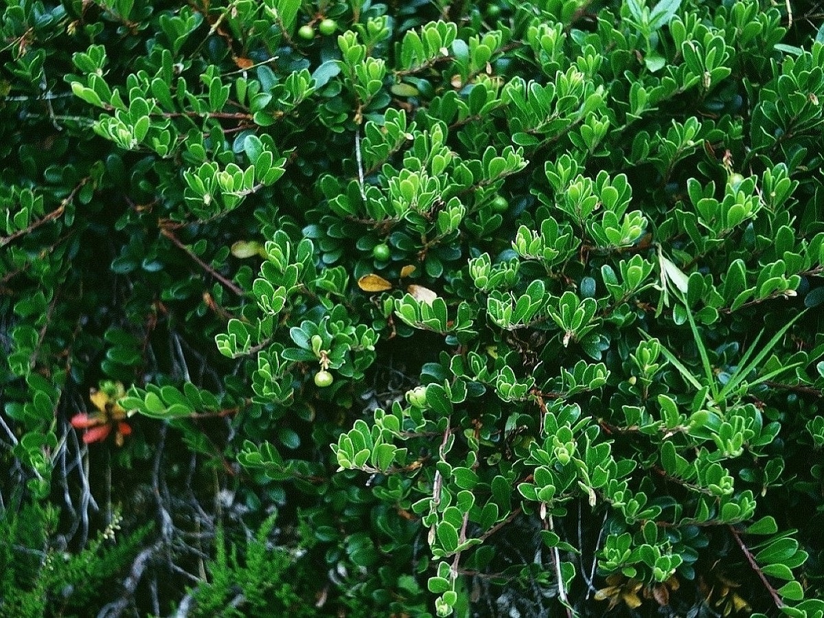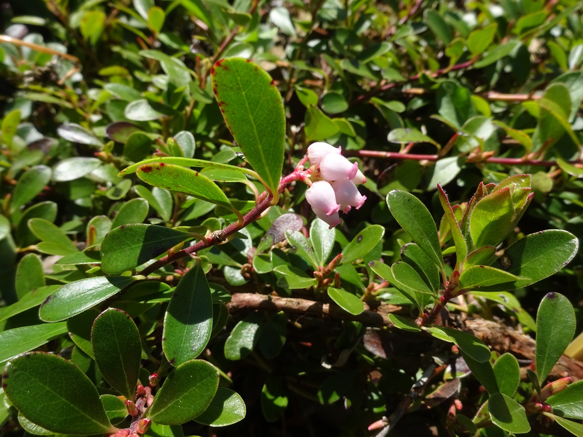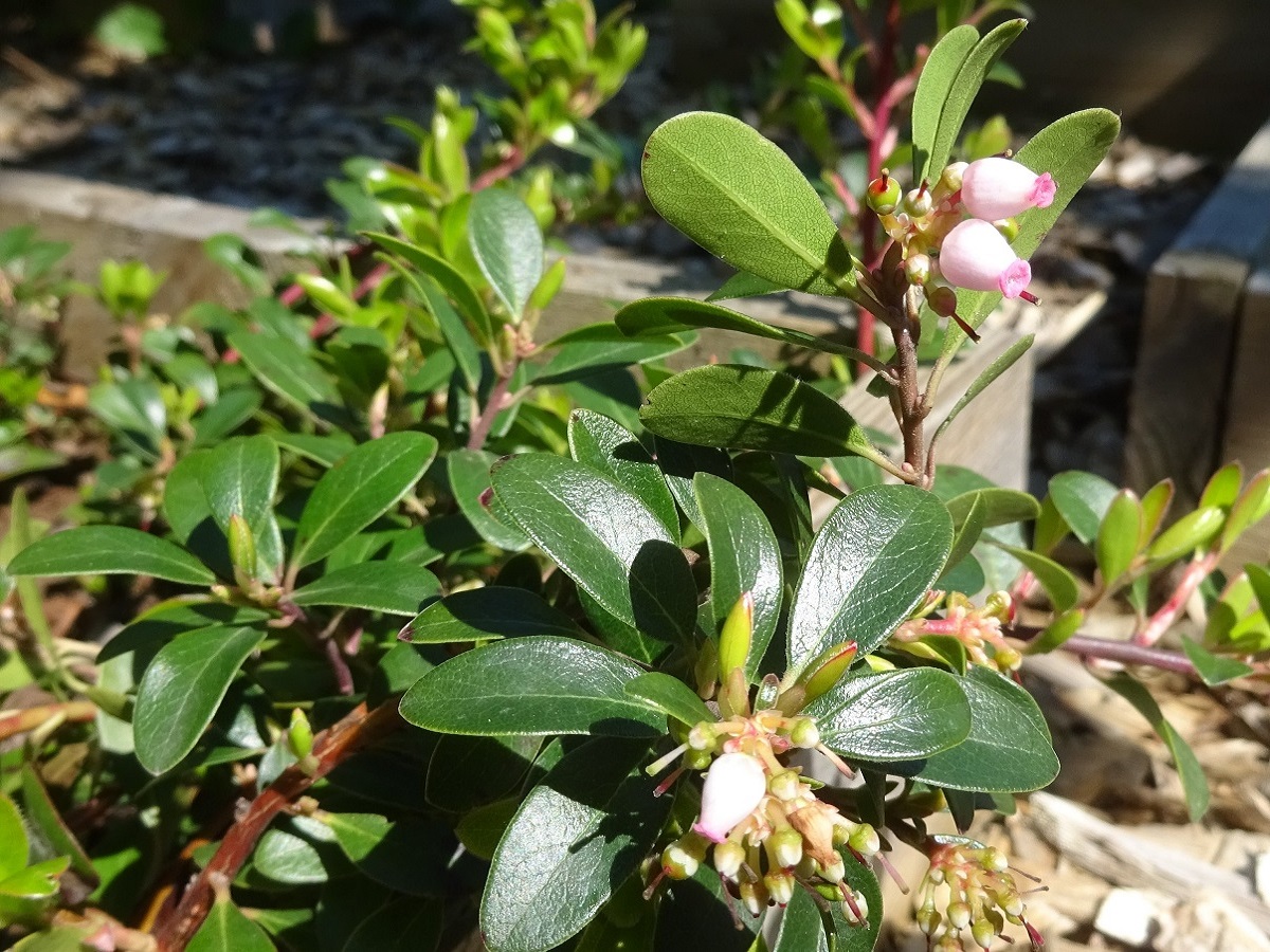 Ch – 2-4 dm – Feuilles L de 1,5-3 cm spatulées lisses, vernissées, entières – 3-12 Fleurs L de 5-6 mm en petit grelot blanc, à lobes courts rosés – Fruit sphérique de Ø ≃ 1 cm rouge