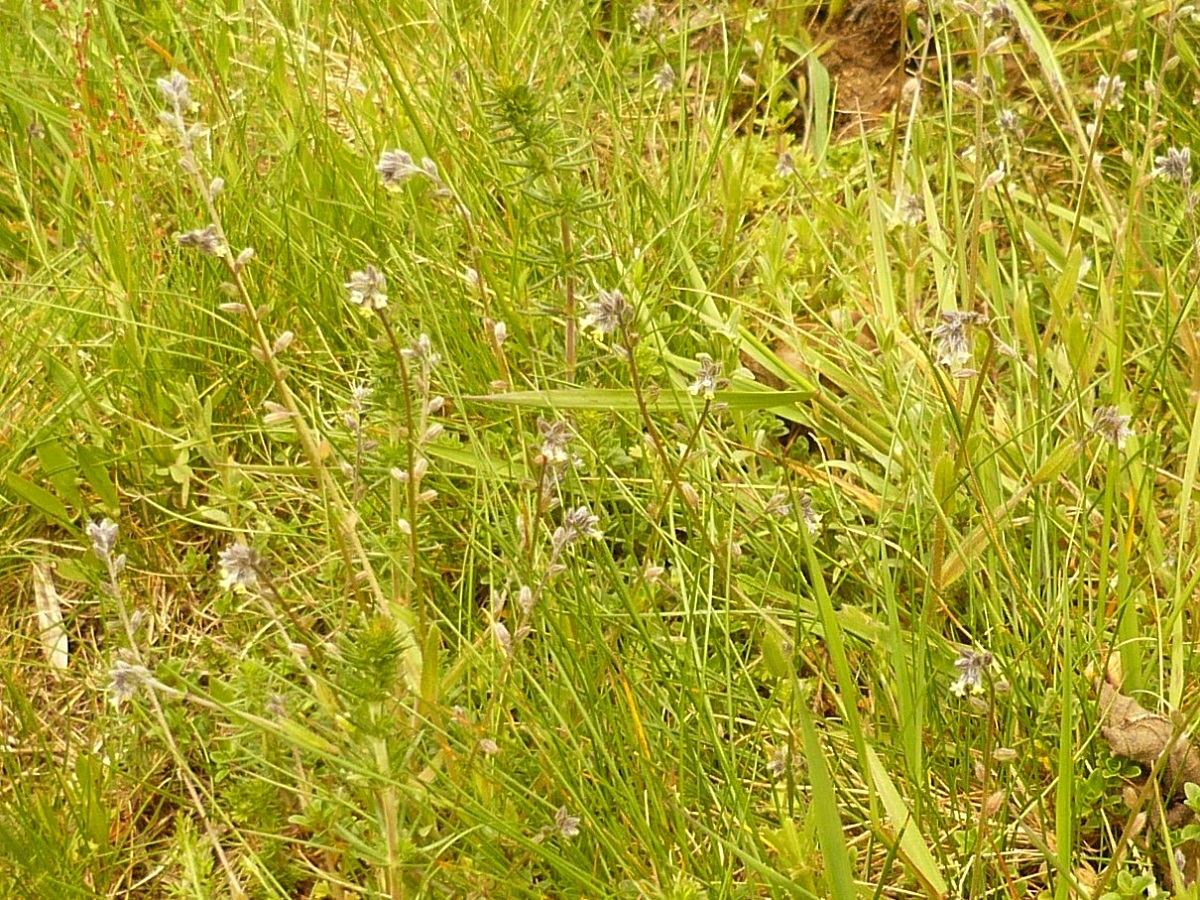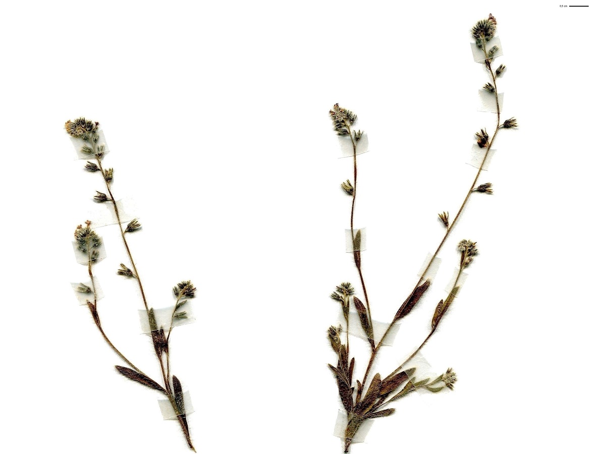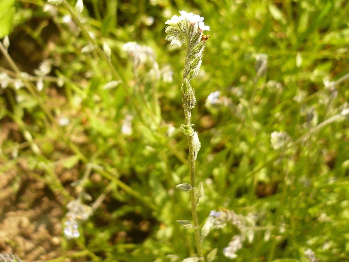 Th – 1-3 dm – Feuilles (L → 4 cm) oblongues à poils étalés – Cymes scorpioïdes ± feuillées, corolle (Ø 1,5-3 mm) jaune pâle puis bleue, pédicelle < au calice à poils crochus – Nucules ≃ 1,2 mm