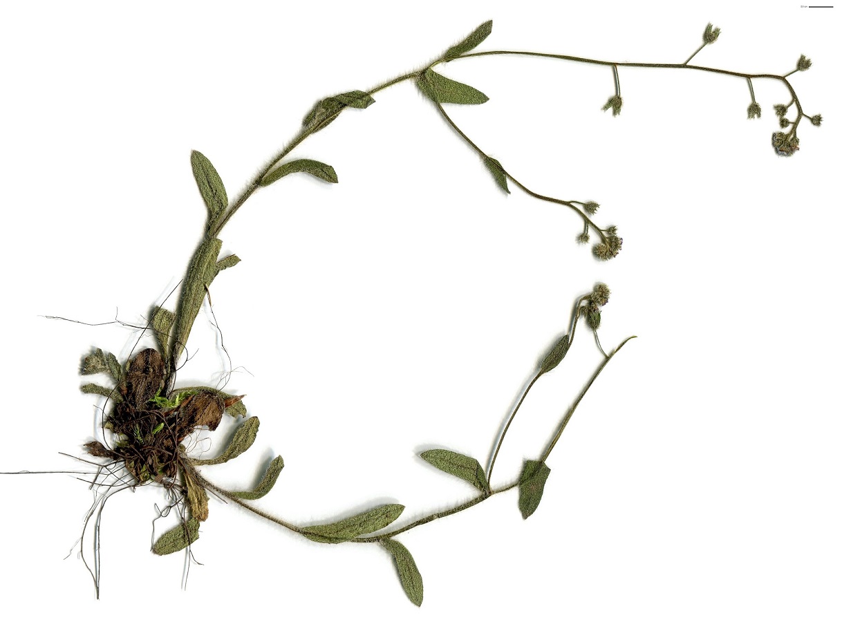 Th – 1-5 dm – Feuilles (L 4-8 cm) oblongues, à poils étalés – Cyme terminale nue, corolle (Ø 3-4 mm) bleue, pédicelle > au calice accrescent (7 mm) à poils crochus ≃ 0,6 mm – Nucules 1,7 mm