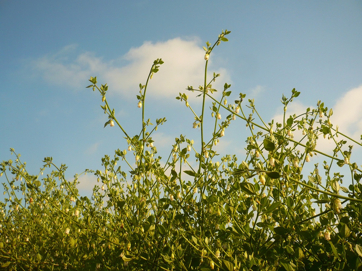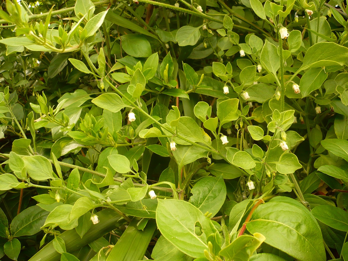 NPh – 5-30 dm – Sarmenteuse, feuilles L de 2-5 cm ovales rhombiques entières, pétiolées – Fleur blanc crème de L ≃ 1 cm en grelot à 5 lobes courts recourbés – Baie (L ≃ 1 cm) ovoïde crème