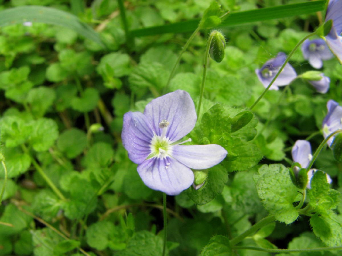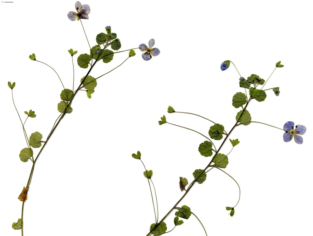Hc – 2-5 dm – Port couché, feuilles réniformes crénelées, opposées – Corolle de Ø 8-10 mm bleu-lilacé à centre pourpre, pédicelle fin >> à la feuille – Capsule (rare) bilobée à style long