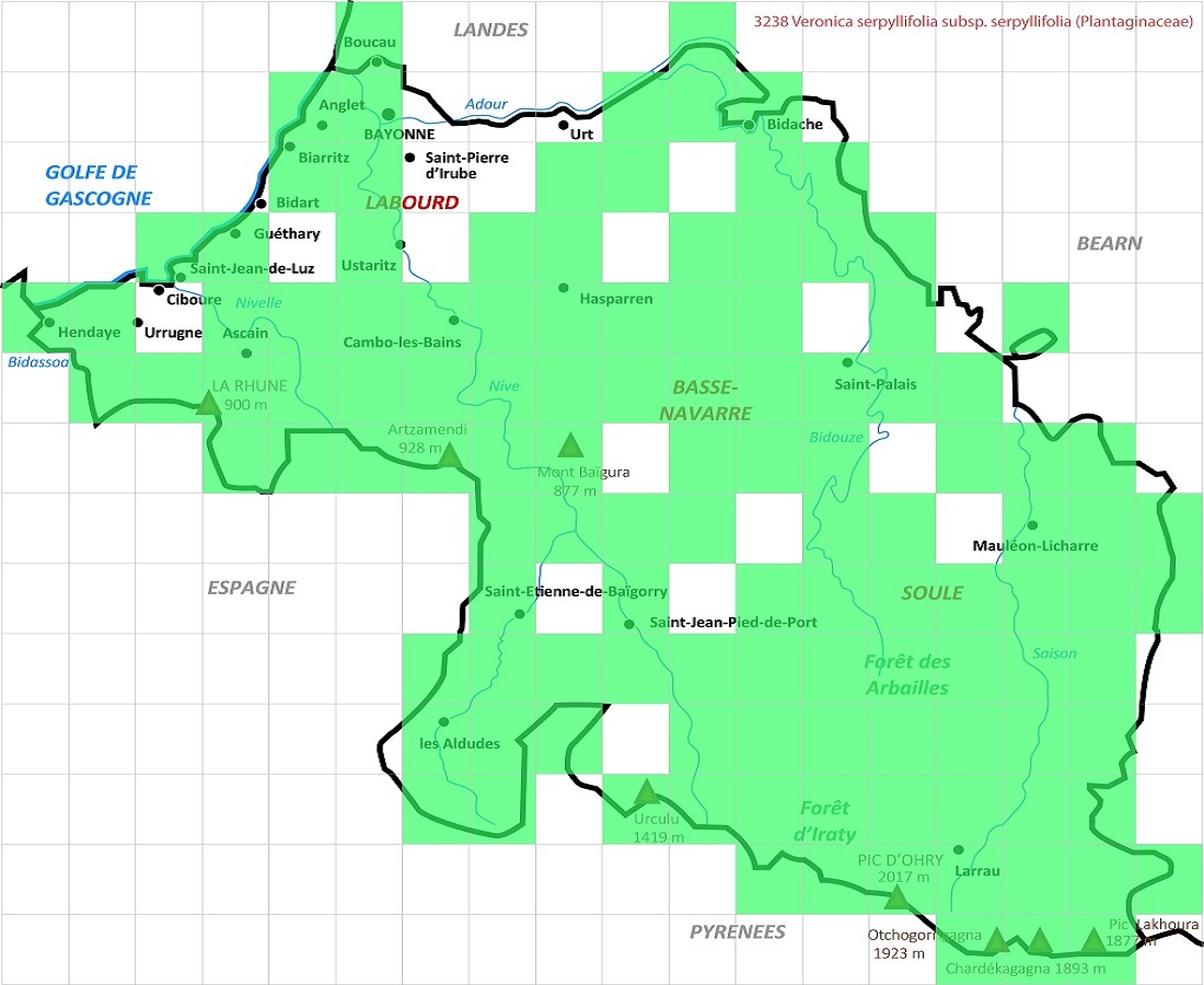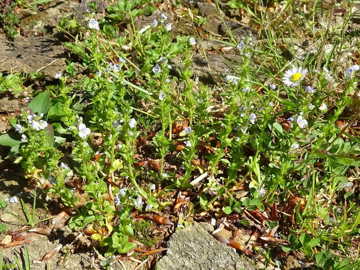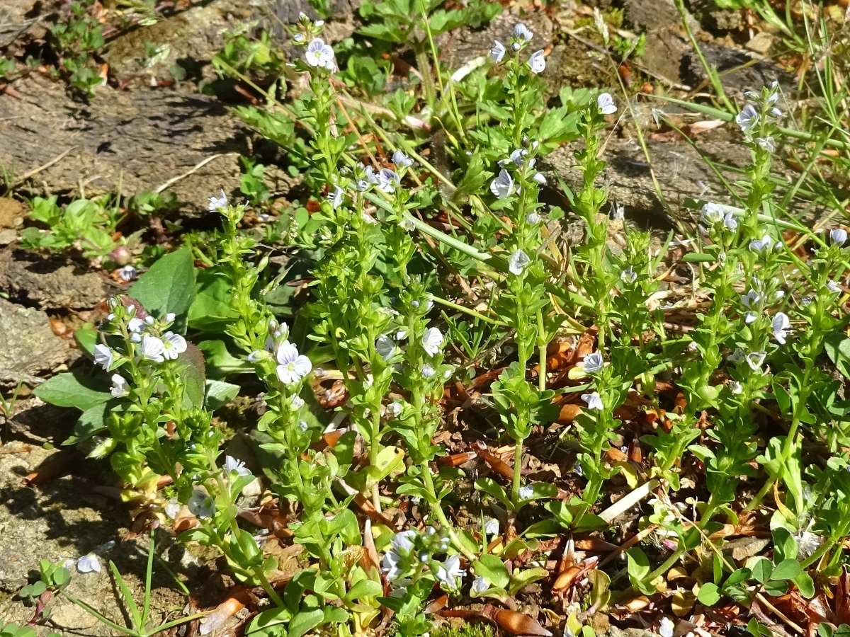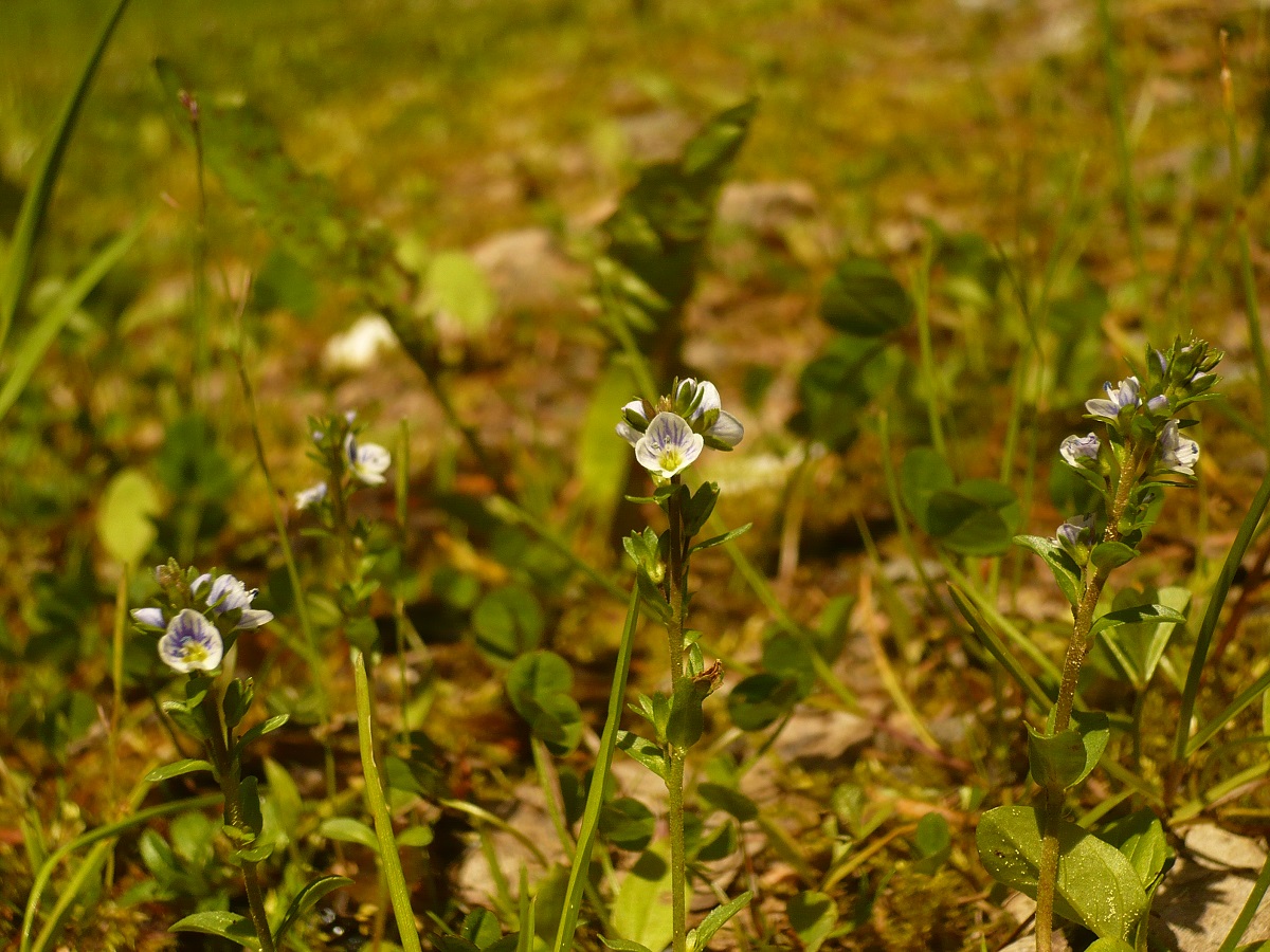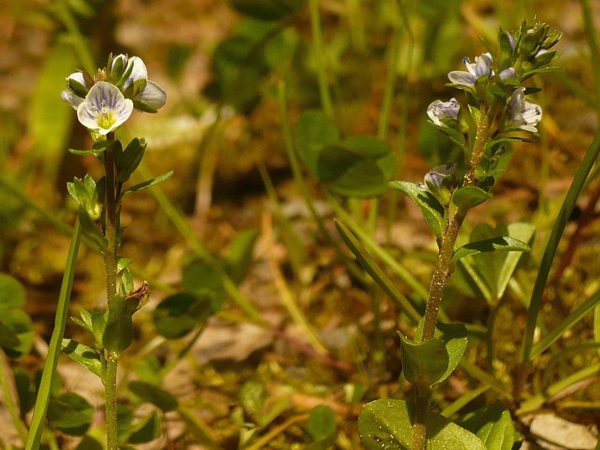 Hc – 1-2 dm – Tige rampante, feuilles petites ovales opposées ± pétiolées – Grappe dressée, corolle de Ø 4-6 mm bleutée à veines foncées, pédicelle ≃ au calice – Capsule à style long