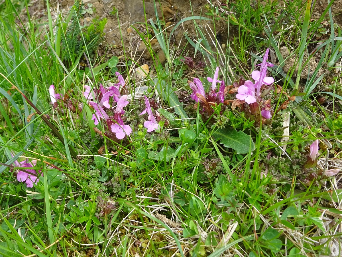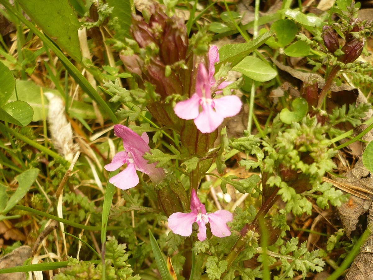 Hc SPar – 0,5-2 dm – Port ± étalé, feuilles pennées à segments crénelés – Corolle de L 1,5-2,5 cm rose ou rouge à casque un peu arqué ≥ à la lèvre inférieure glabre, calice glabre membraneux