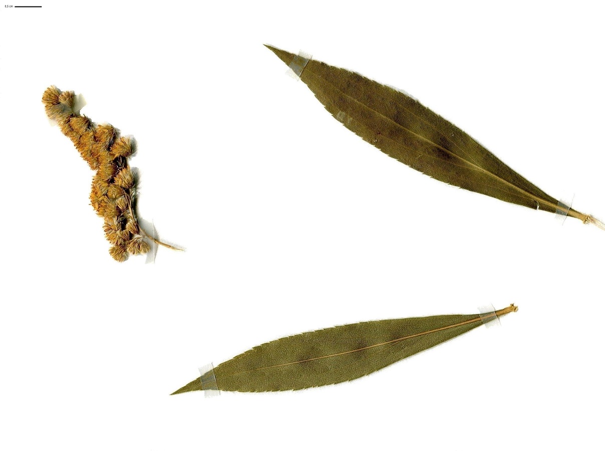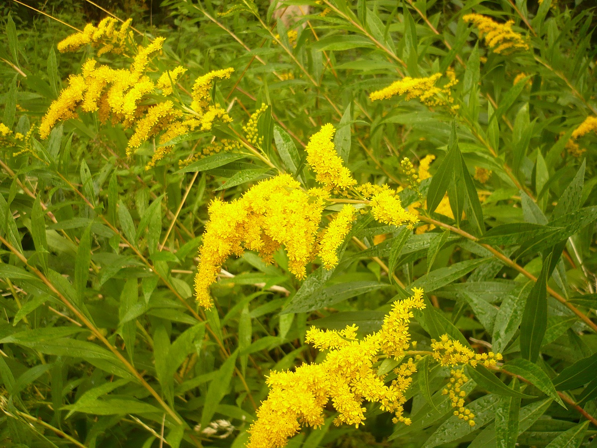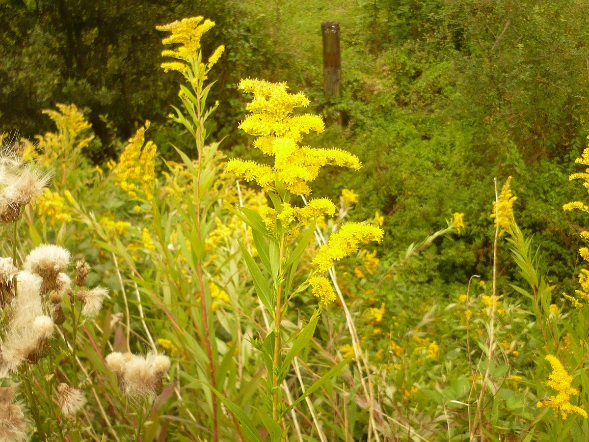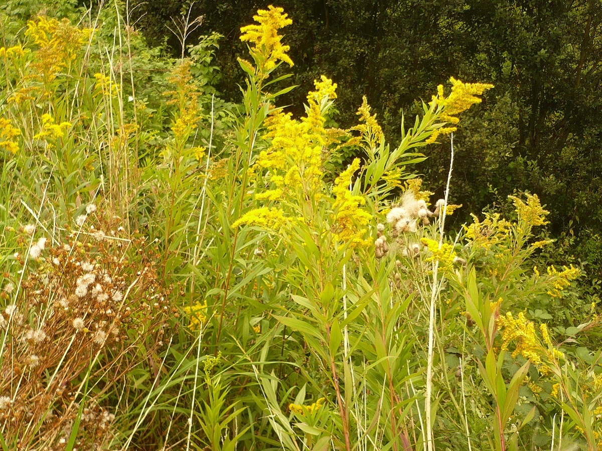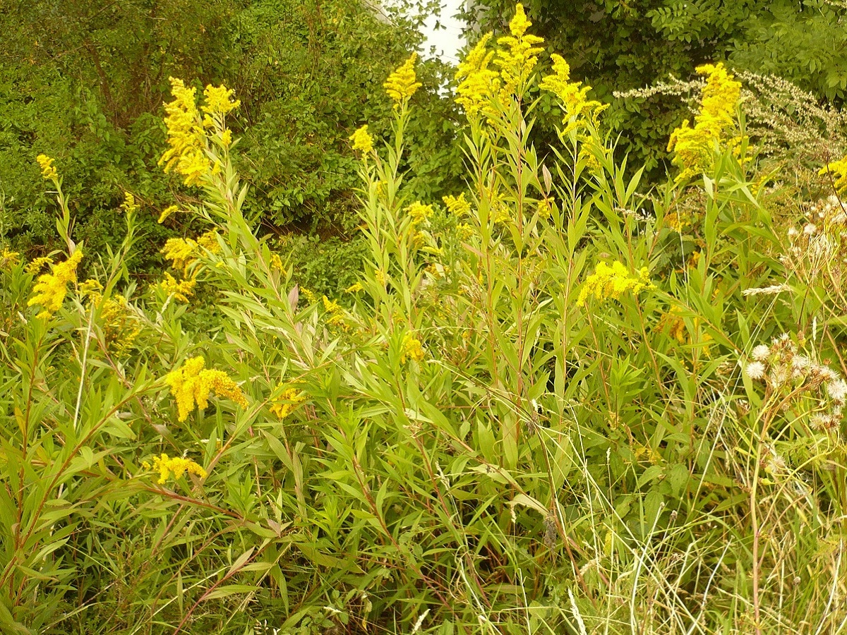 Hc – 0,5-2 m – Tige glauque et feuilles lancéolées dentées glabres – Panicule étalée, capitules unilatéraux, ½-ligules et fleurons en tube jaunes, involucre ≃ 4 mm – Akène < au pappus