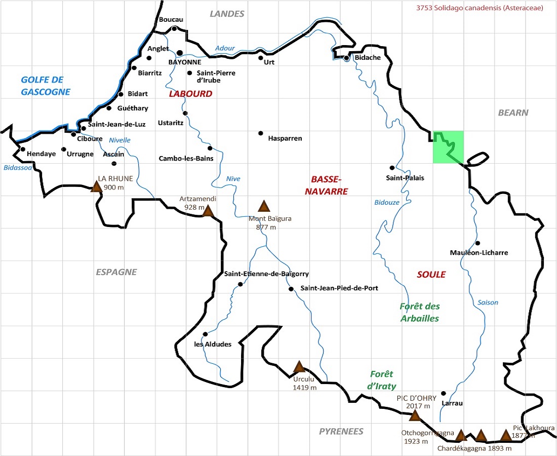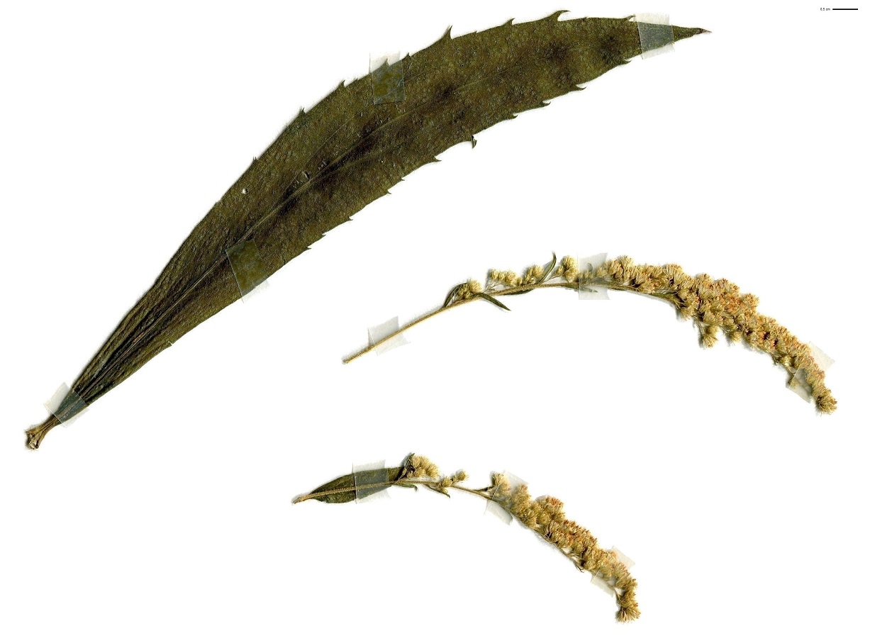 Hc – 1-2 m – Tige et feuilles, lancéolées dentées, velues – Panicule étalée, capitules unilatéraux, ½-ligules et fleurons en tube de L ≃ 2,5 mm jaunes, involucre ≃ 2,5 mm – Akène < au pappus