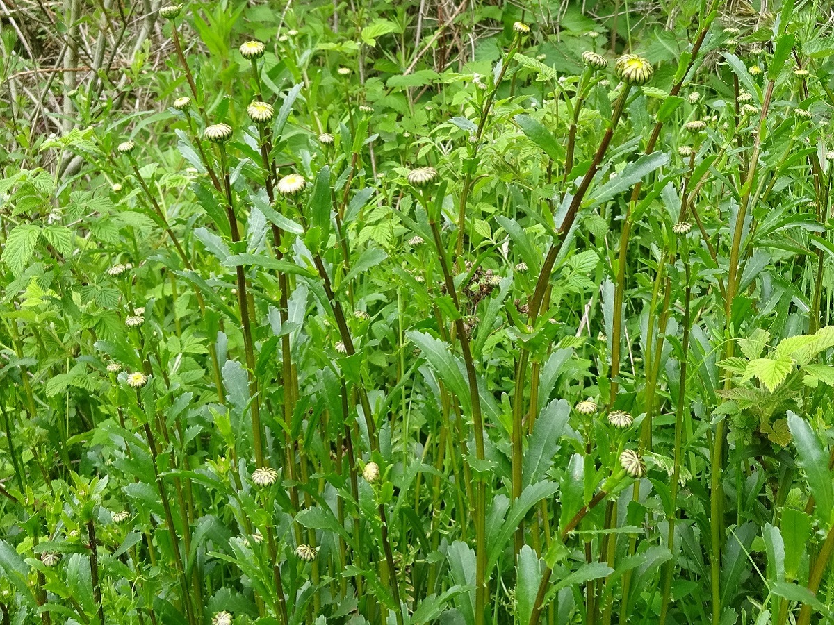 Hc – 4-8 dm – Dressée, feuilles > spatulées ± larges, dentées, à lobes basaux ± courts, aigus – Capitules de Ø 3-5 cm, disque jaune, ½-ligules blanches, bractées à liseré noir