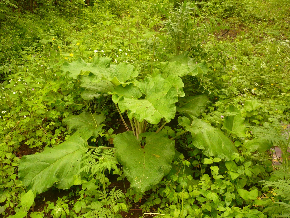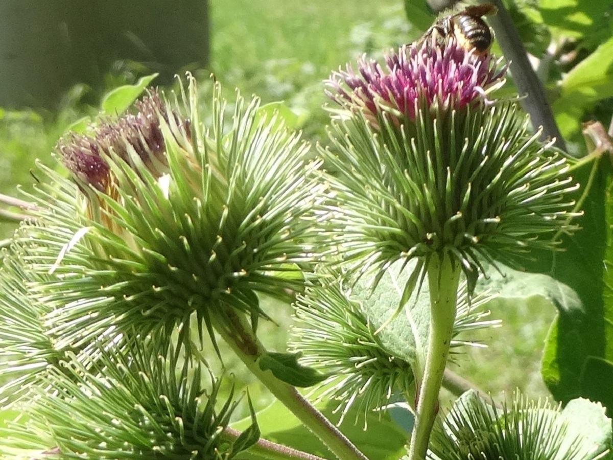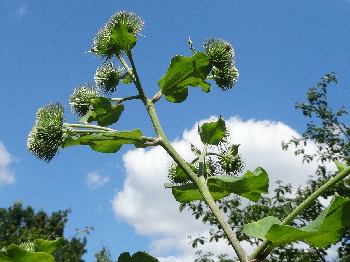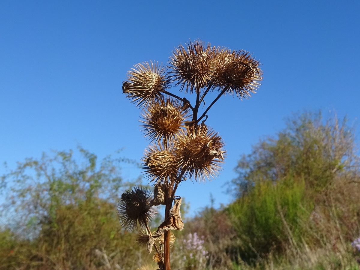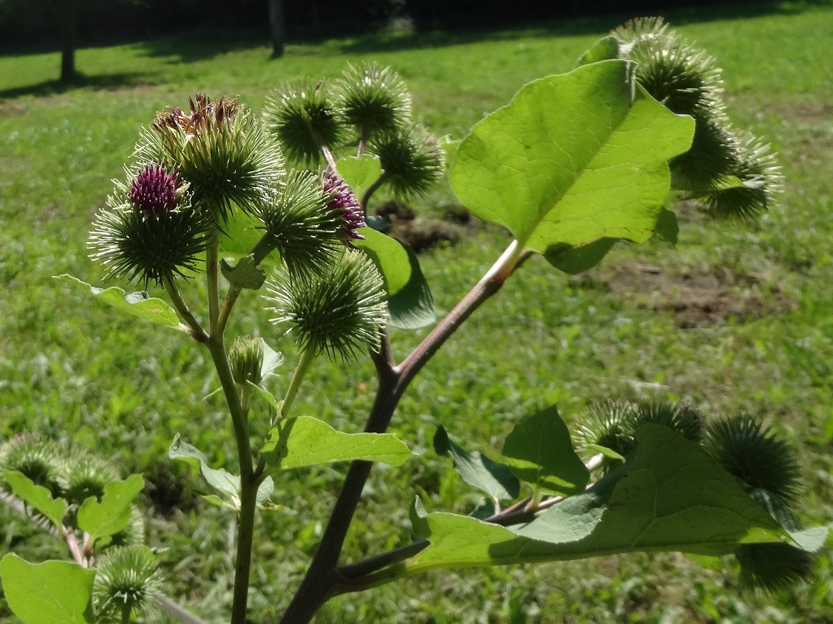 Hc – 1-2,5 m – Très robuste, feuilles larges ovales ± cordées, pétiole plein – Capitules globuleux de Ø 3-4 cm pédonculés, en corymbe, fleurons pourpres > aux bractées crochues glabres