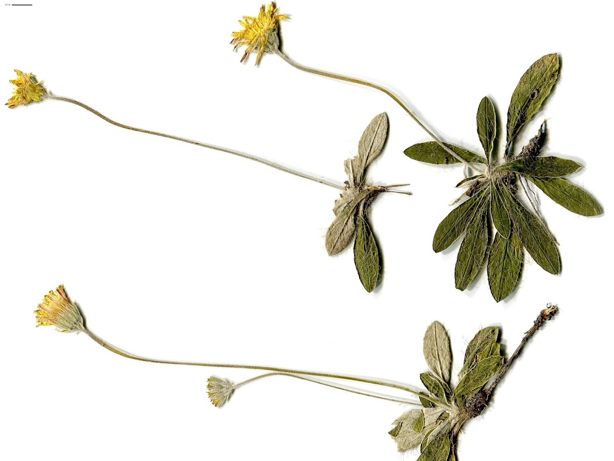 Hc – 1-3 dm – Feuilles basales obovales à longs poils, celles des stolons plus petites – Capitule de Ø ≃ 2 cm jaune, envers rougeâtre, bractées velues de l ≃ 1 mm à glandes ± foncées longues