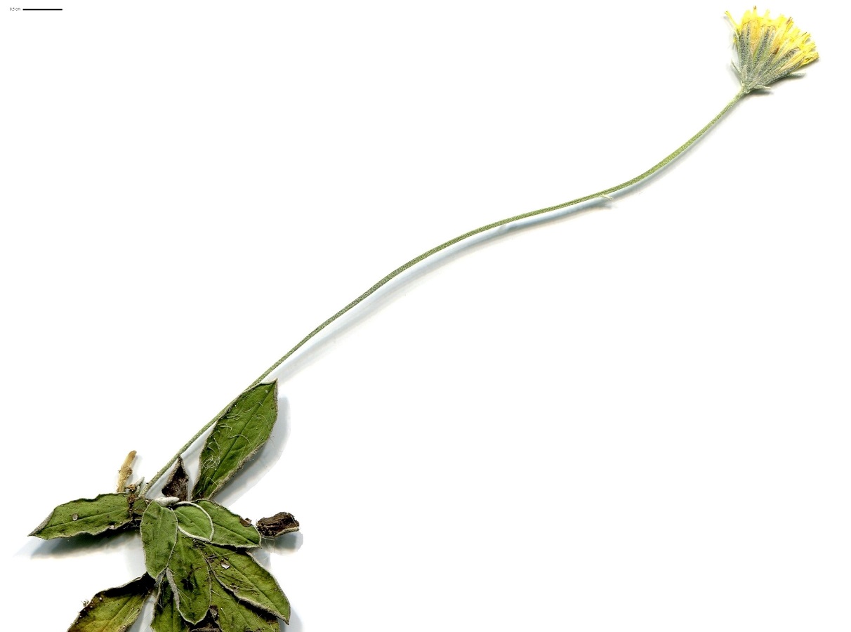 Hc – 1-2 dm – Feuilles basales obovales à longs poils, celles des stolons plus petites – Capitule de Ø 1,5-2 cm jaune pâle, bractées de l ≃ 1 mm velues blanches à peu près sans glandes noires