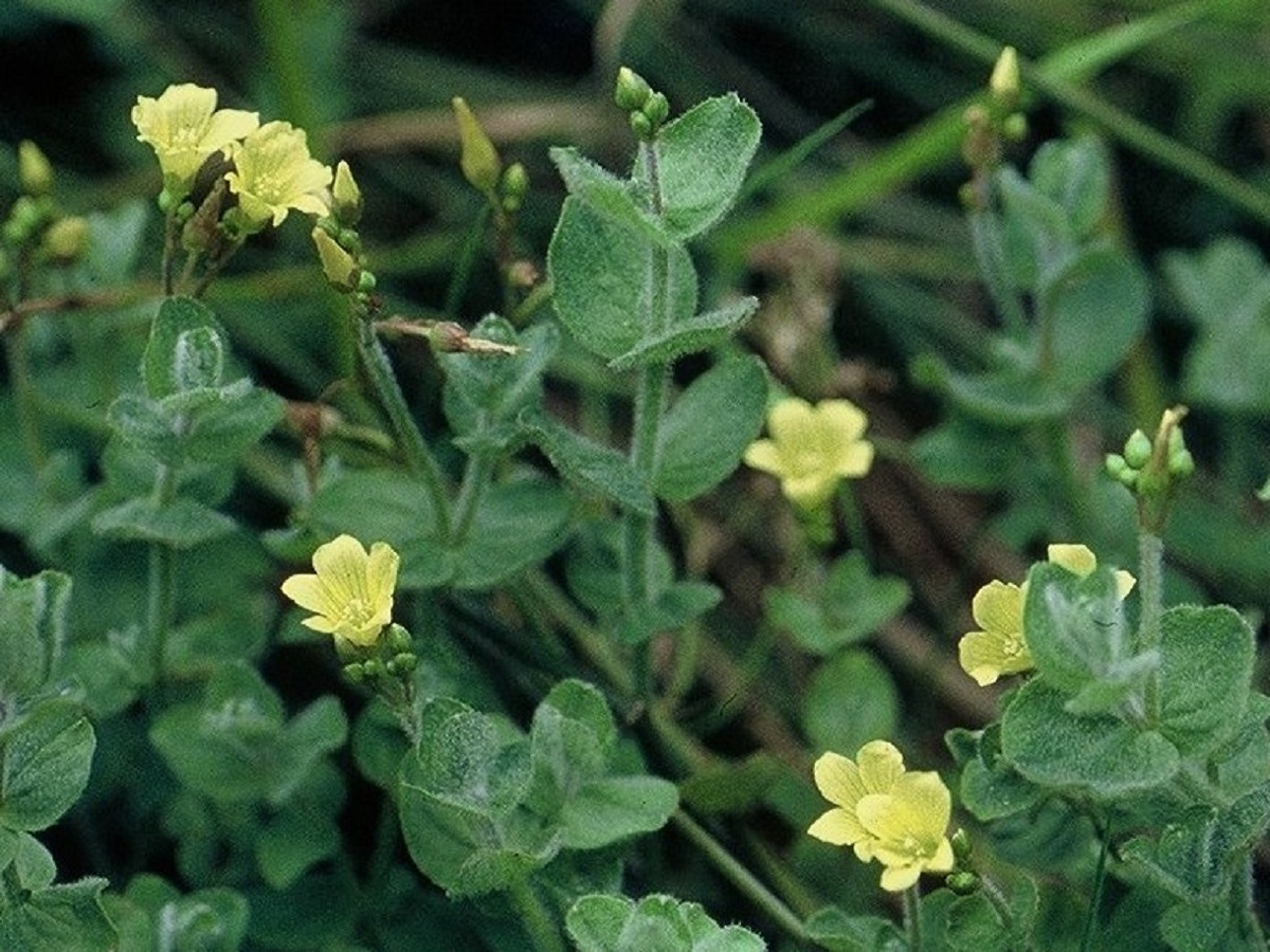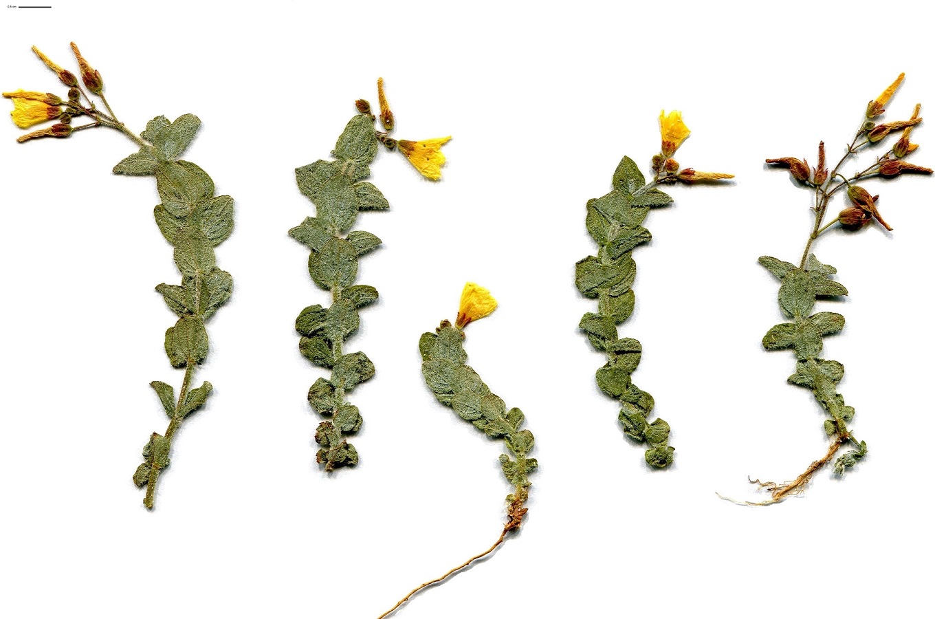 Hc/Hydr Hc – 1-4 dm – Feuilles velues grisâtres opposées ovales-arrondies à glandes translucides – Cyme pauciflore, fleurs à 5 pétales jaunes et sépales ciliés-glanduleux rougeâtres