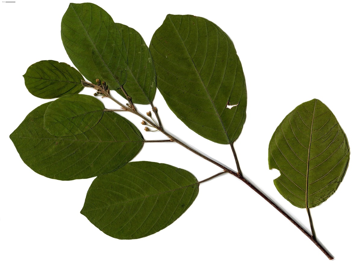 NPh – 2-4 m – Feuilles de L 2-7 cm ovales cuspidées, entières, nervures arquées saillantes – Fleurs axillaires verdâtres, calice à 5 lobes – Fruit sphérique de Ø 6-10 mm rouge puis noir