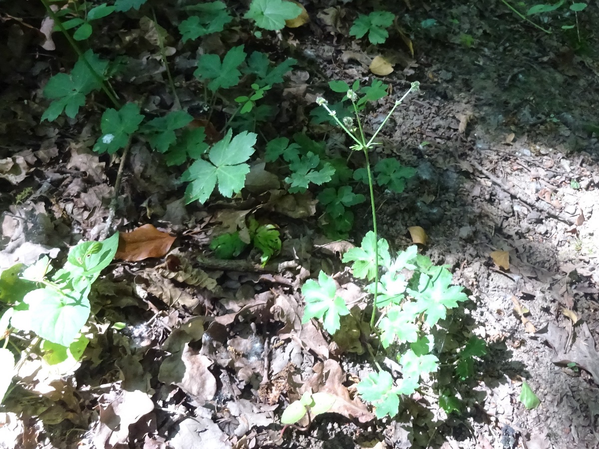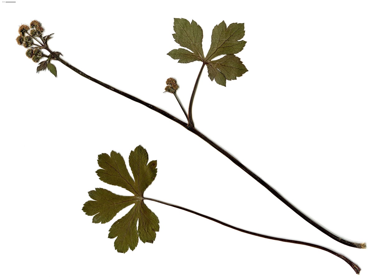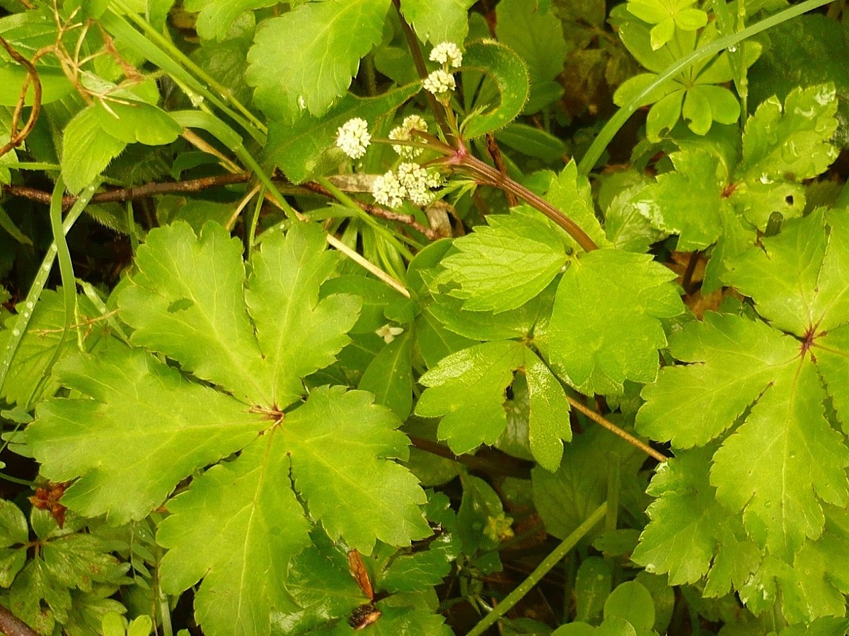 Hc – 2-5 dm – Feuilles (L 6-10 cm) palmées à 3-5 lobes obtus ± incisés, luisantes dessous – Fleurs en petites têtes globuleuses blanches ou rosées – Fruit (Ø 4-5 mm) à aiguillons crochus