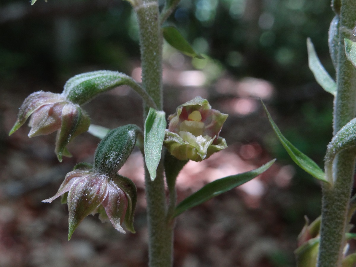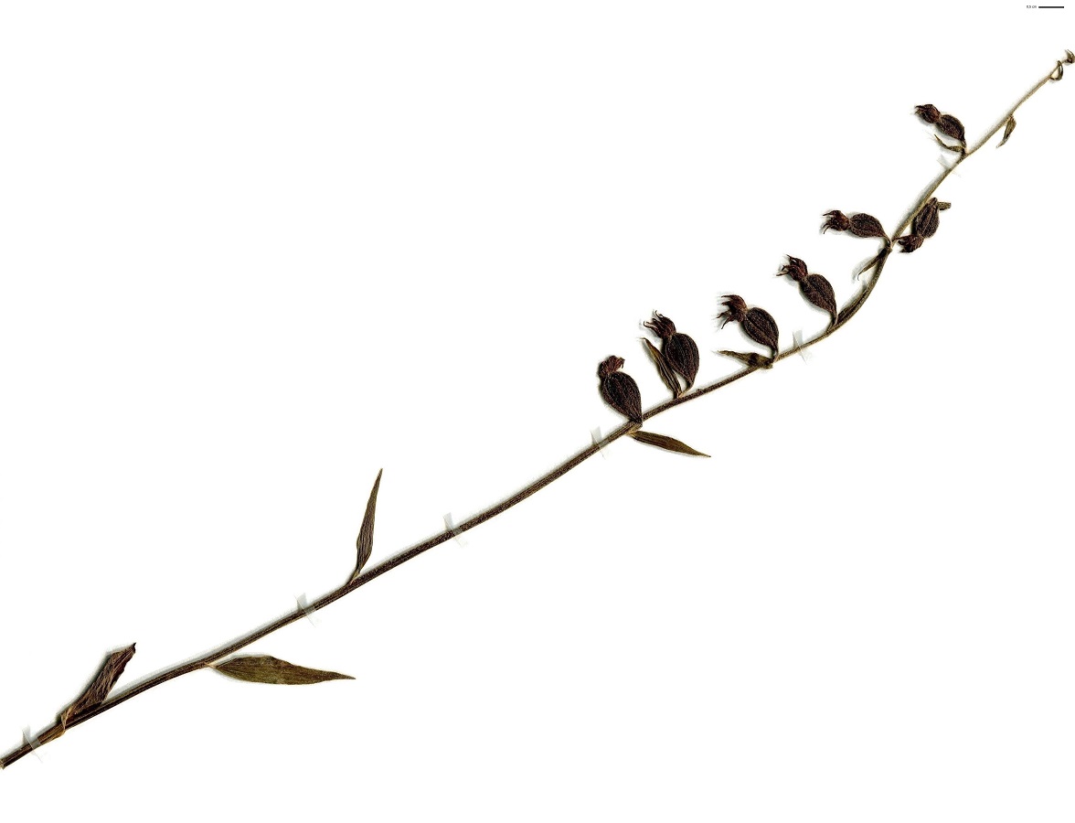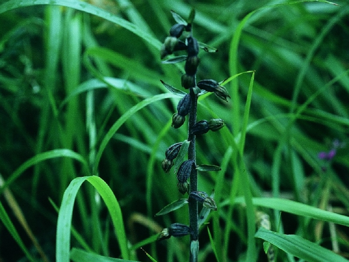 G à rhizome – 2-4 dm – Tige velue, feuilles lancéolées courtes – Grappe lâche de petites fleurs à odeur de vanille, labelle blanc, tépales de L ≃ 7 mm verts et pourpres, bractée ≃ la fleur <