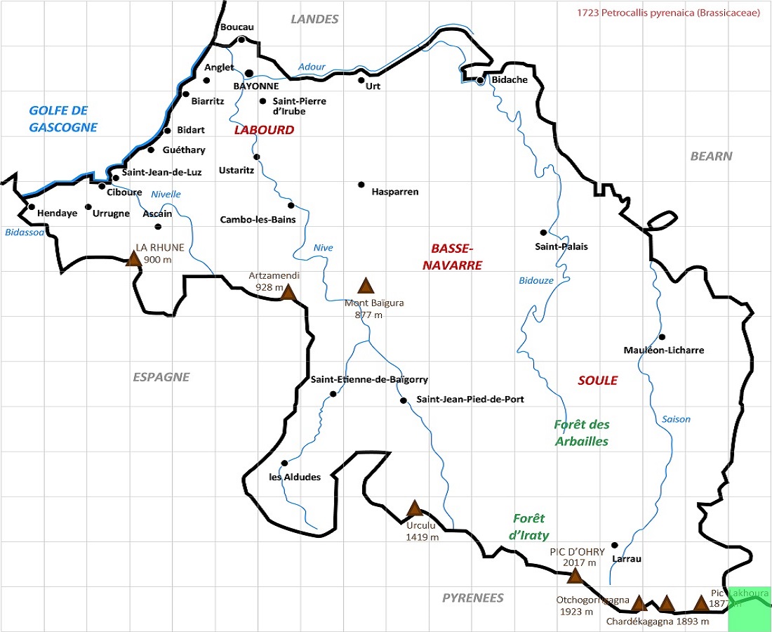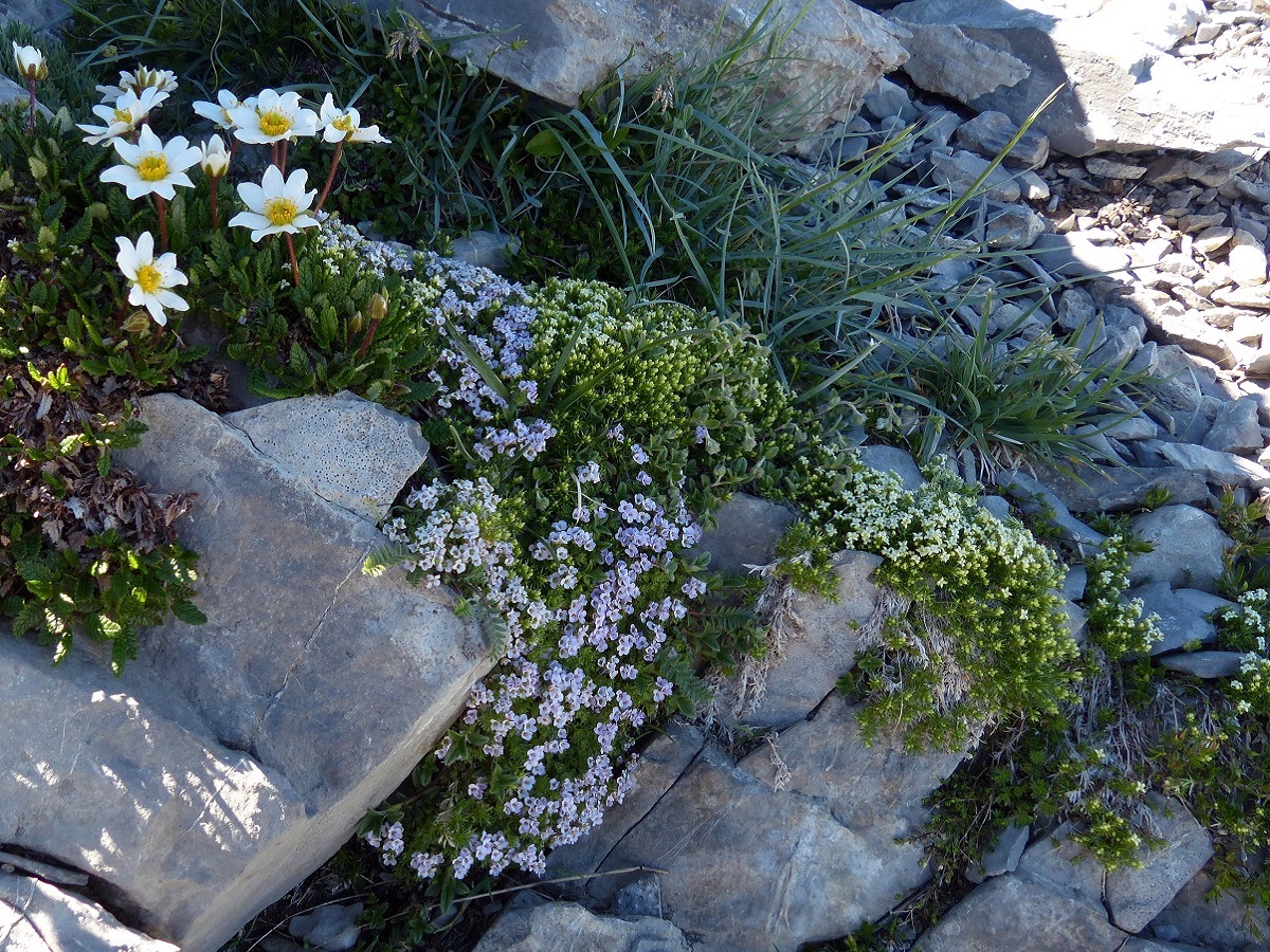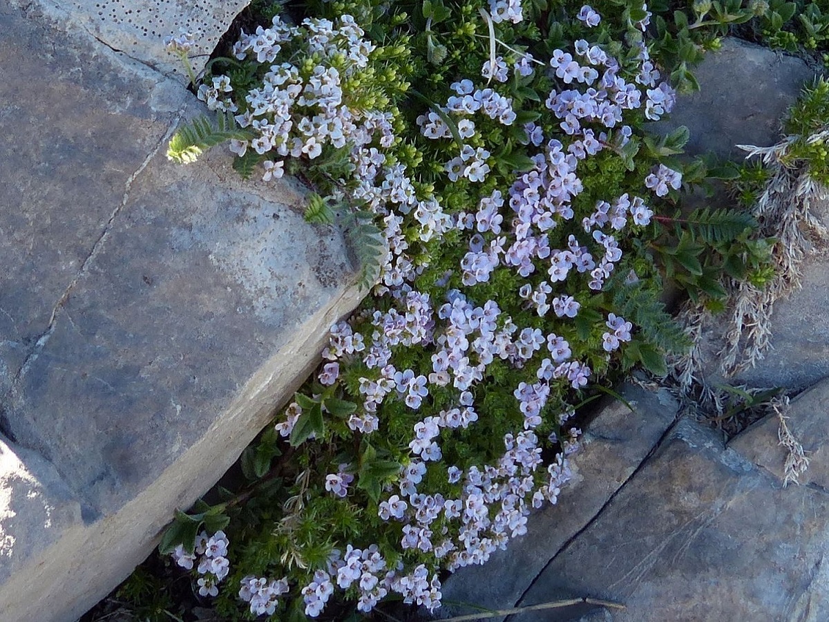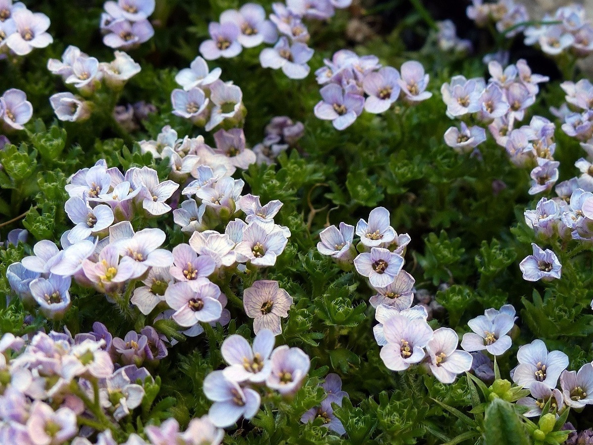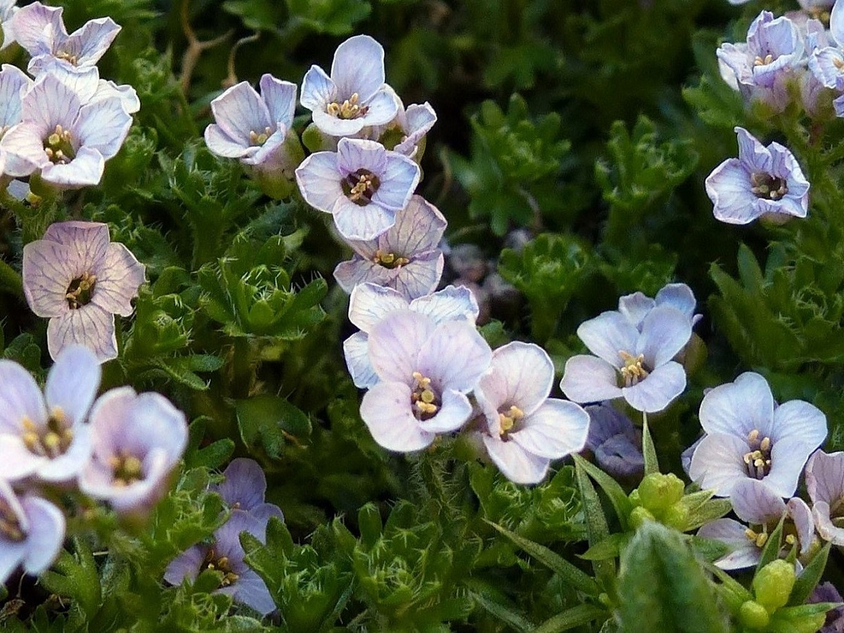 Ch – 3-6 cm – En coussinet, feuilles en rosette cunéiformes trifides, ciliées – 2-4 Fleurs terminales à 4 pétales L de 4-5 mm rose-lilas veinés de plus foncé – Silicules ovales dressées, style net