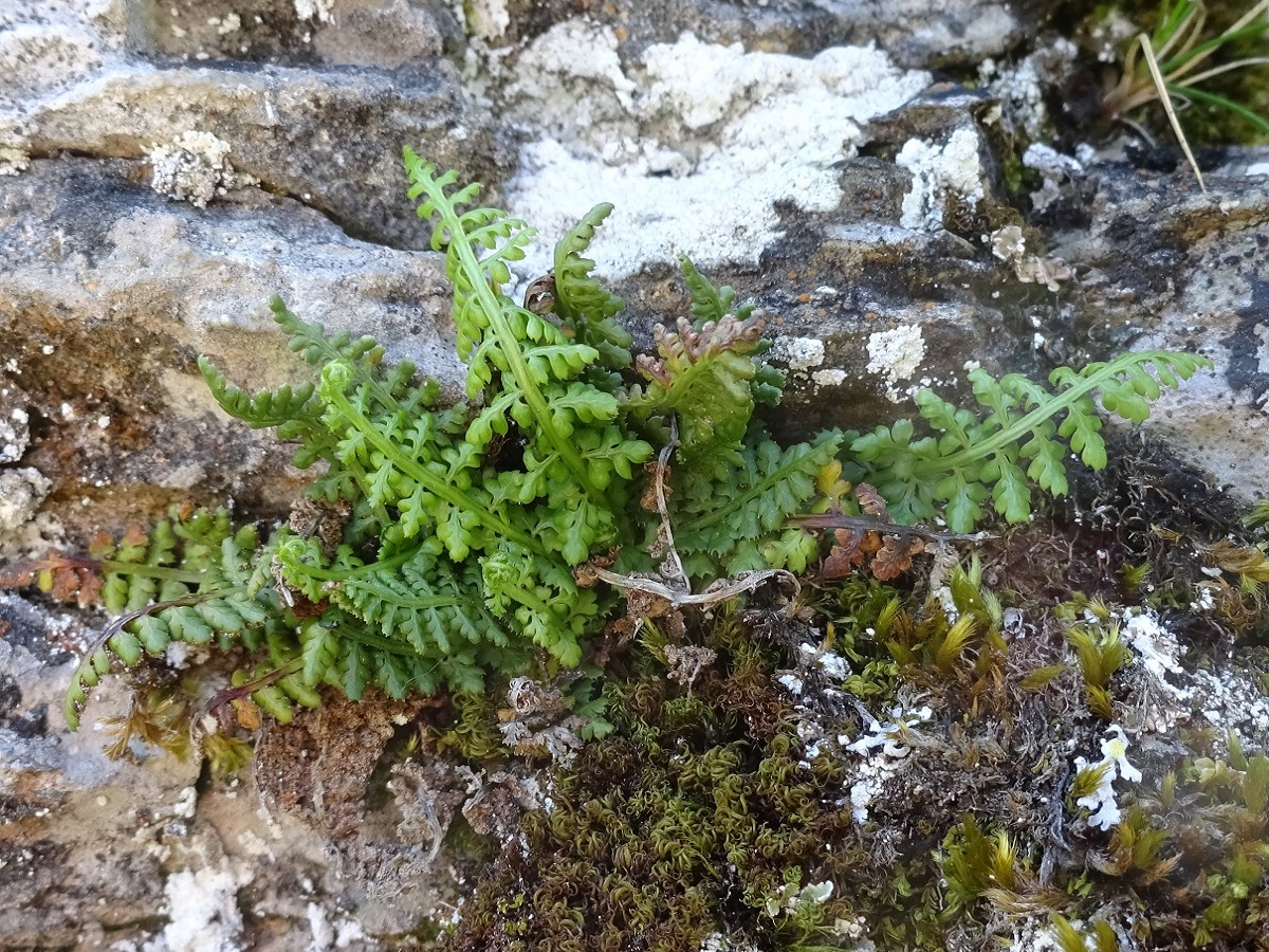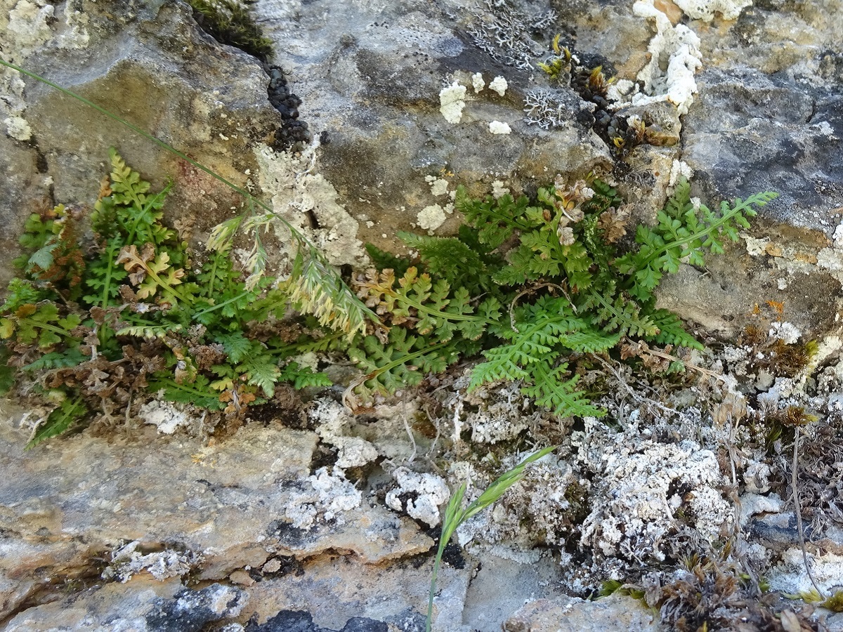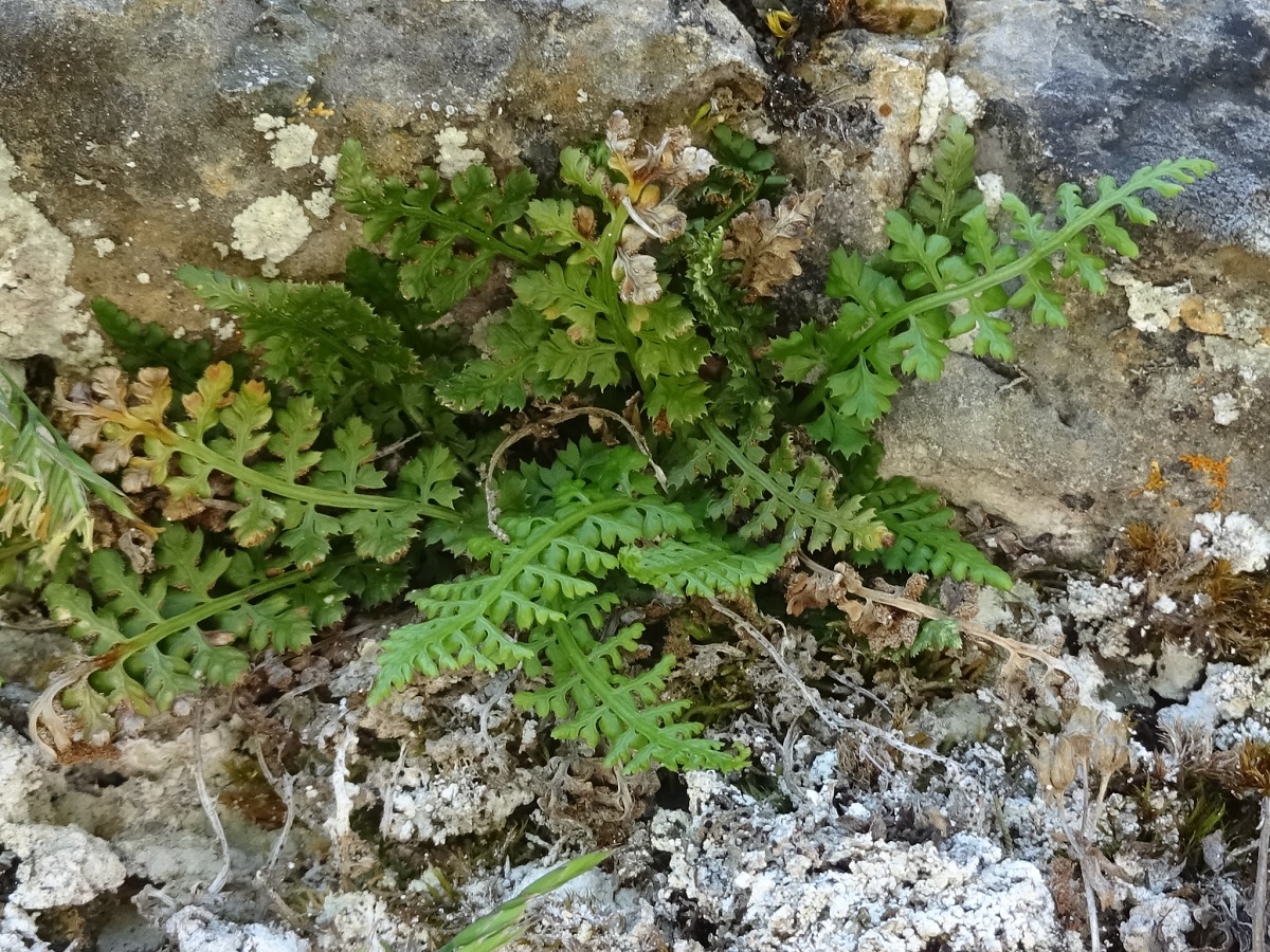 Hc – 0,5-2 dm – Limbe allongé étroit, très réduit à la base, pennes obovales, à dents divariquées mucronées-aristées, pétiole court brun à la base – Sores bruns axiaux ± confluents