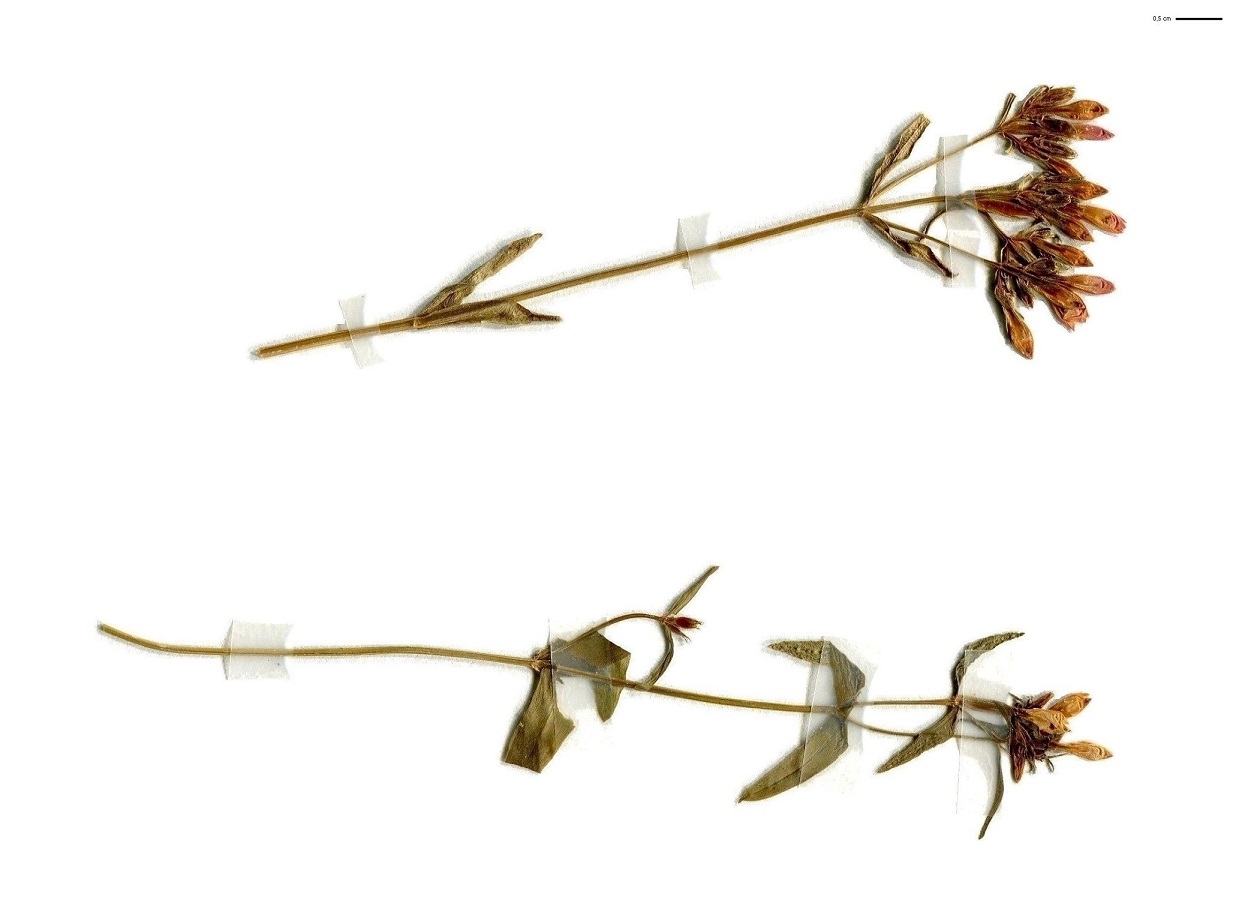 Hc – 1-5 dm – Tige non ailée, feuilles < en rosette (L 1-3 cm) ovales obtuses, les > + petites opposées lancéolées – Corymbe lâche, corolle rose carné à 5 lobes (L 5-6 mm), pédicelle (L < 1 mm)