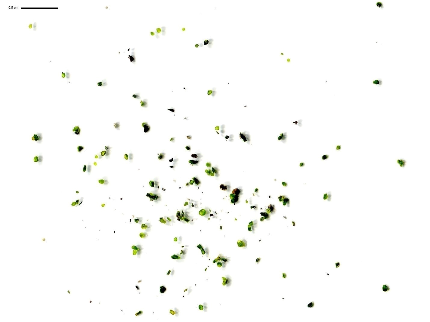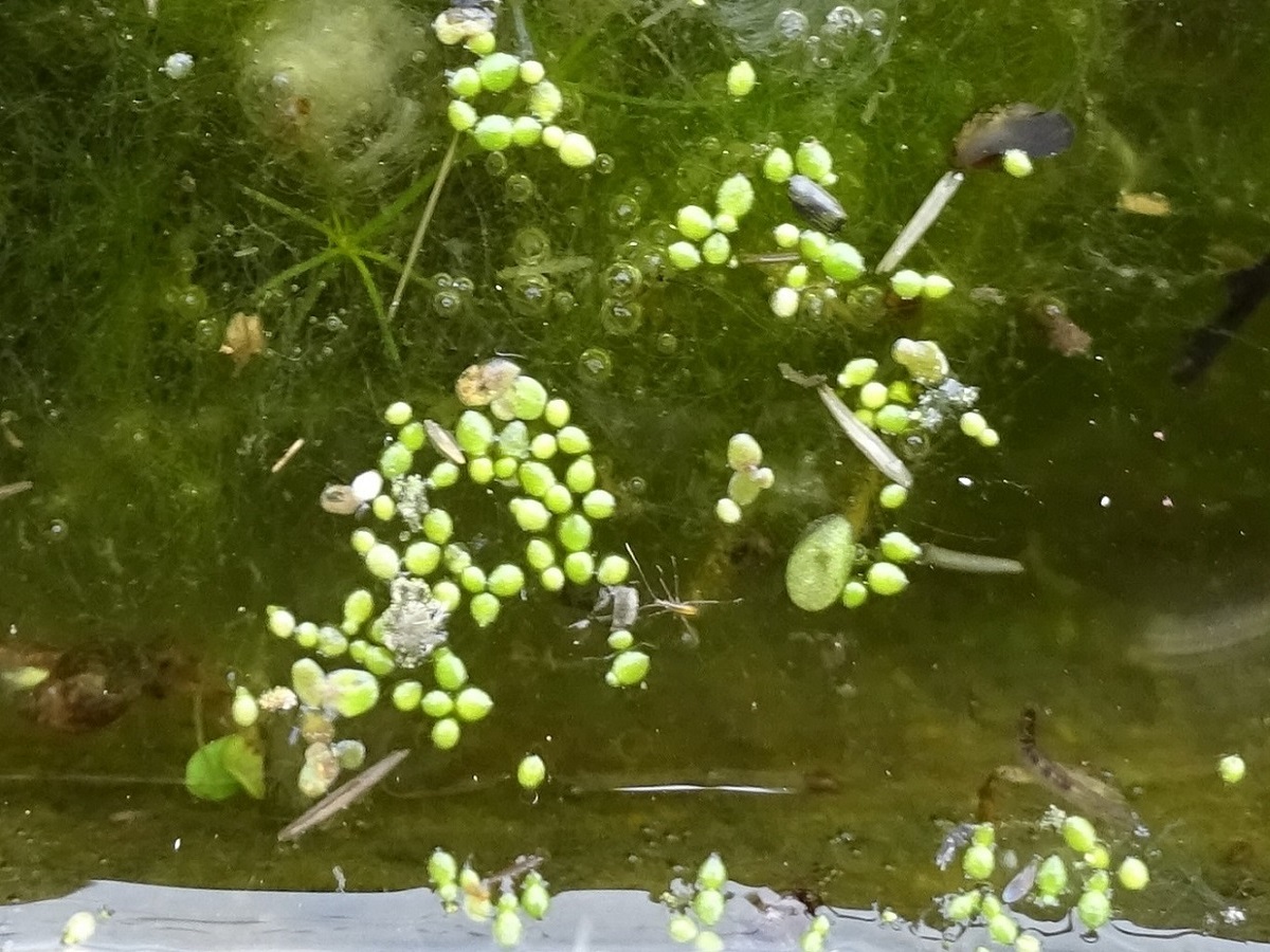 Hydr Th – 0,5-1 mm – Frondes flottantes hémisphériques minuscules de Ø 0,5-1 mm, sans nervure, sans racine – En colonies, souvent mêlé aux autres lentilles d’eau