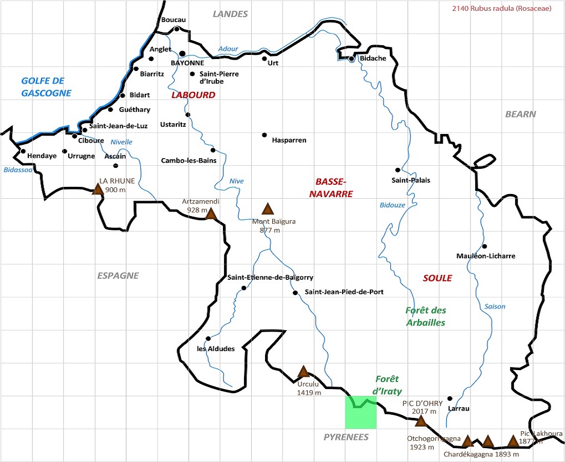 PsPh – 5-20 dm – Tiges anguleuses, aiguillons droits mêlés de glandes courtes, feuilles à 5 folioles blanchâtres dessous, ovales dentées acuminées – Fleurs ± rosées – Drupéoles noires