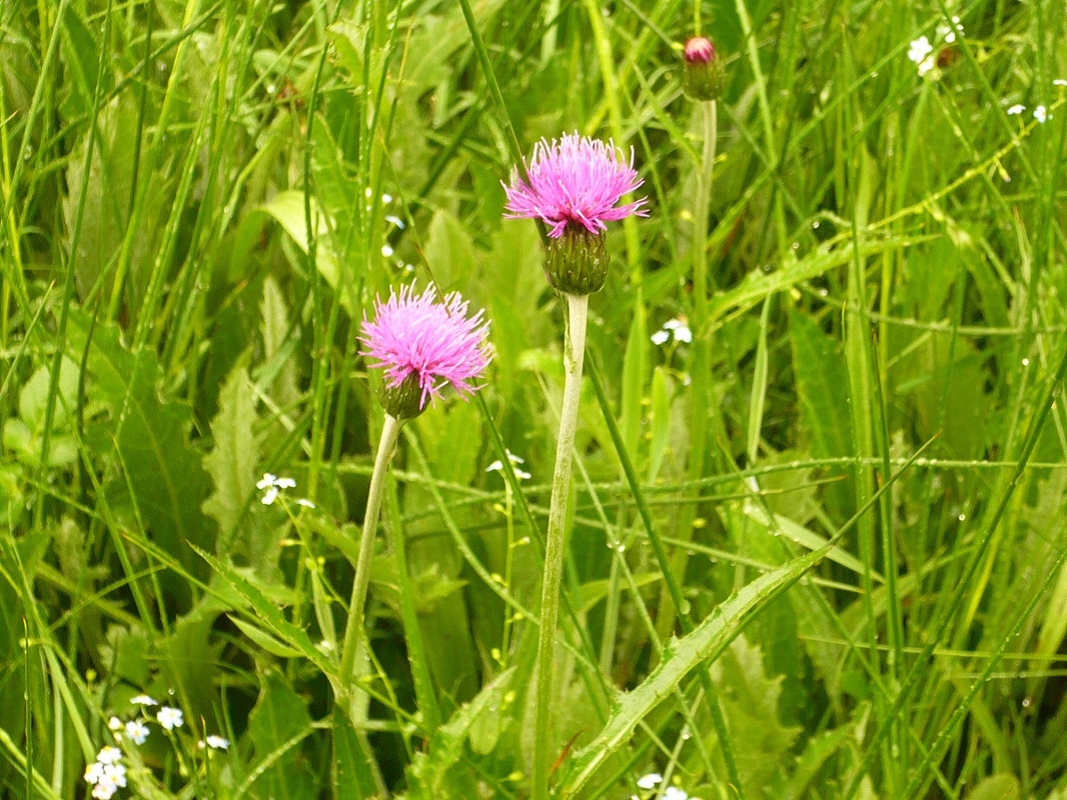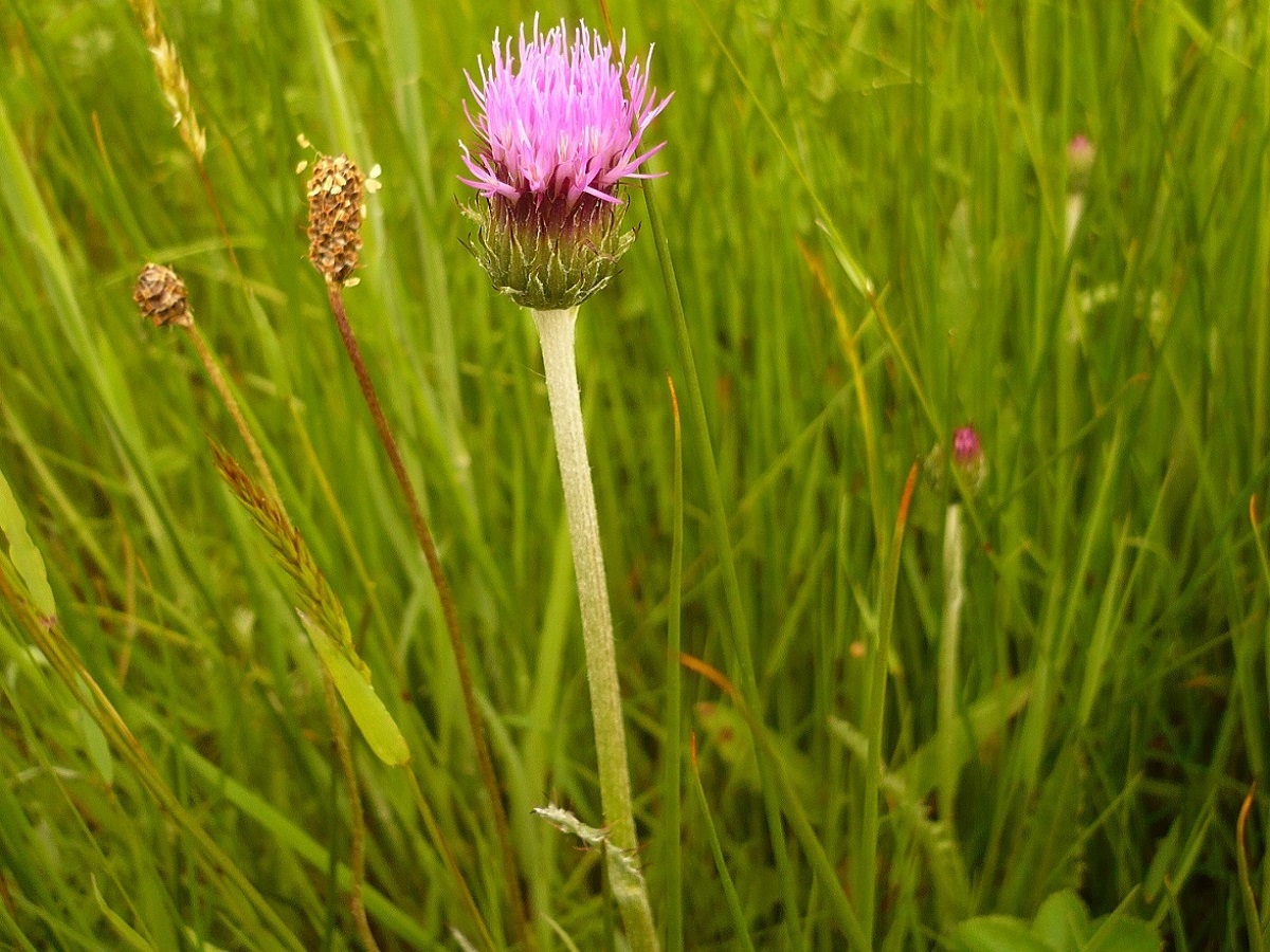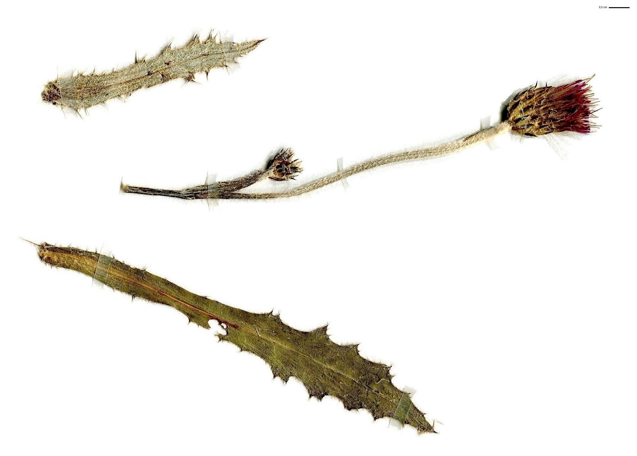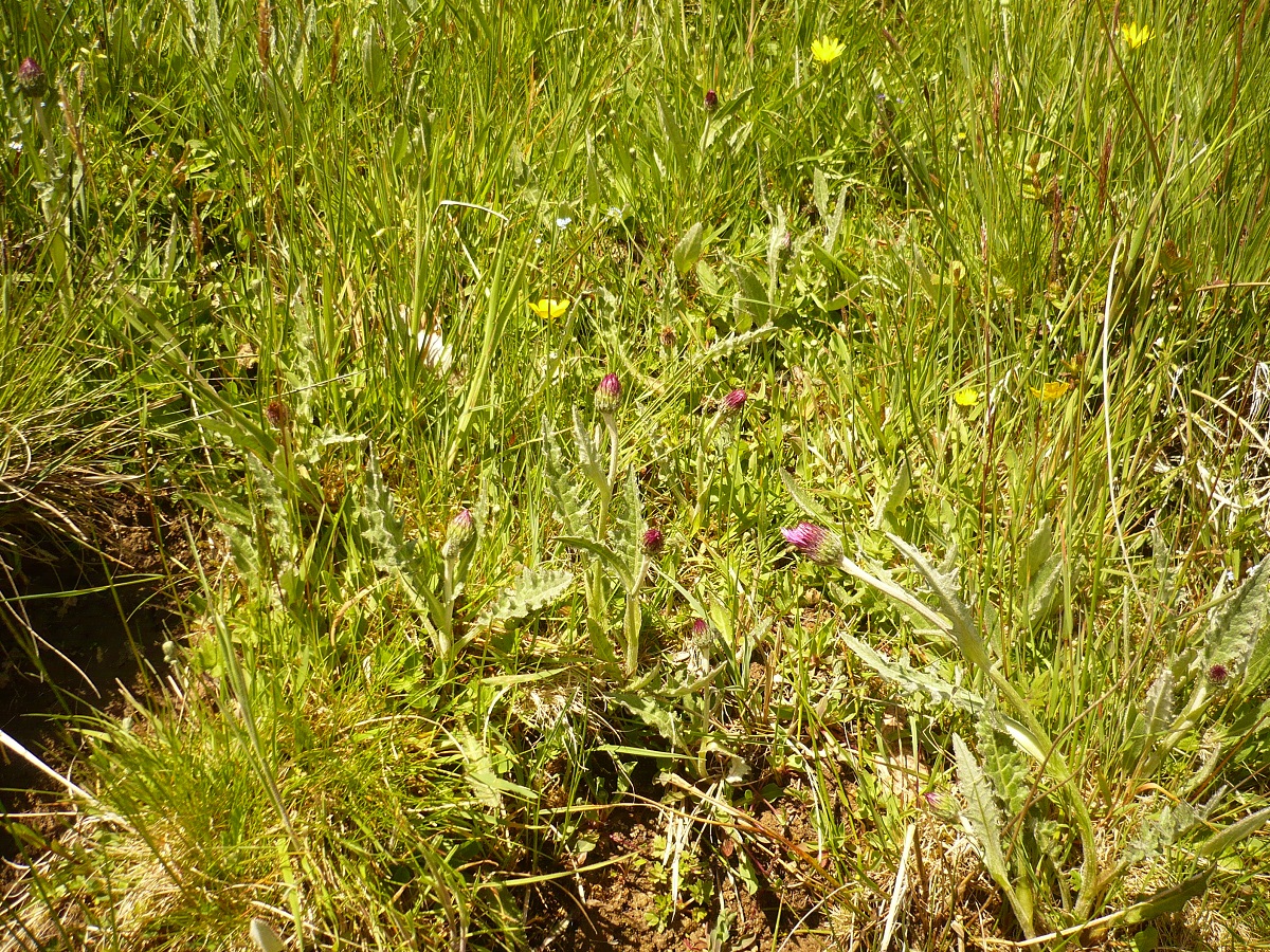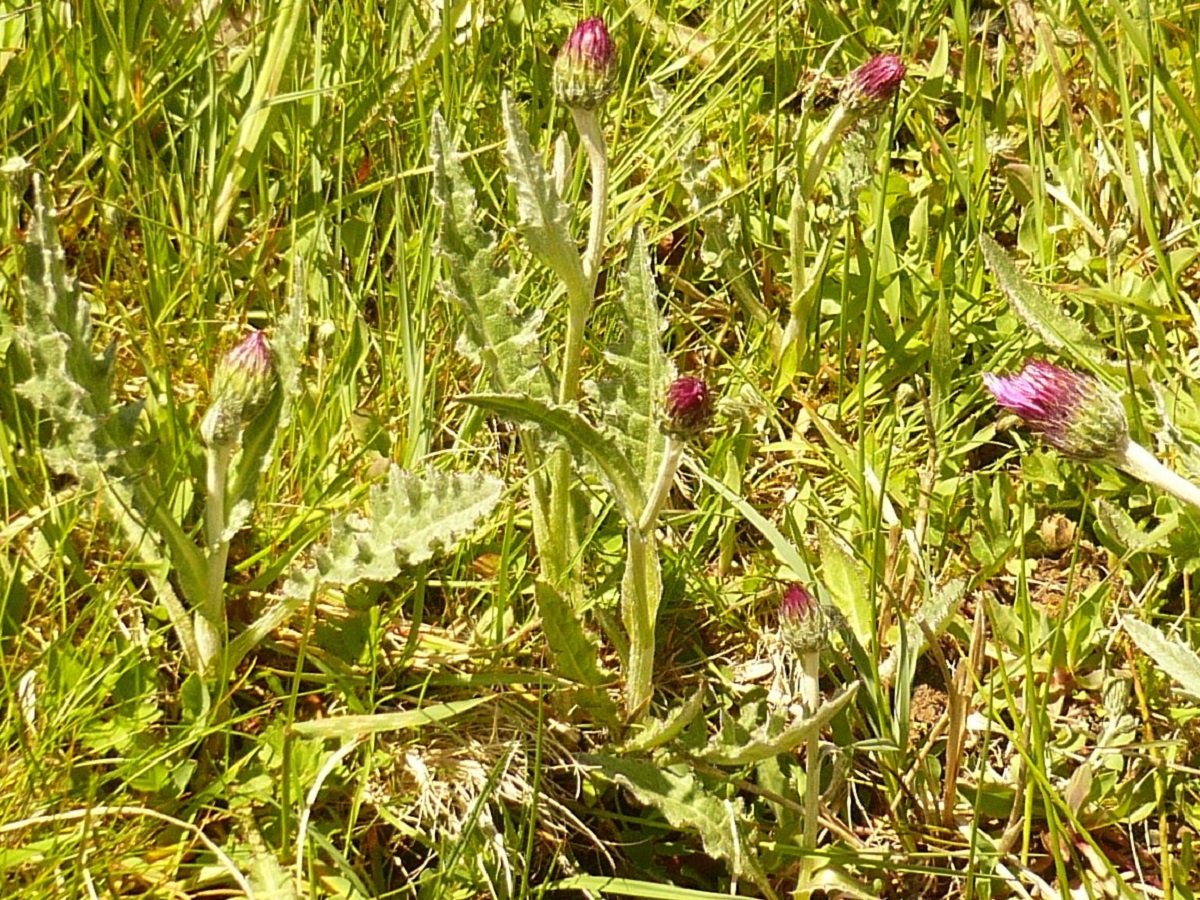 Hc – 4-8 dm – Feuilles planes ± lobées dentées spinuleuses, blanchâtres dessous – Capitules de L 2,5-3 cm, par 1(-3), fleurons pourpres, bractées ± larges, à pointe piquante ± dressée