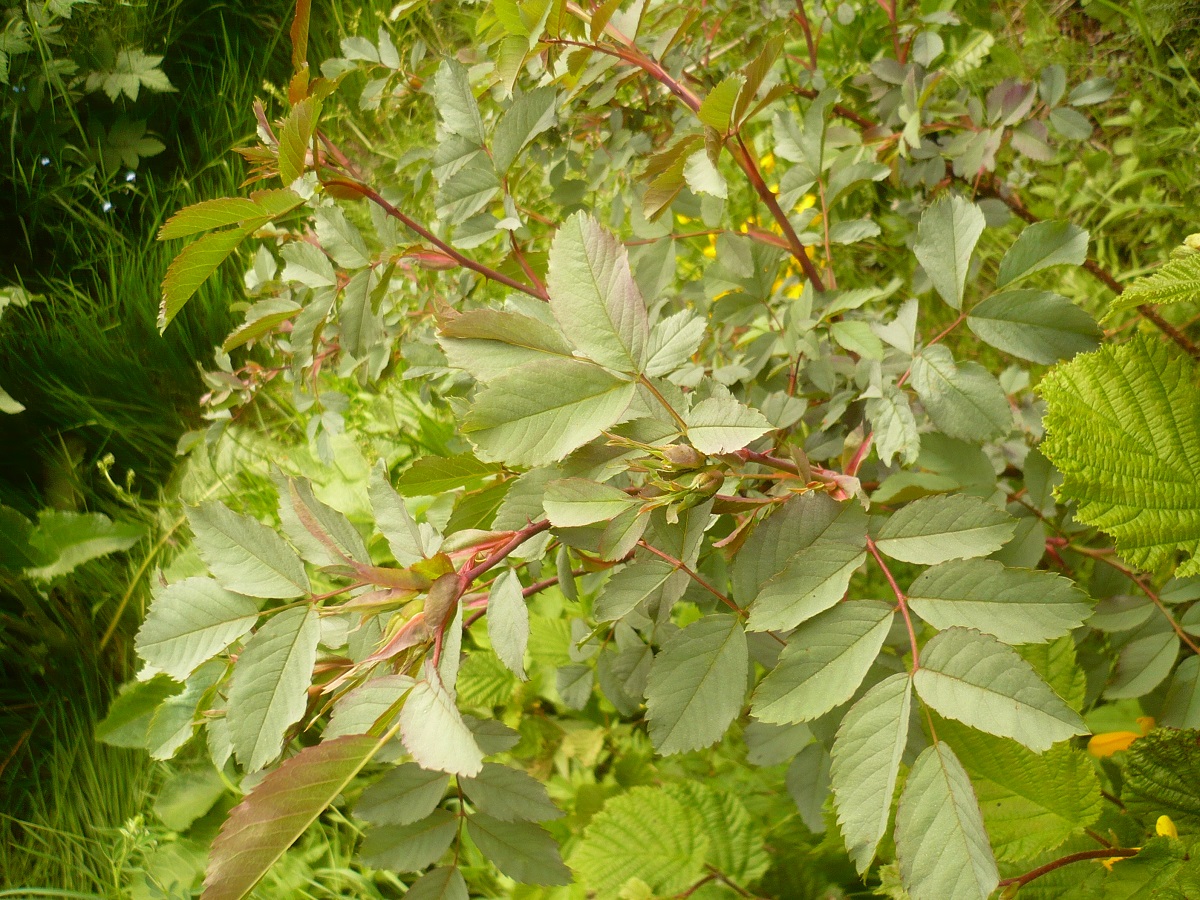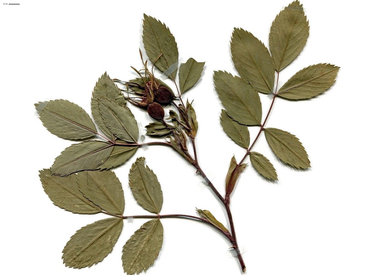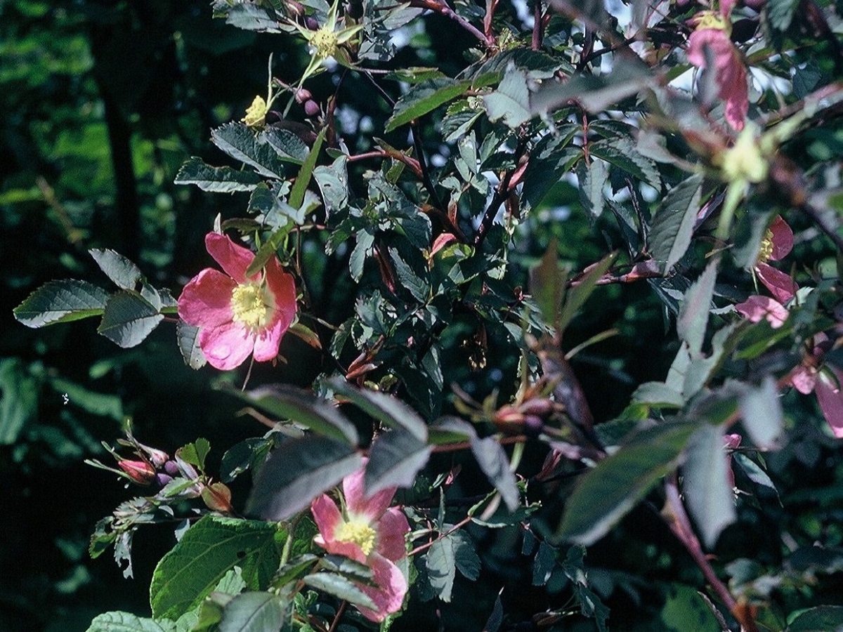 NPh – 1-3 m – Aiguillons inégaux, 5-7 folioles glauques, lavées de pourpre – Fleurs de Ø 3-5 cm rose vif – Sépales étroits dressés sur le ’’fruit’’ rouge ovoïde à pédicelle ± glabre