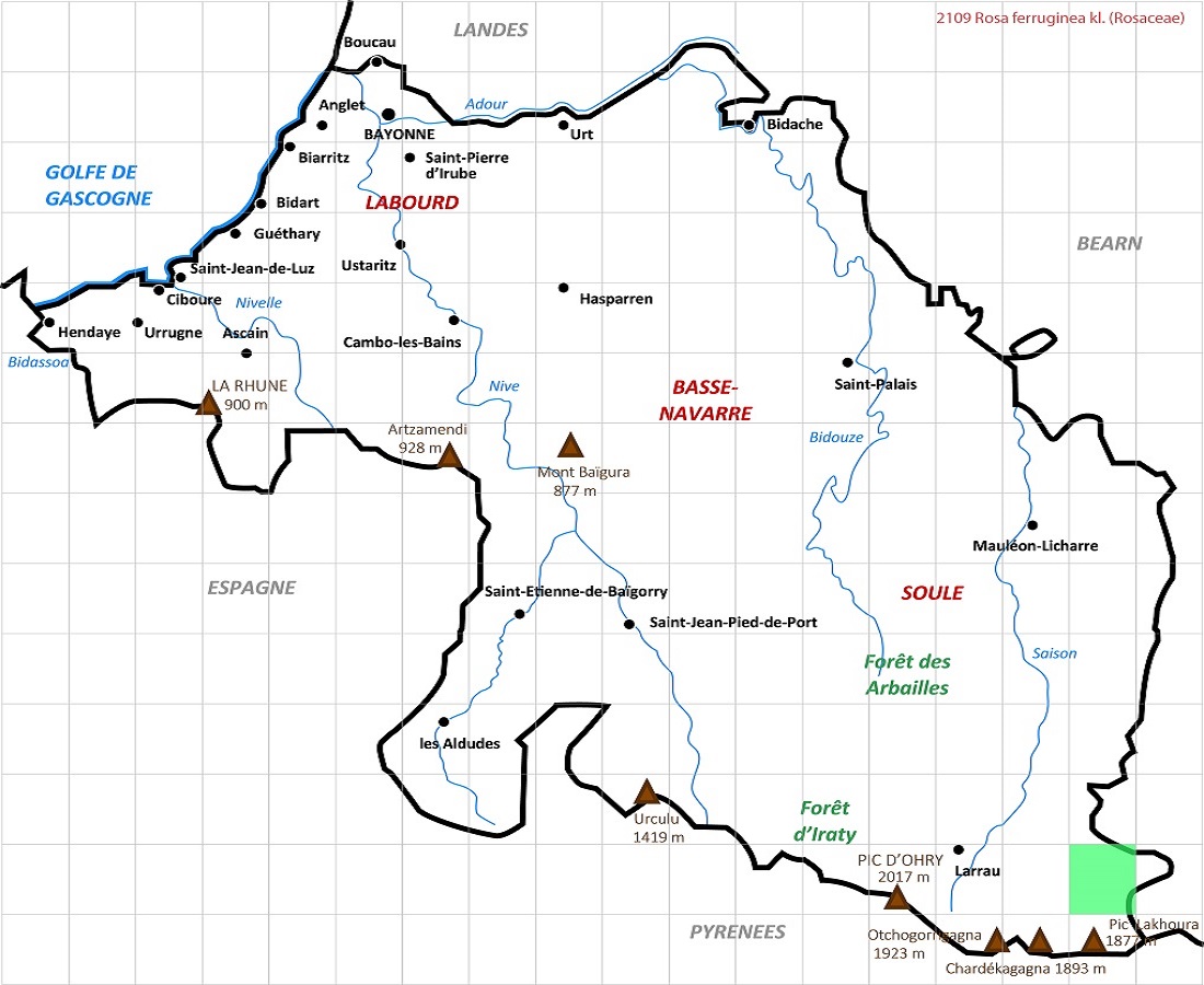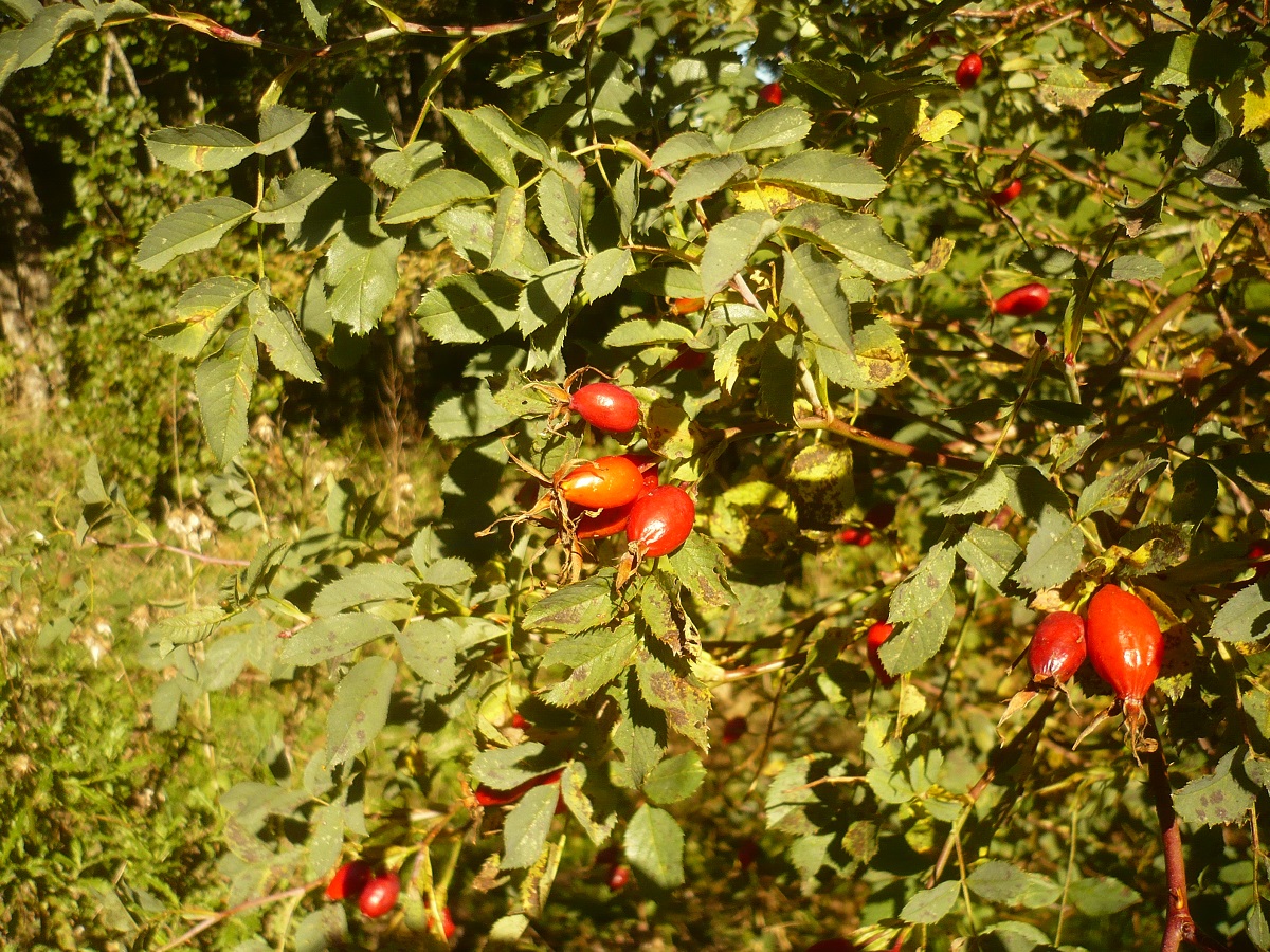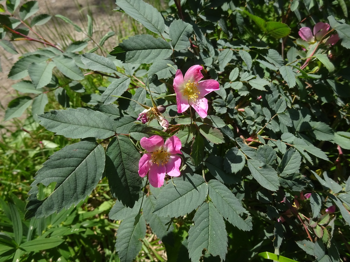 NPh – 1-3 m – Aiguillons inégaux, 5-7 folioles glauques, lavées de pourpre – Fleurs de Ø 3-5 cm rose vif – Sépales étroits dressés sur le ’’fruit’’ rouge ovoïde à pédicelle ± glabre